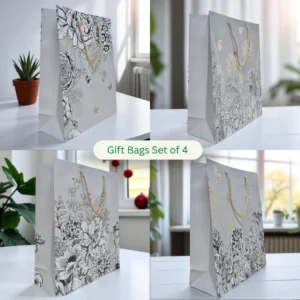 Gray Floral Gift Bags Set – 4 Designs, Medium Size