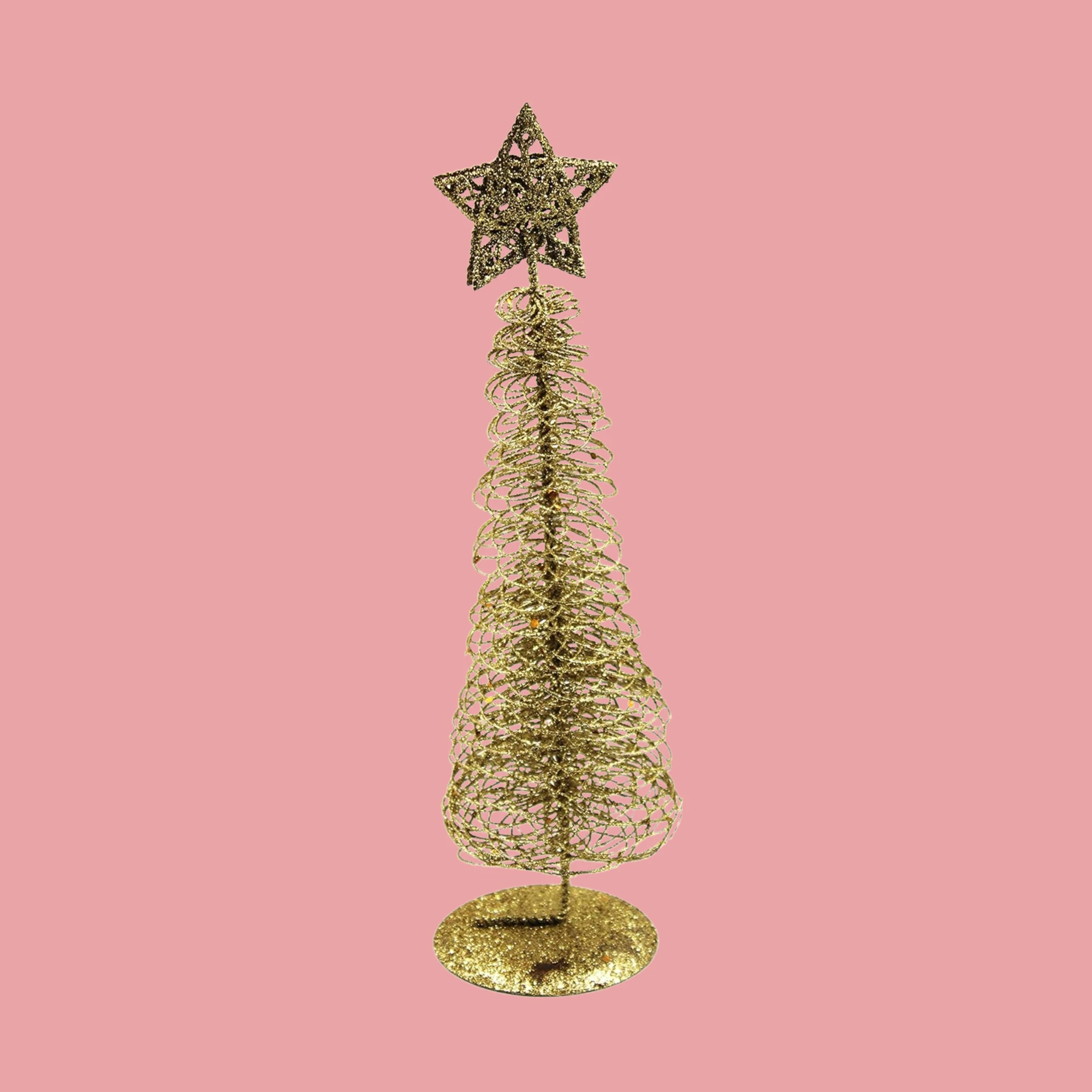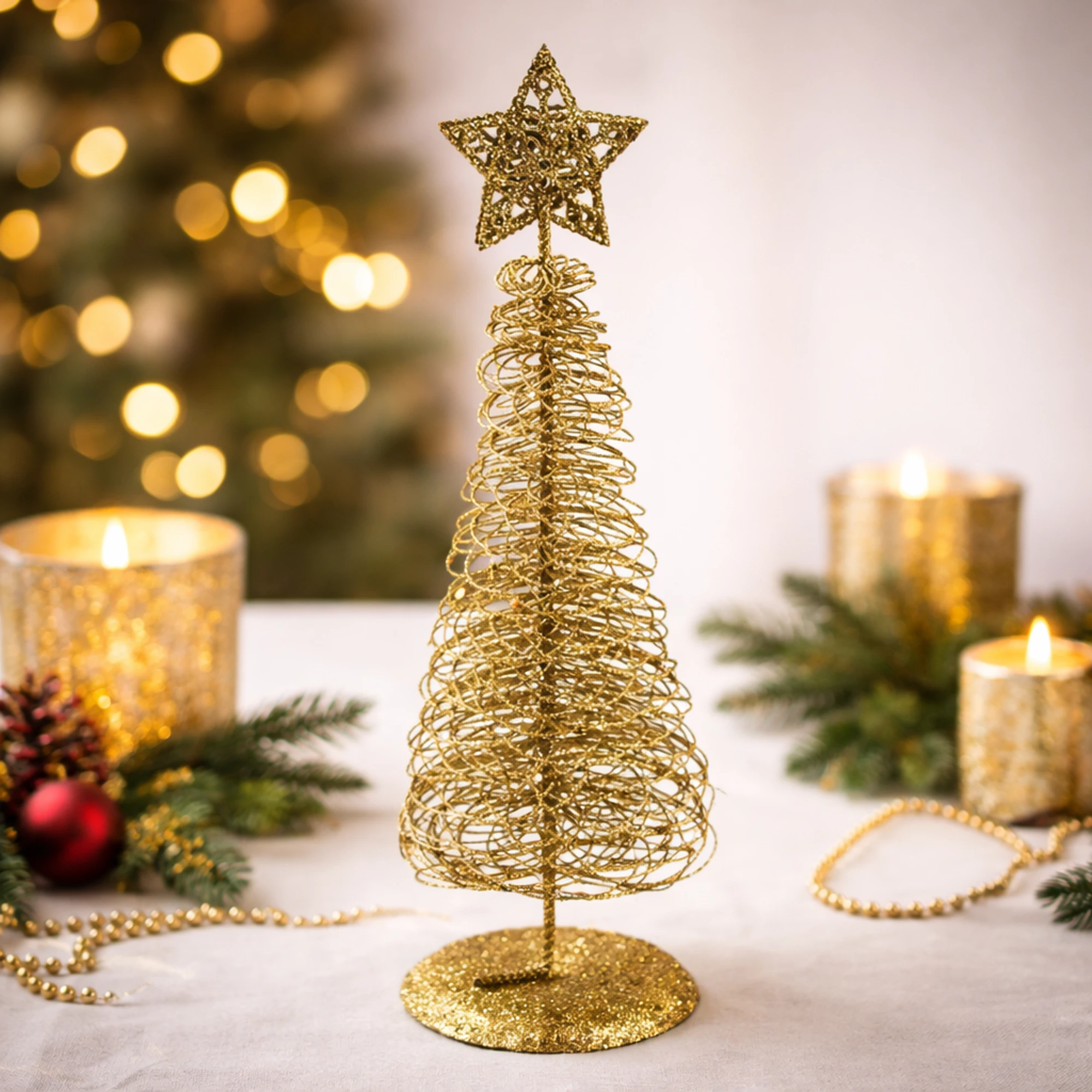 Bring a touch of elegance to your holiday decor with our 11-Inch Golden Metal Christmas Tree. This stunning piece combines simplicity with sophistication, featuring a sleek metal design that gleams with a golden finish. Perfect for setting on your mantel, tabletop, or desk, this tree is a wonderful way to add festive cheer to any room.