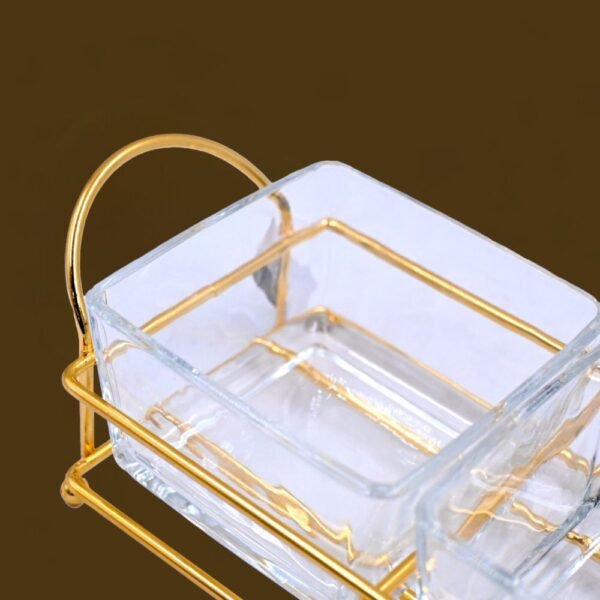 The metal gold stand not only elevates the bowls, giving them a sophisticated look, but also provides stability and support, ensuring that your culinary masterpieces are displayed with style and security. The metallic sheen of the gold perfectly complements the simplicity of the glass, making it a versatile choice for both traditional and contemporary spaces.
