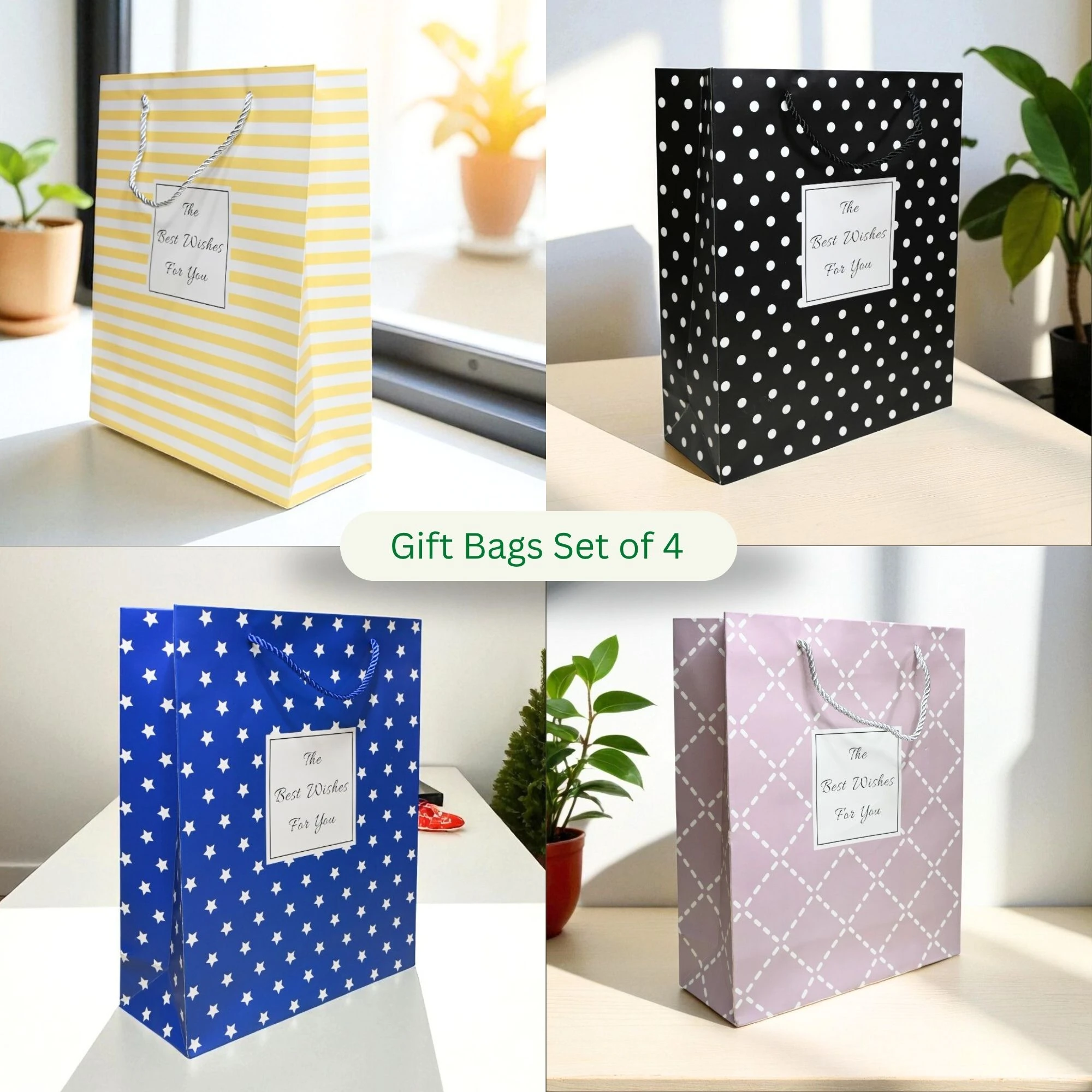 Brighten any occasion with our Best Wishes Paper Bags, a delightful set of four unique designs. These paper bags are perfect for creating memorable gifting experiences with elegance and charm.