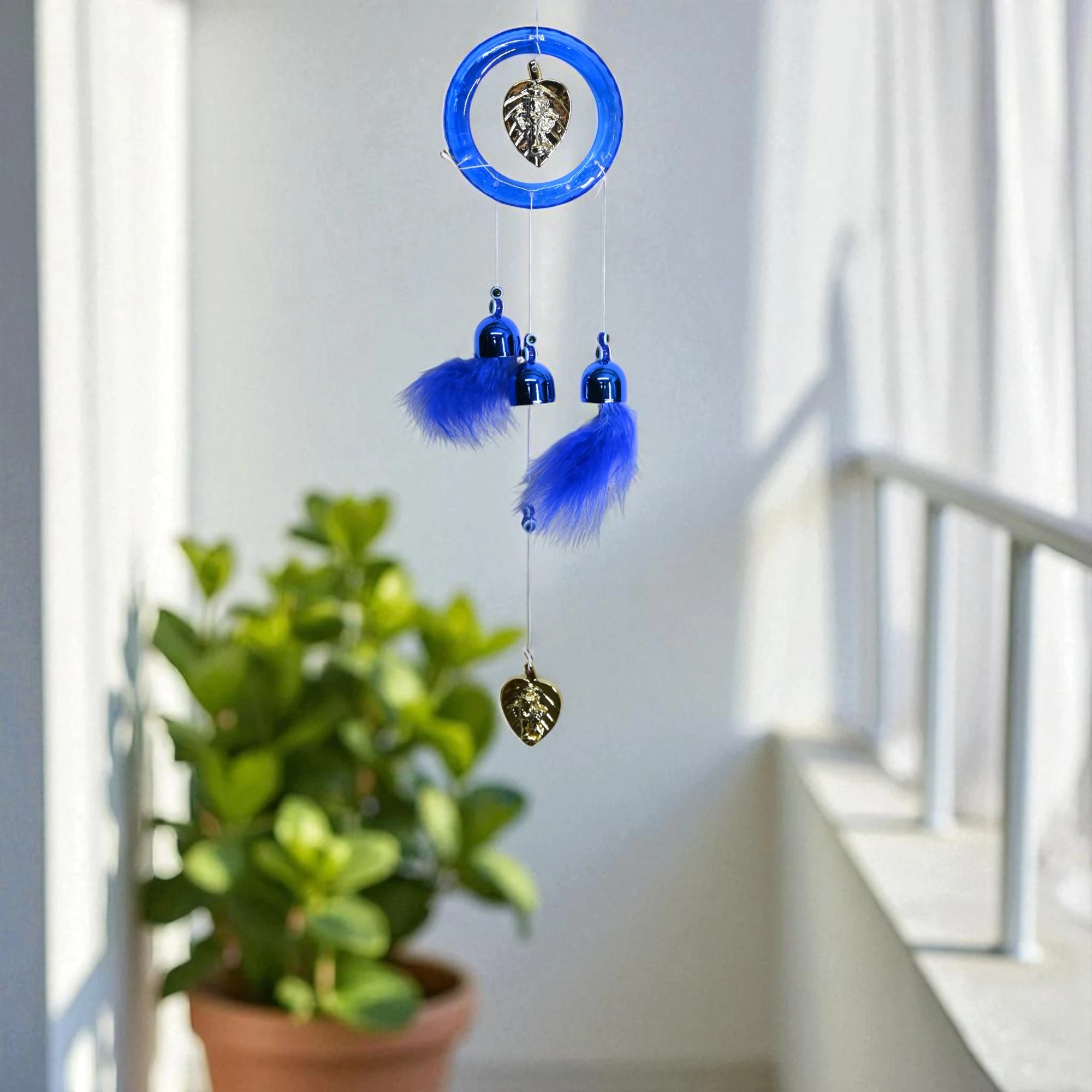 Add a touch of serenity to any space with the Blue Feather Ganapati Wind Chime. This enchanting piece features a delicate Ganapati design intertwined with soothing blue feathers that dance elegantly with the wind.