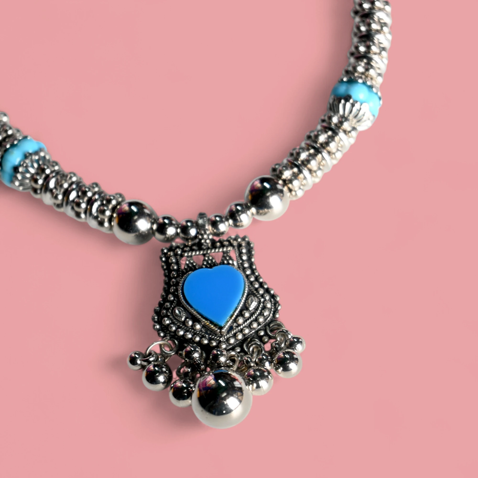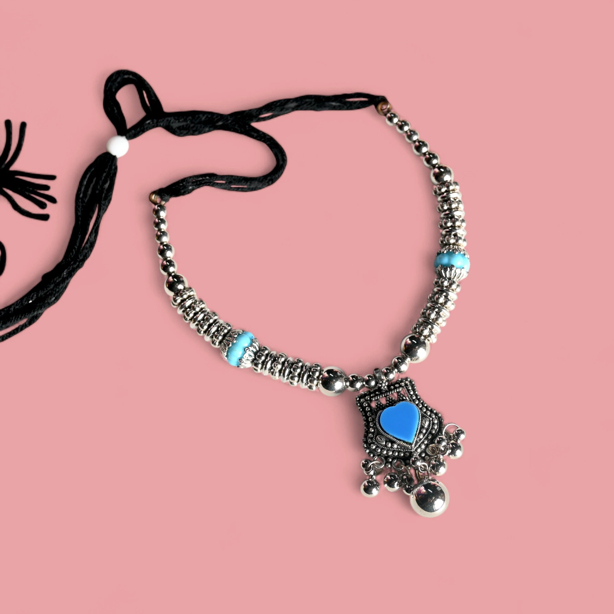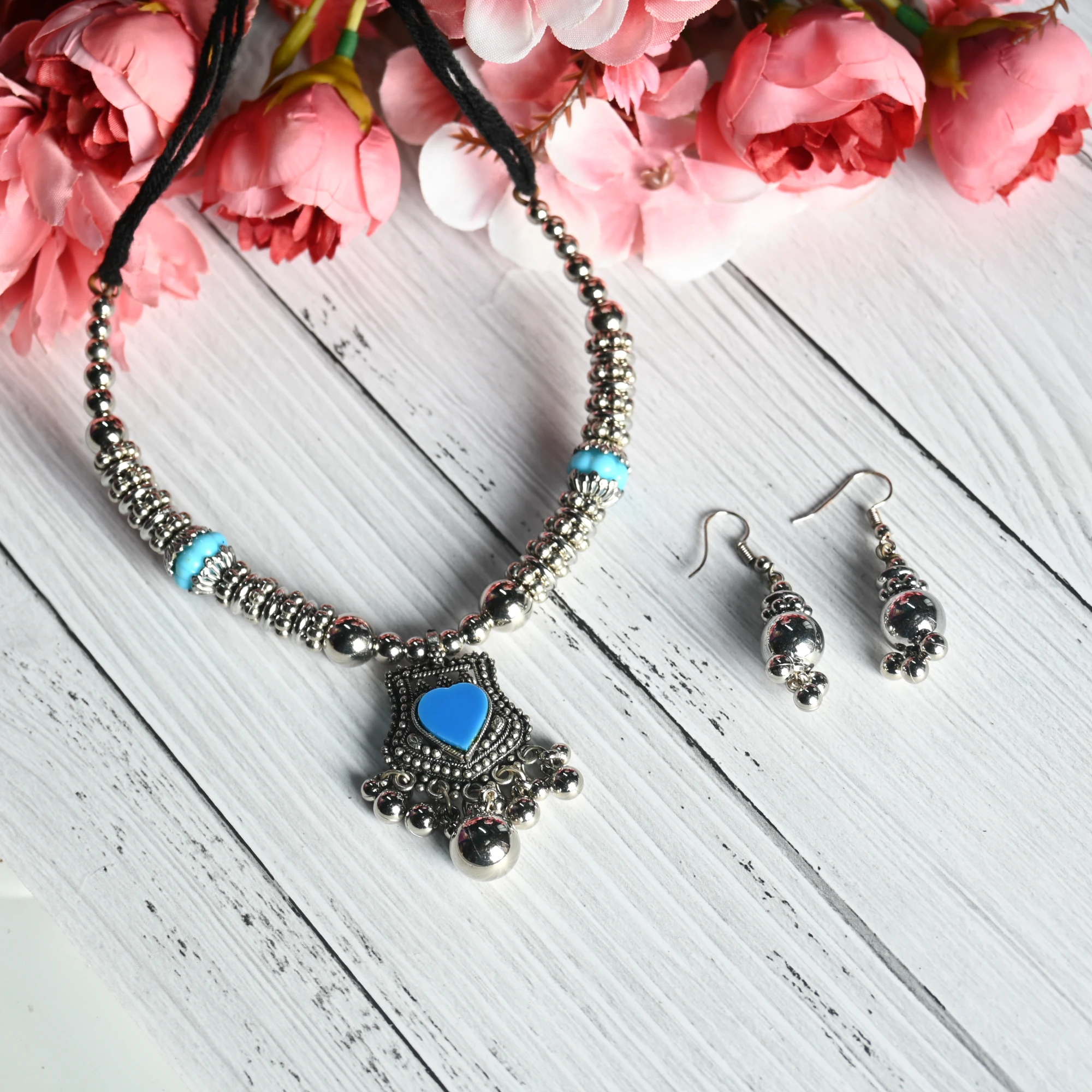 Bring elegance and festive charm to your Navratri celebrations with this beautifully designed Blue Heart Oxidized Navratri Jewelry Set. The necklace features intricate oxidized silver beadwork, enhanced by a striking heart-shaped blue stone at the center, giving it a touch of uniqueness and sophistication. Accented with matching earrings, this set is perfect for Garba nights, dandiya events, and traditional festive gatherings. Its lightweight design ensures comfort while dancing, while the detailed craftsmanship makes it an eye-catching accessory to complement your chaniya cholis, lehengas, or sarees. The blend of antique silver tones with the subtle pop of blue creates a balanced look that is both traditional and stylish, making this jewelry set a must-have for the season. Highlights