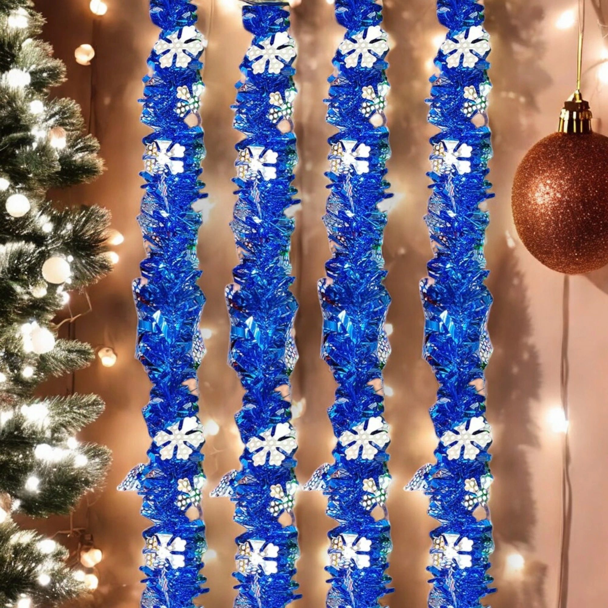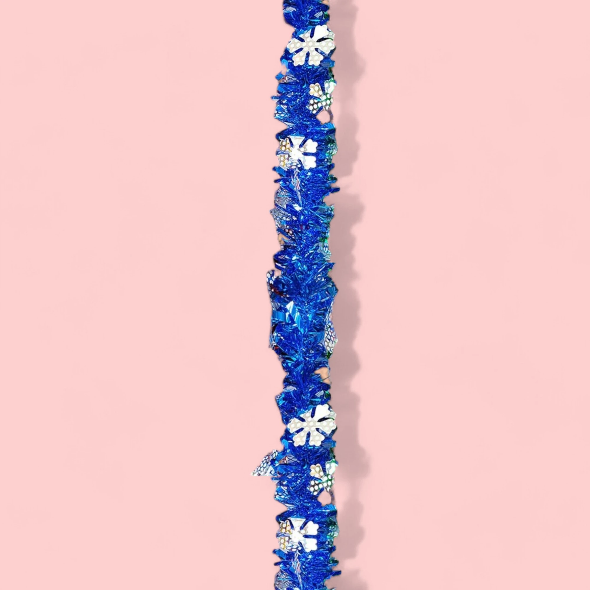The image shows a blue tinsel garland hanging vertically. The garland is shiny and reflective, with small white snowflake decorations scattered throughout. The garland has a festive and glittery appearance, making it ideal for holiday decorations. Its vibrant blue color adds a touch of coolness and elegance to any setting, creating a serene and enchanting atmosphere. This garland is perfect for adding a splash of color and a wintry charm to your holiday decor.