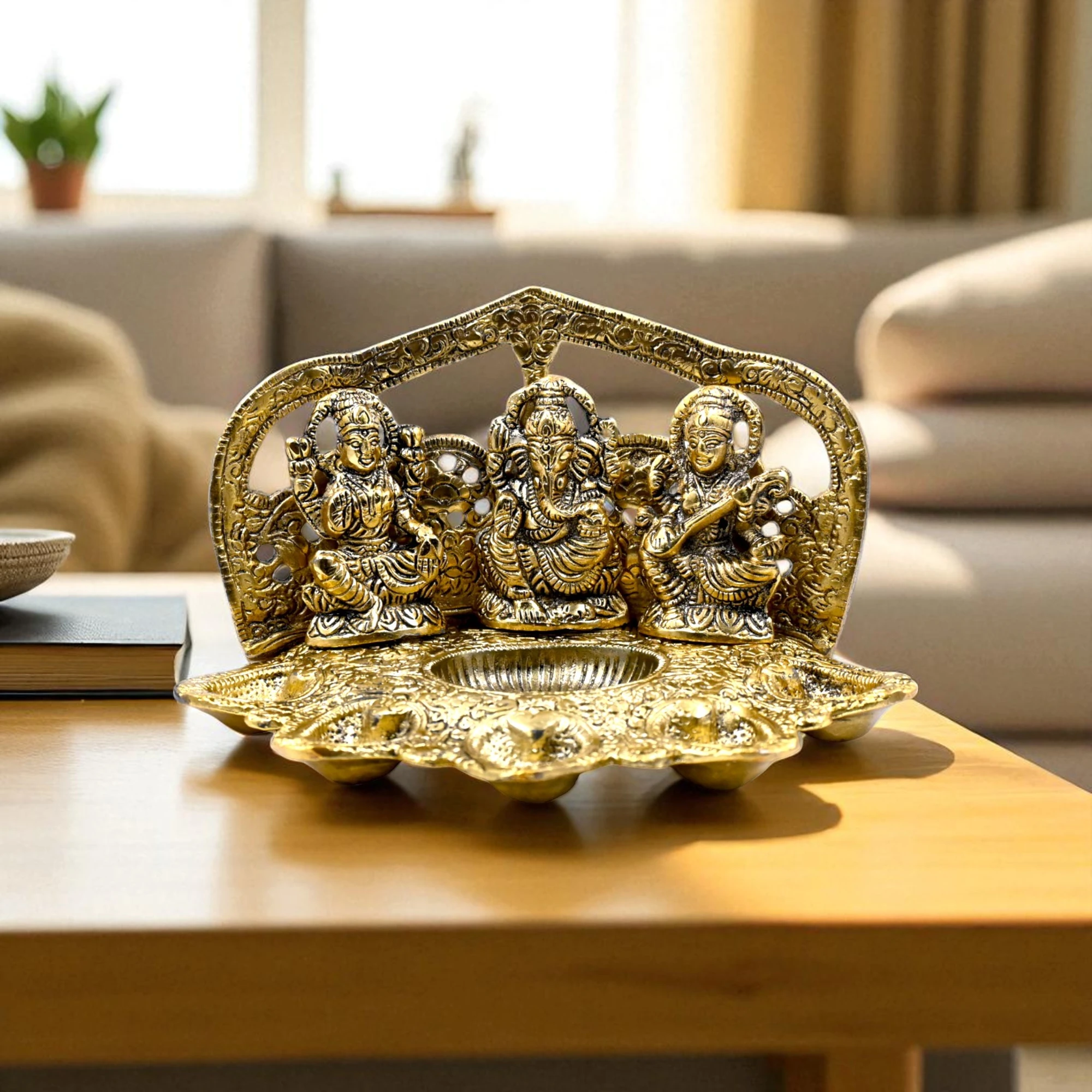 Brass Ganapati Laxmi Saraswati with Diyas