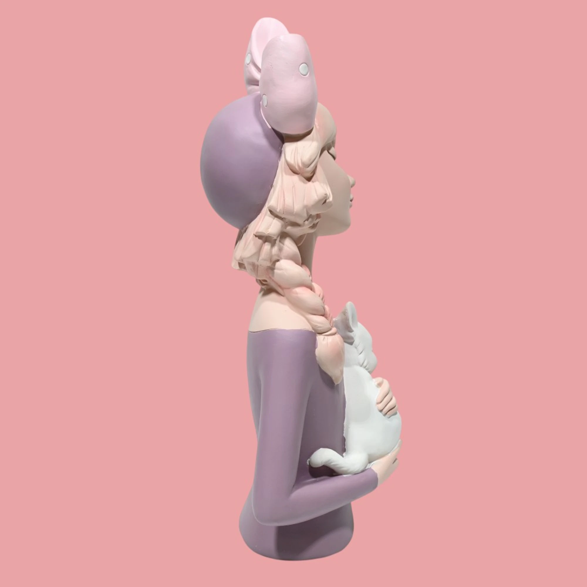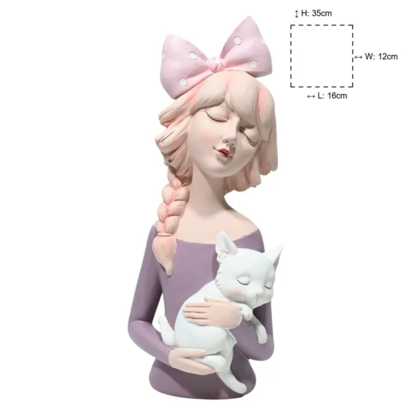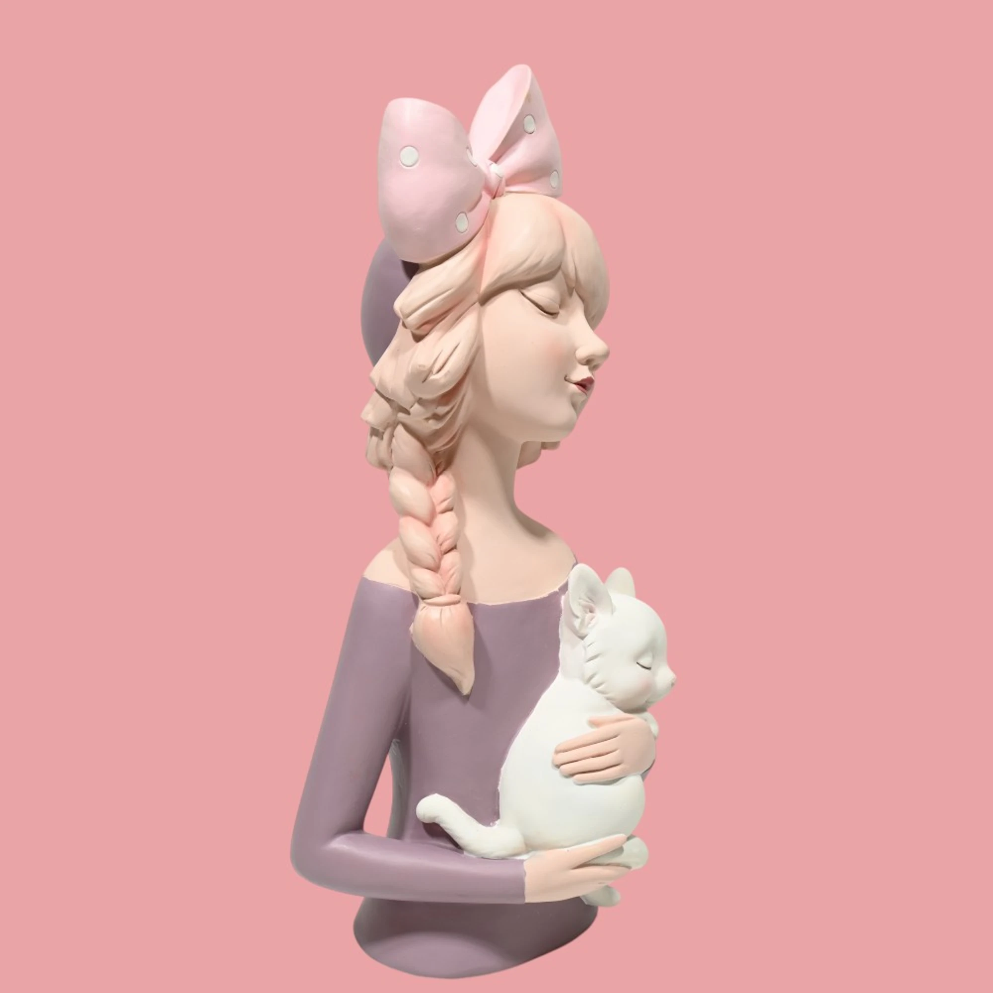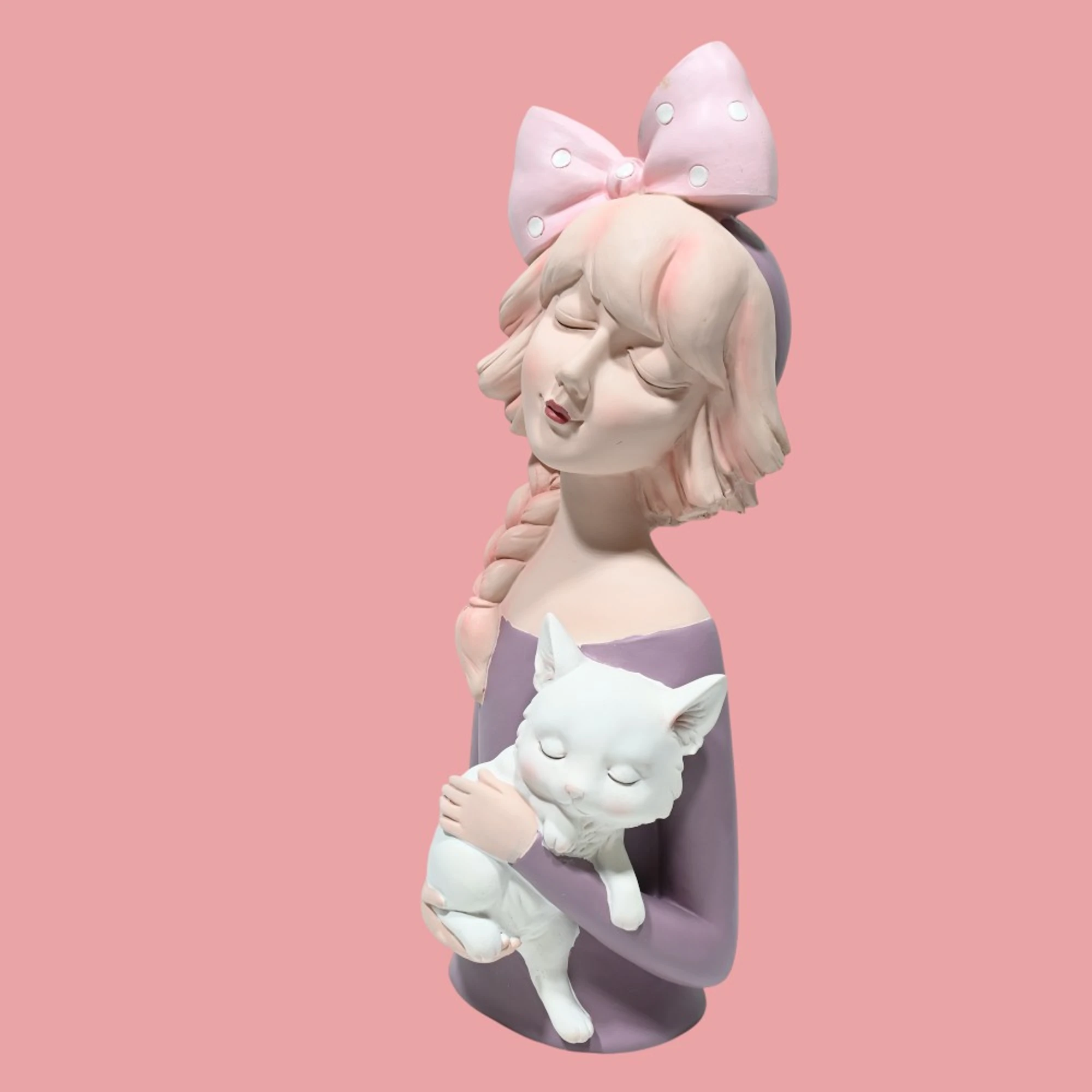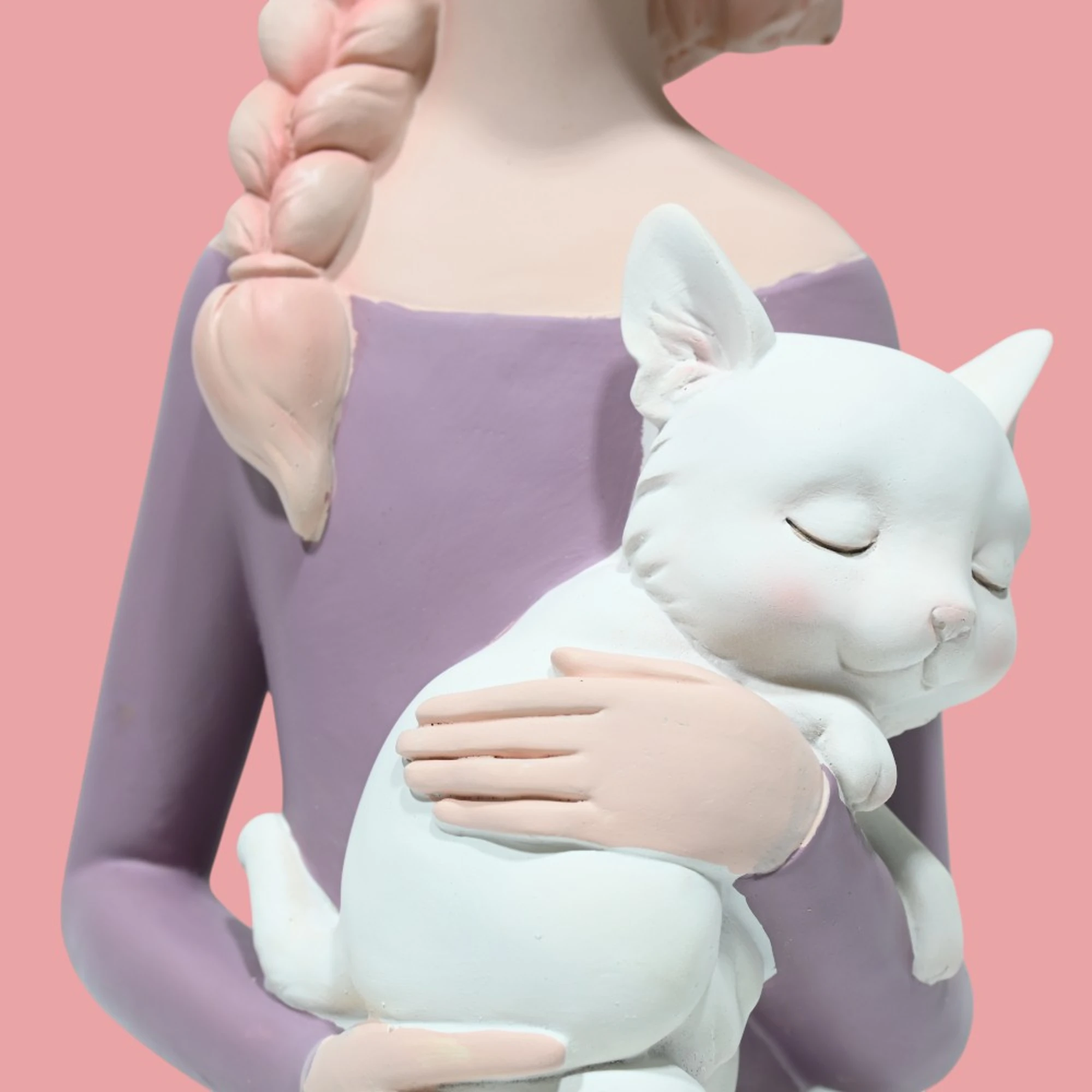 The girl is delicately posed, showcasing a joyful expression while gently holding her companion, a cute cat with an endearing pose of its own. Crafted from durable, high-quality materials, this figurine promises to withstand time while maintaining its exquisite appearance. Its smooth finish and vibrant color are sure to catch the eye and bring a smile to everyone who sees it.