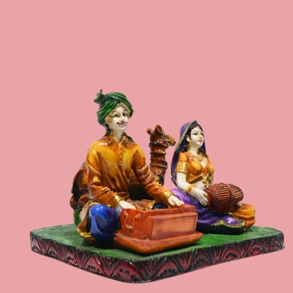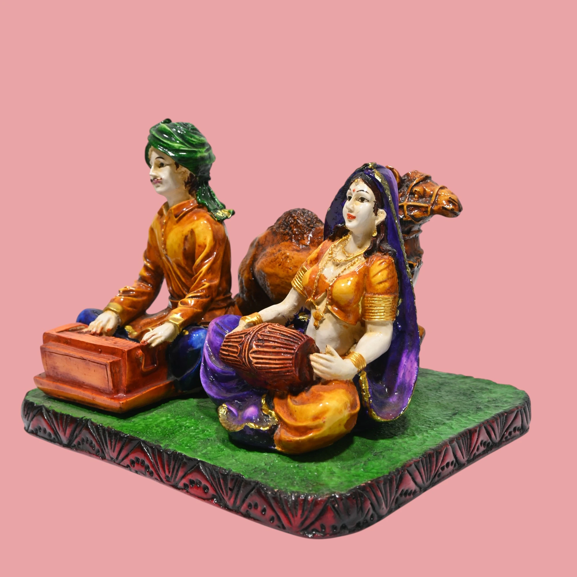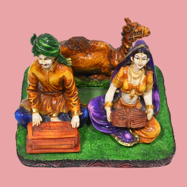 Each element of this statue is thoughtfully designed to reflect fine craftsmanship. The couple is adorned in colorful, intricate clothes that showcase a palette of reds, blues, and golds, creating a visual feast for the eyes. The camel embodies the spirit of Rajasthan’s desert landscape, complete with detailed saddles and reins, exuding both grace and strength.