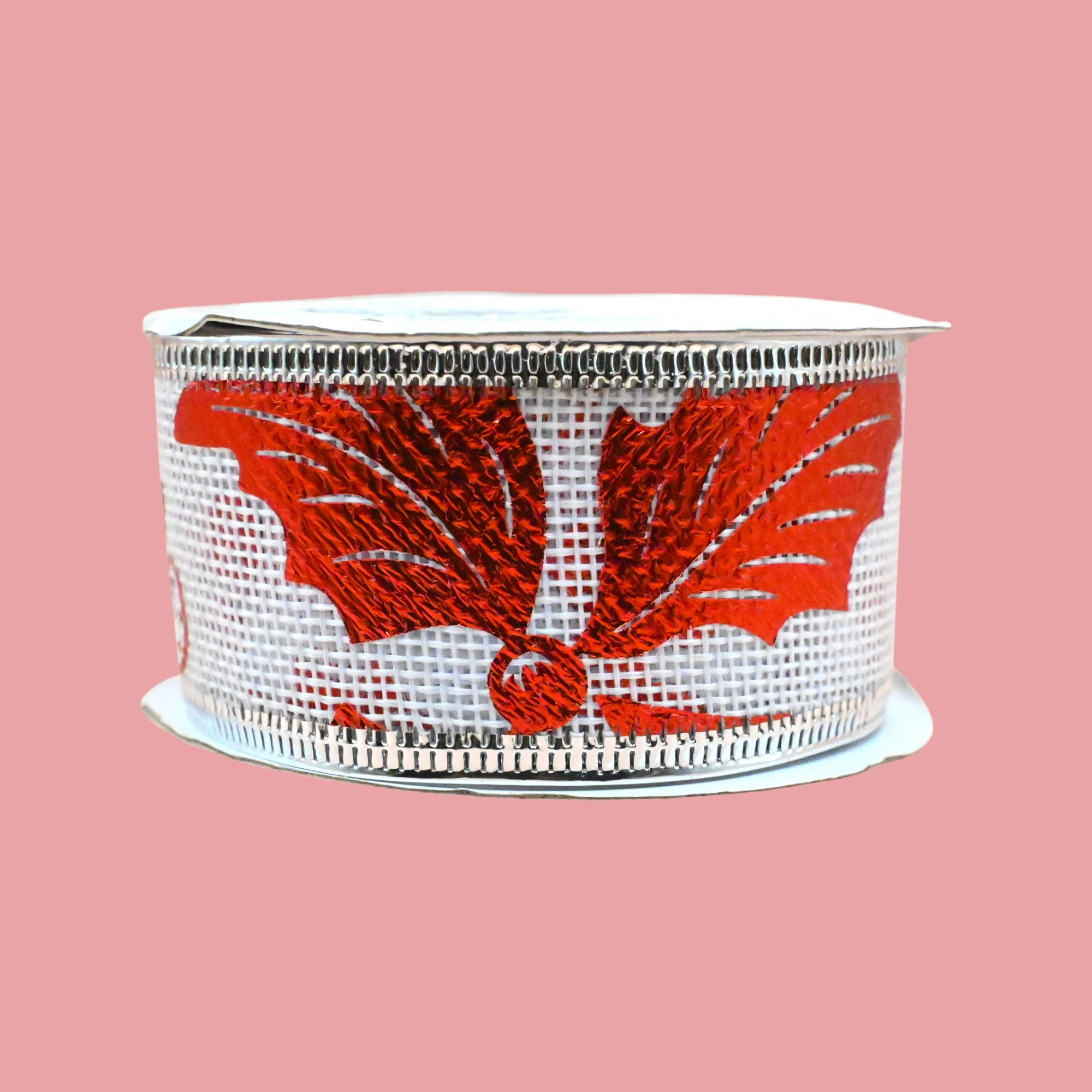 Festive Burlap Ribbon with “Merry Christmas” and Holly Design