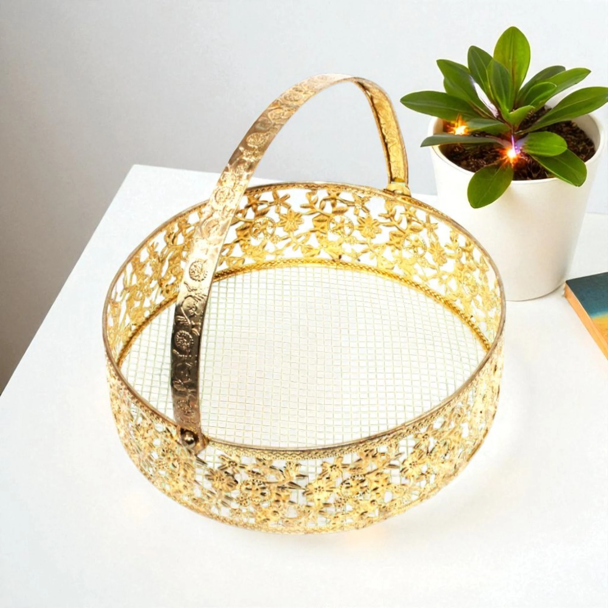 Brighten up your living space with this chic Gold Metal Basket Round Big. Its shimmering finish adds a touch of elegance to any room, while its ample size ensures you can store anything from magazines to cozy blankets.