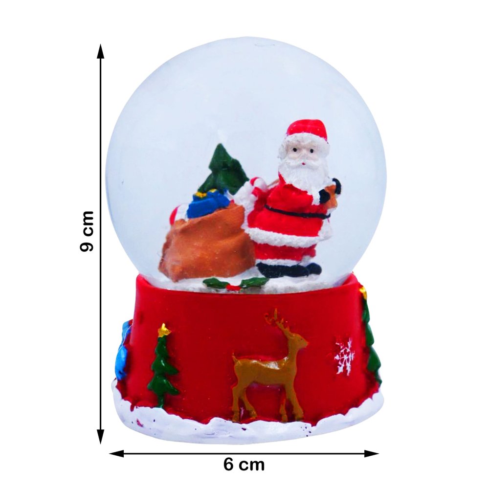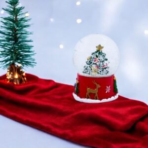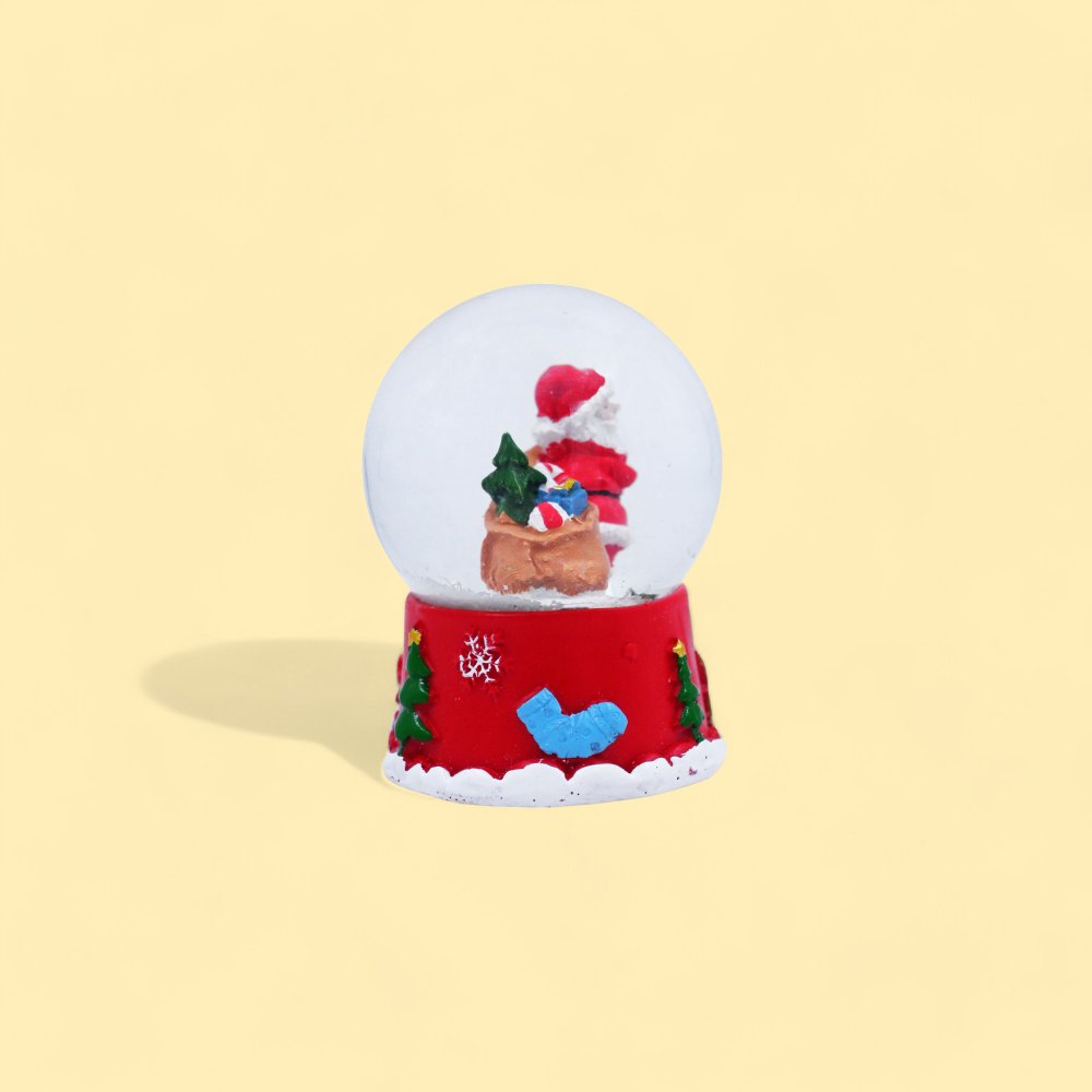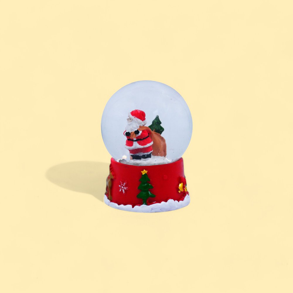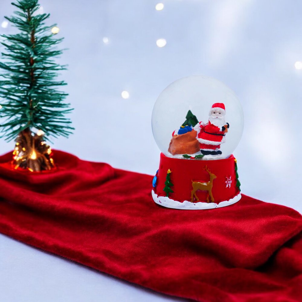 This charming Christmas snow globe features a festive scene with Santa Claus carrying a sack of gifts, set against a backdrop of a decorated Christmas tree. The base of the globe is adorned with holiday-themed decorations, including a reindeer and Christmas trees, all set on a vibrant red background with snowflake accents. Perfect for adding a touch of holiday spirit to any room, this snow globe is a delightful addition to your seasonal decor. Shake it to see the snow gently fall around Santa, creating a magical winter wonderland.