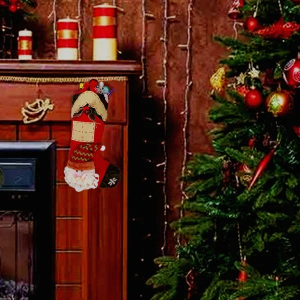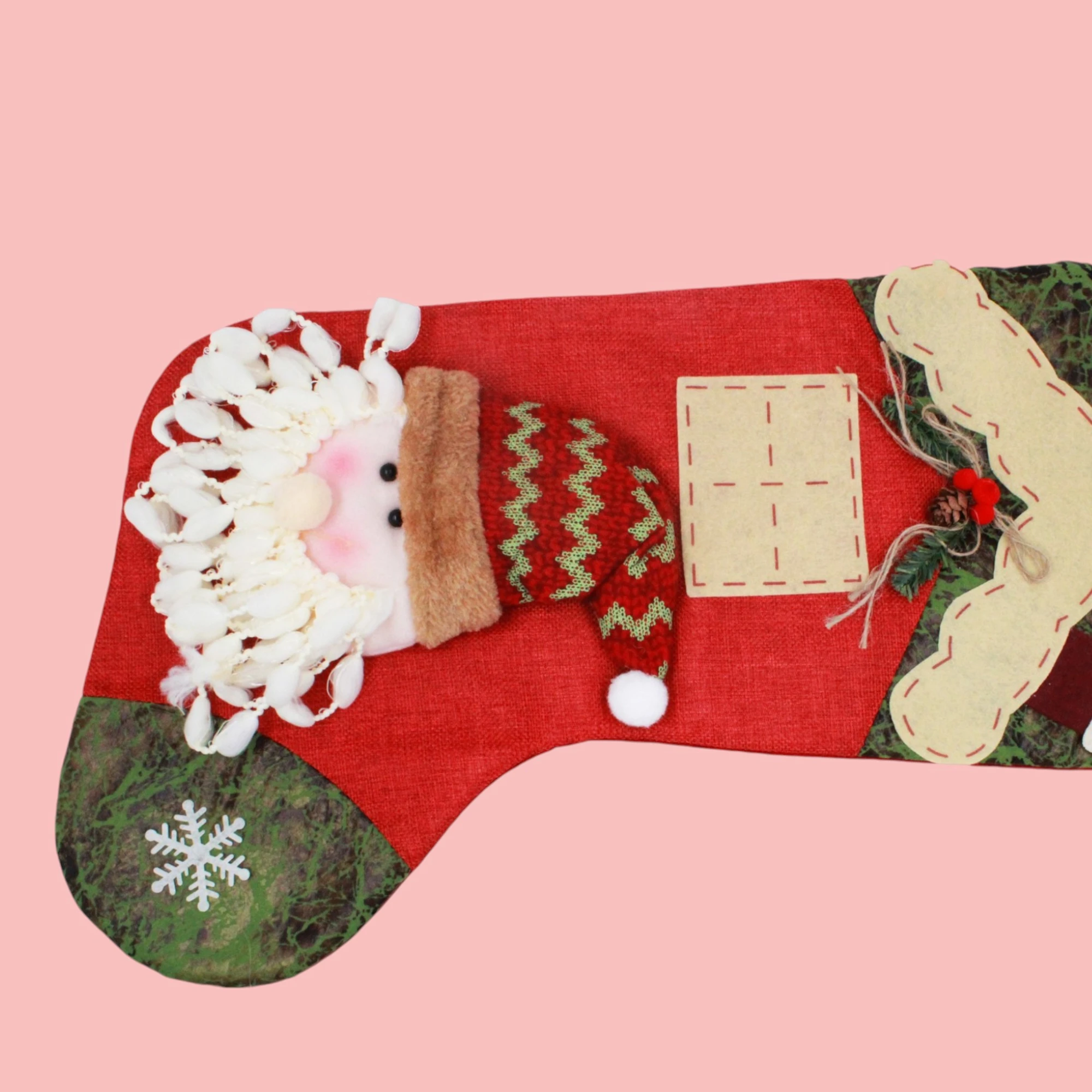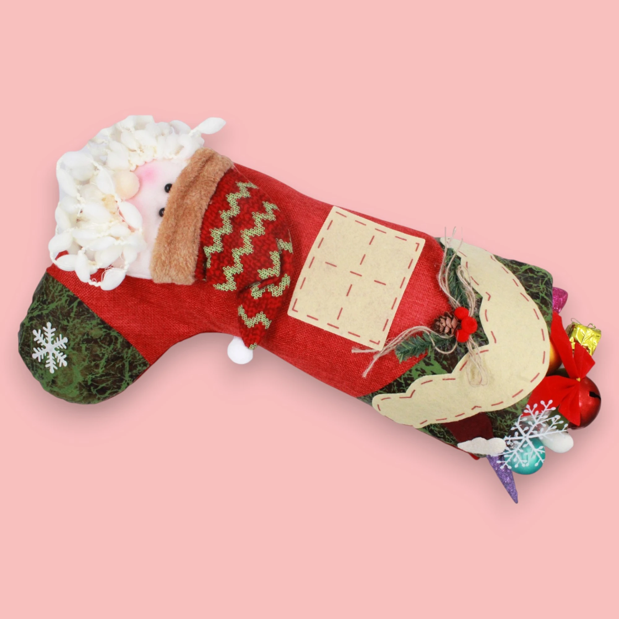 The image features a Christmas stocking designed with a Santa Claus theme. The stocking is predominantly red with green accents at the toe and heel, decorated with white snowflakes. The upper part of the stocking has a plush Santa Claus face with a white beard and a red and green knitted hat. The body of the stocking includes a beige patch with stitched details and a decorative bow with pinecones and red berries. The stocking is filled with various colorful items, including wrapped gifts and ornaments, adding to its festive appearance. This image captures the traditional holiday spirit and the joy of Christmas decorations.