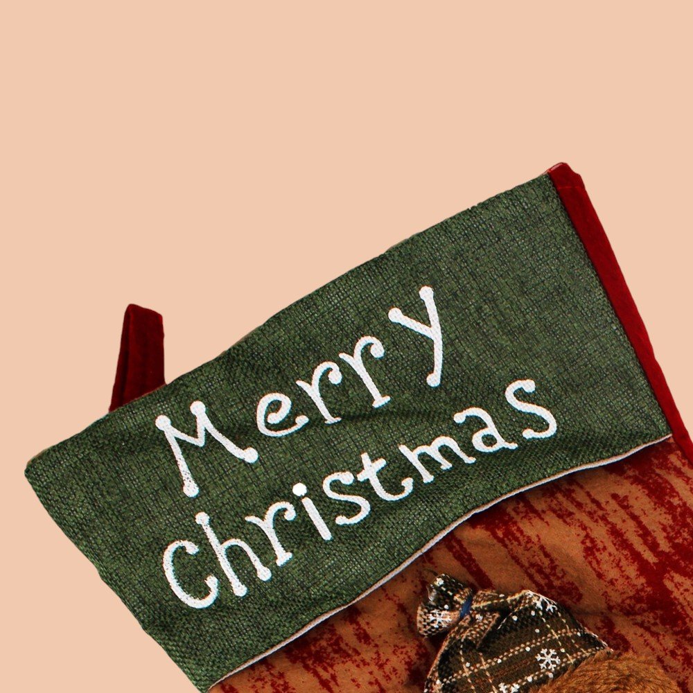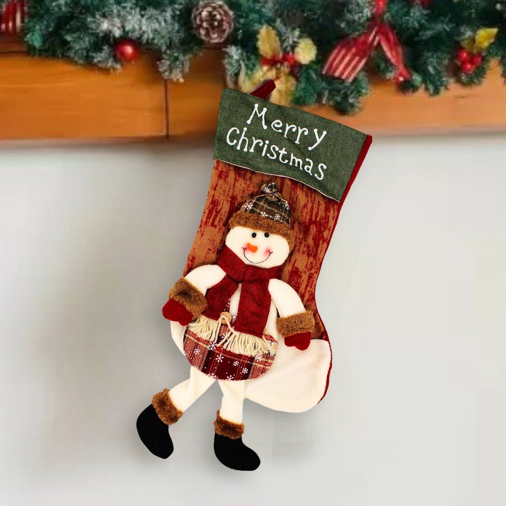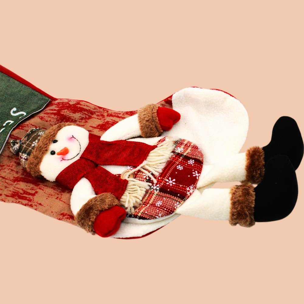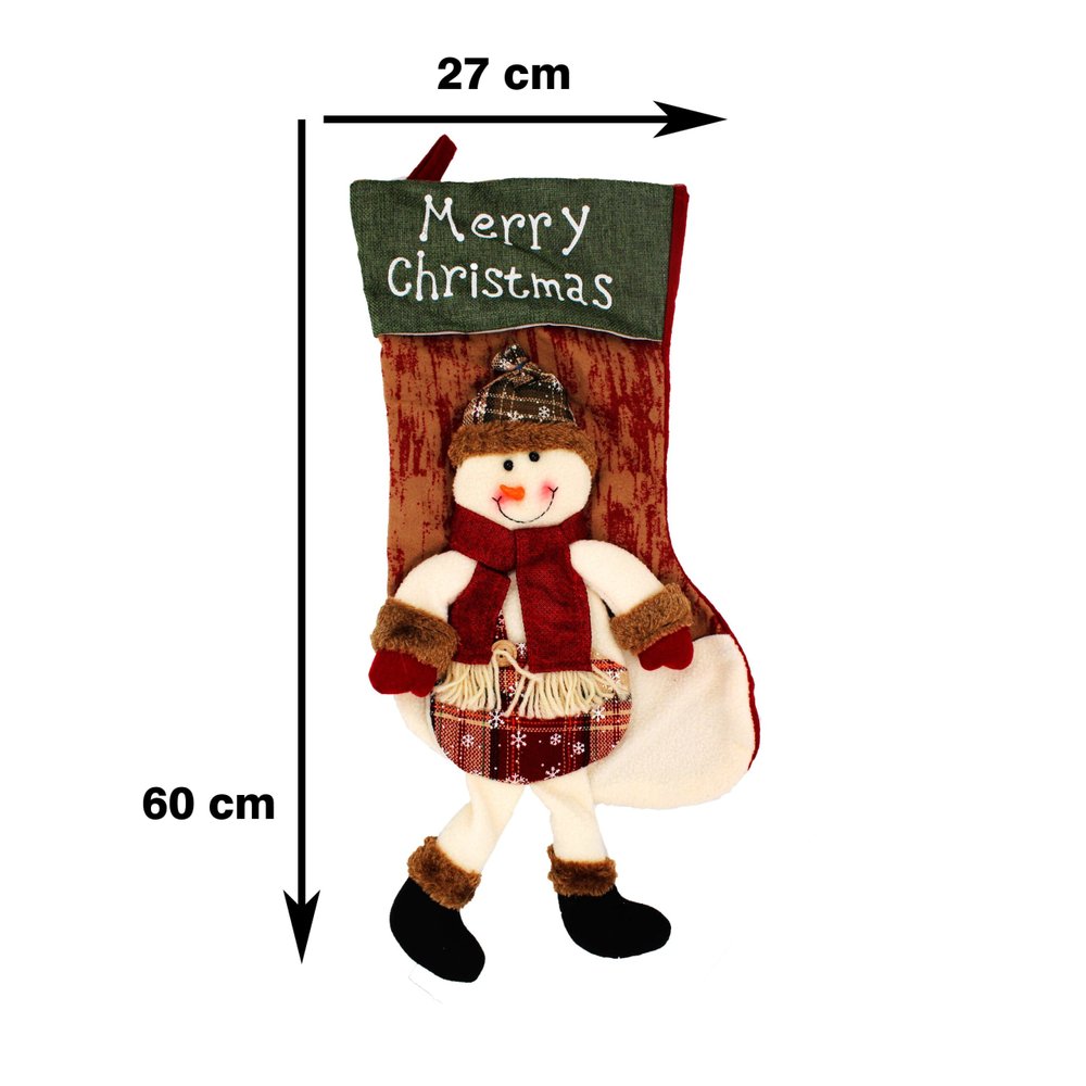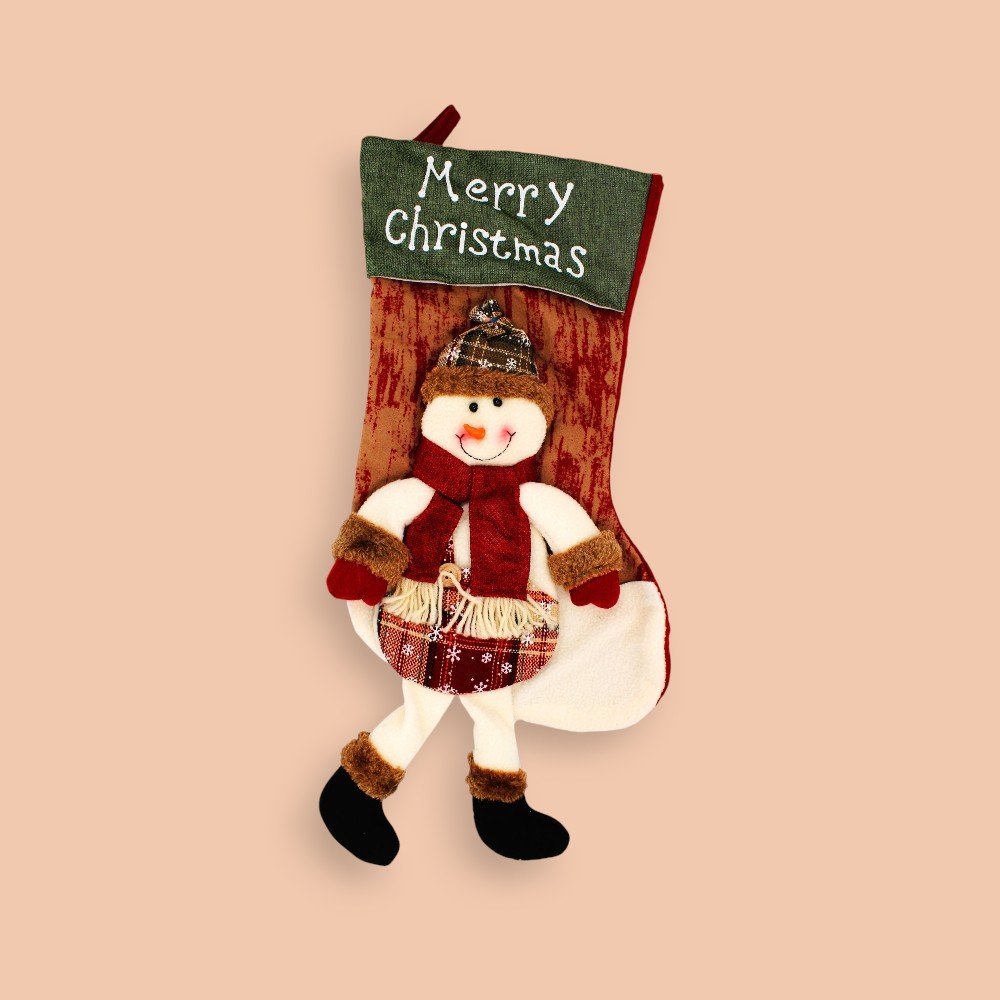 The image shows a festive Christmas stocking designed with a snowman decoration. The stocking is primarily red with a green top section that has the words “Merry Christmas” written in white. The snowman is adorned with a brown hat, red scarf, and plaid skirt, and has a cheerful expression with rosy cheeks. The snowman also has brown mittens and black boots, adding to the holiday theme. This stocking embodies the traditional Christmas spirit and is likely used for holding small gifts or treats during the holiday season.