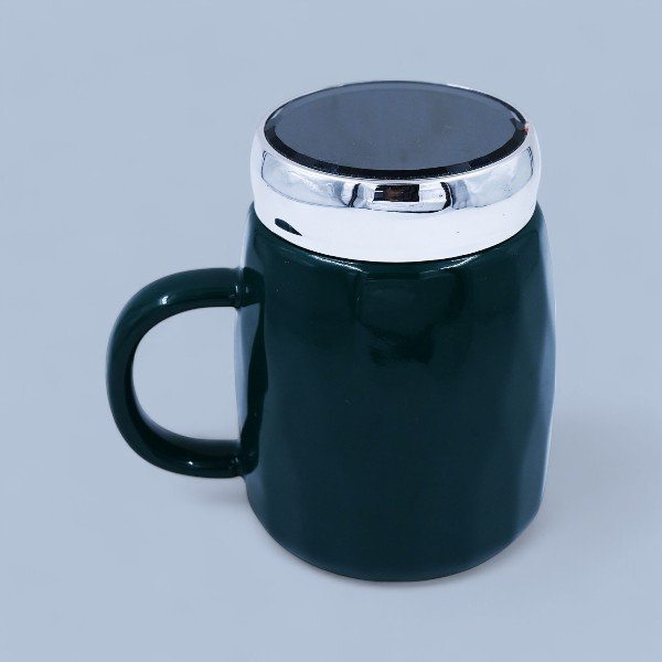 The image shows a Christmas-themed mug with a Santa Claus design. The mug is dark green with a handle on the right side. The front of the mug features a cheerful Santa Claus face with a red hat, white beard, and red nose. Surrounding Santa are small decorative elements like stars and gingerbread men. The mug has a shiny, metallic lid on top. In the background, there is a blurred Christmas tree with lights and ornaments, adding to the festive atmosphere. A cozy, light-colored blanket is also visible, enhancing the warm and holiday-themed setting. The text on the mug reads “Merry Christmas HAPPY GIFT.”
