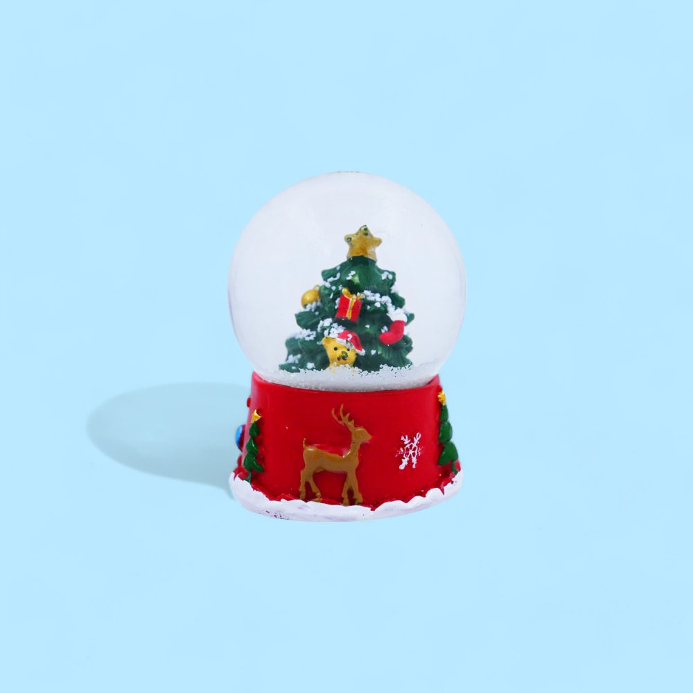 This charming Christmas Tree Snow Globe features a festive scene encapsulated in a clear glass dome. Inside, a beautifully decorated Christmas tree stands adorned with golden ornaments and surrounded by gifts and a small teddy bear. The base of the snow globe is painted in a vibrant red and decorated with holiday-themed elements, including a blue stocking, a green Christmas tree, and a white snowflake. This delightful snow globe is perfect for adding a touch of holiday spirit to any room or as a thoughtful gift for loved ones during the festive season.
