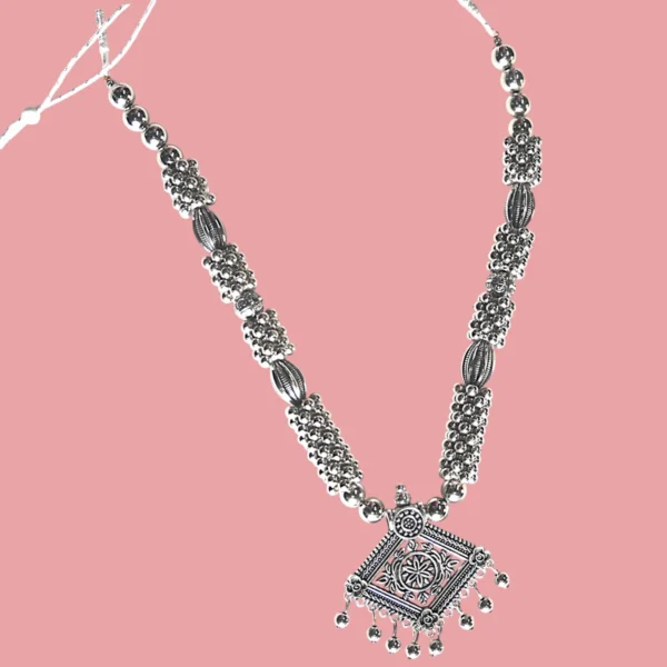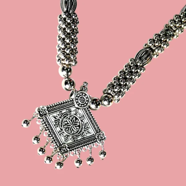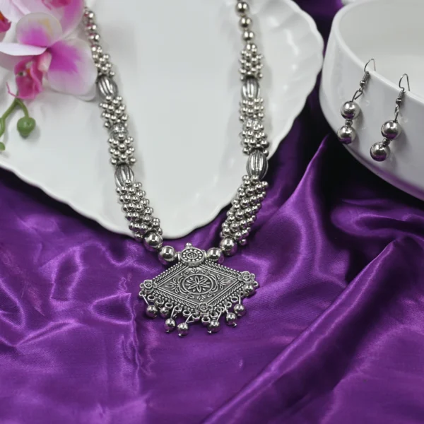 Add a touch of elegance to your jewelry collection with this stunning Diamond Shaped Metal Pendant Silver Beads Necklace and Earring Set. Perfect for both casual and formal occasions, this beautiful set sparkles and shines, ensuring you stand out in any crowd.