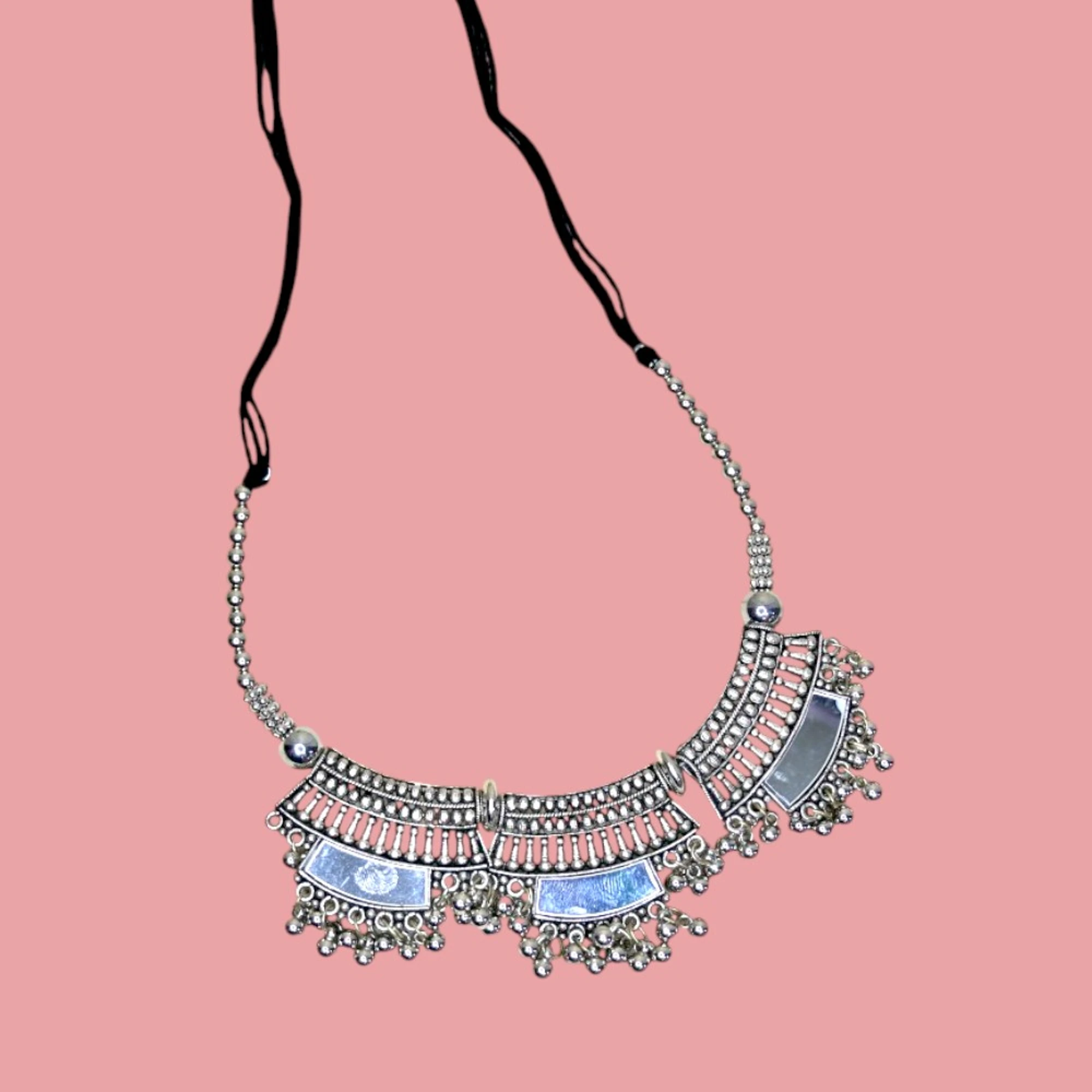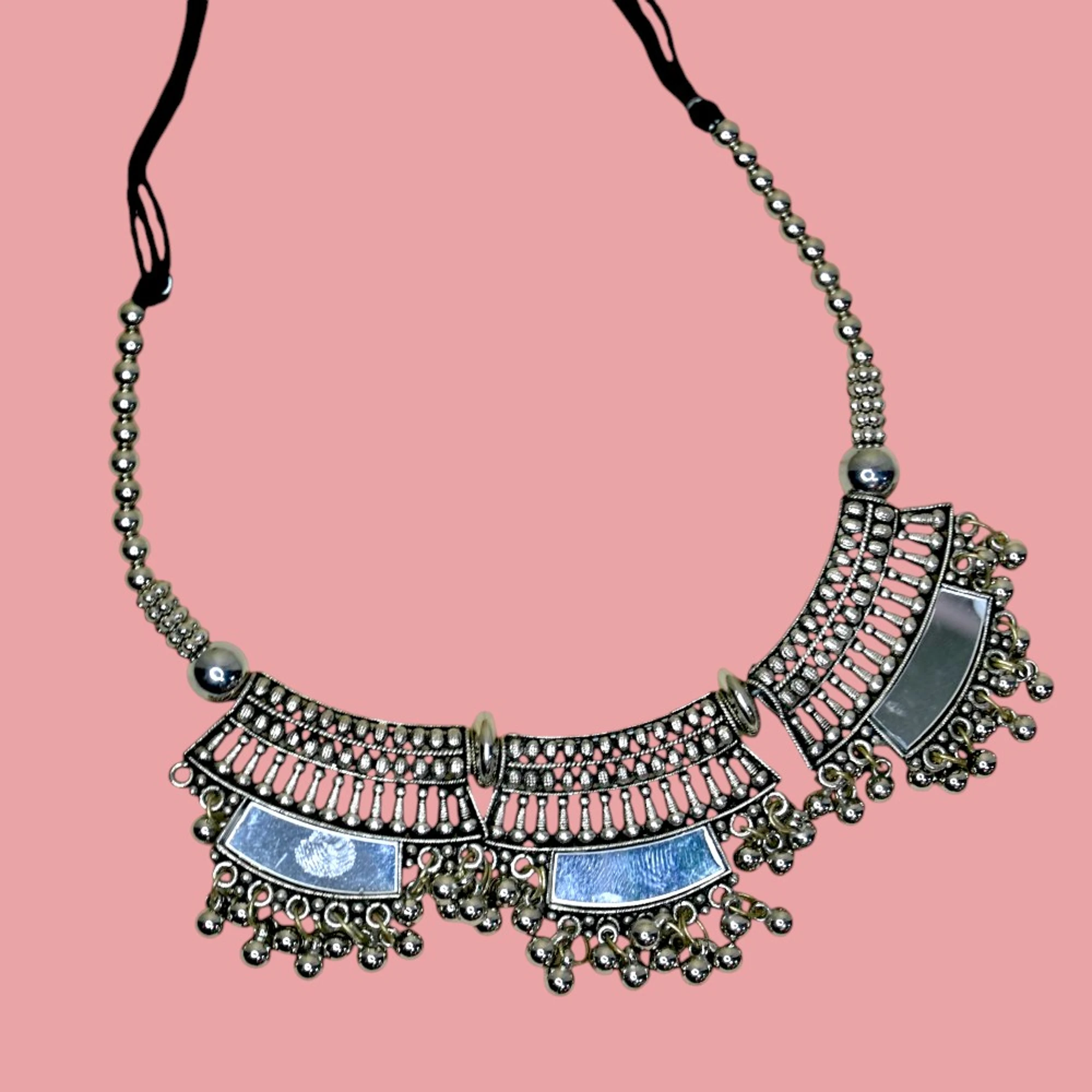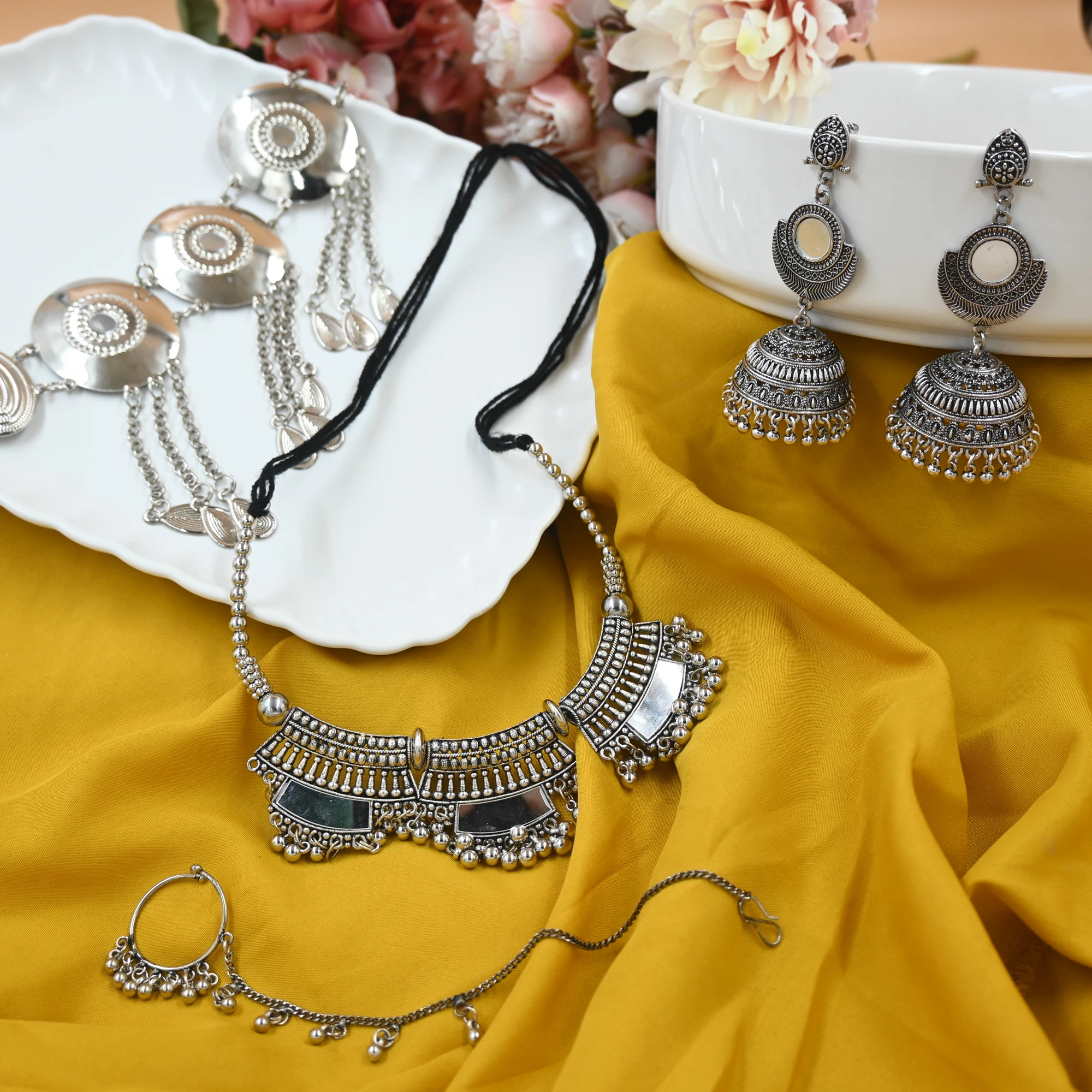 Bring festive charm to your Navratri celebrations with this elegant antique silver jewelry set that perfectly complements traditional outfits. The set includes a beautifully detailed necklace, matching earrings, a stylish bracelet, a hand harness, and a statement waist belt, all crafted in oxidized silver with intricate patterns that reflect timeless artistry. Designed for comfort and durability, these lightweight pieces allow you to enjoy garba and dandiya nights while looking graceful. Whether paired with a lehenga, saree, or chaniya choli, this jewelry set enhances your festive attire with unmatched ethnic elegance.