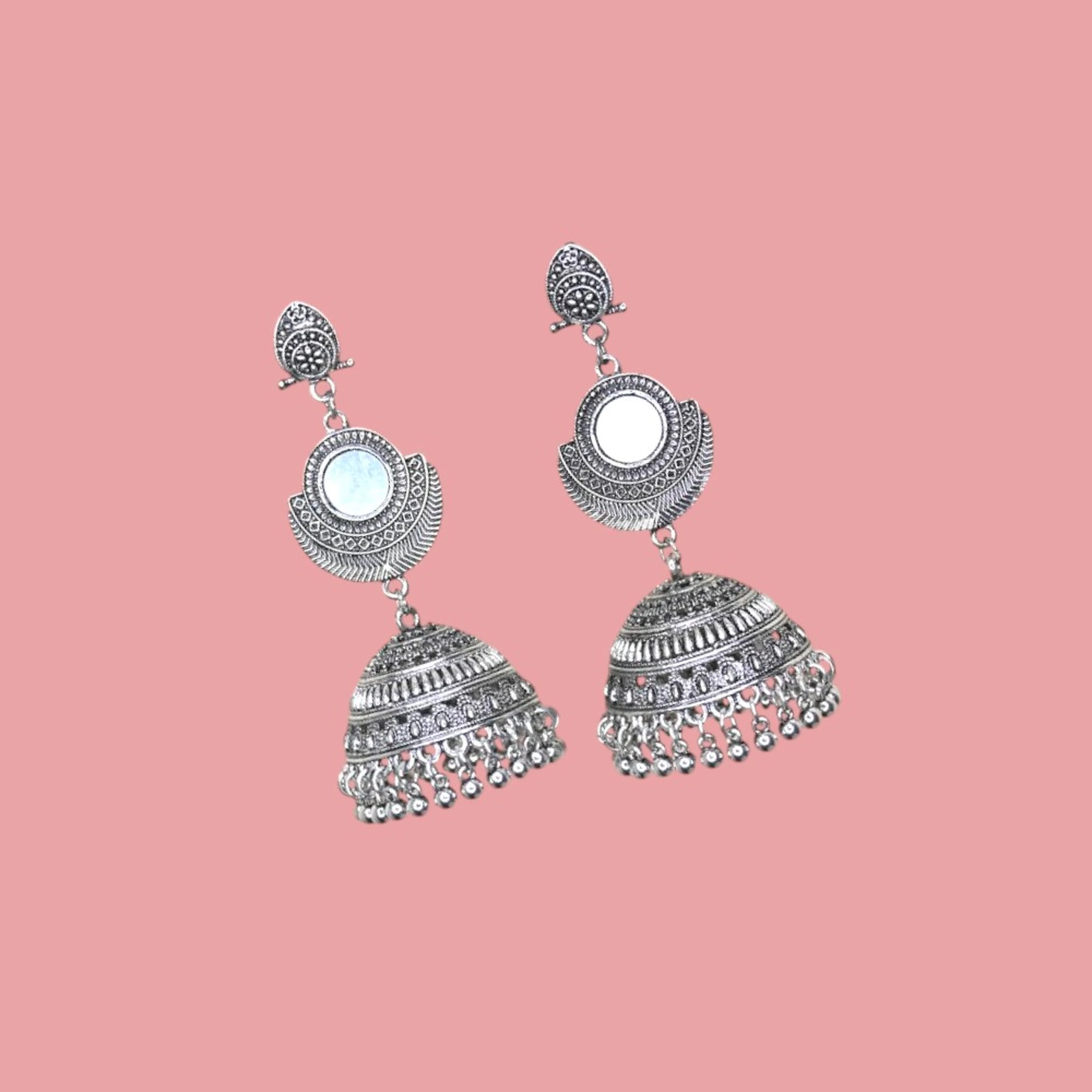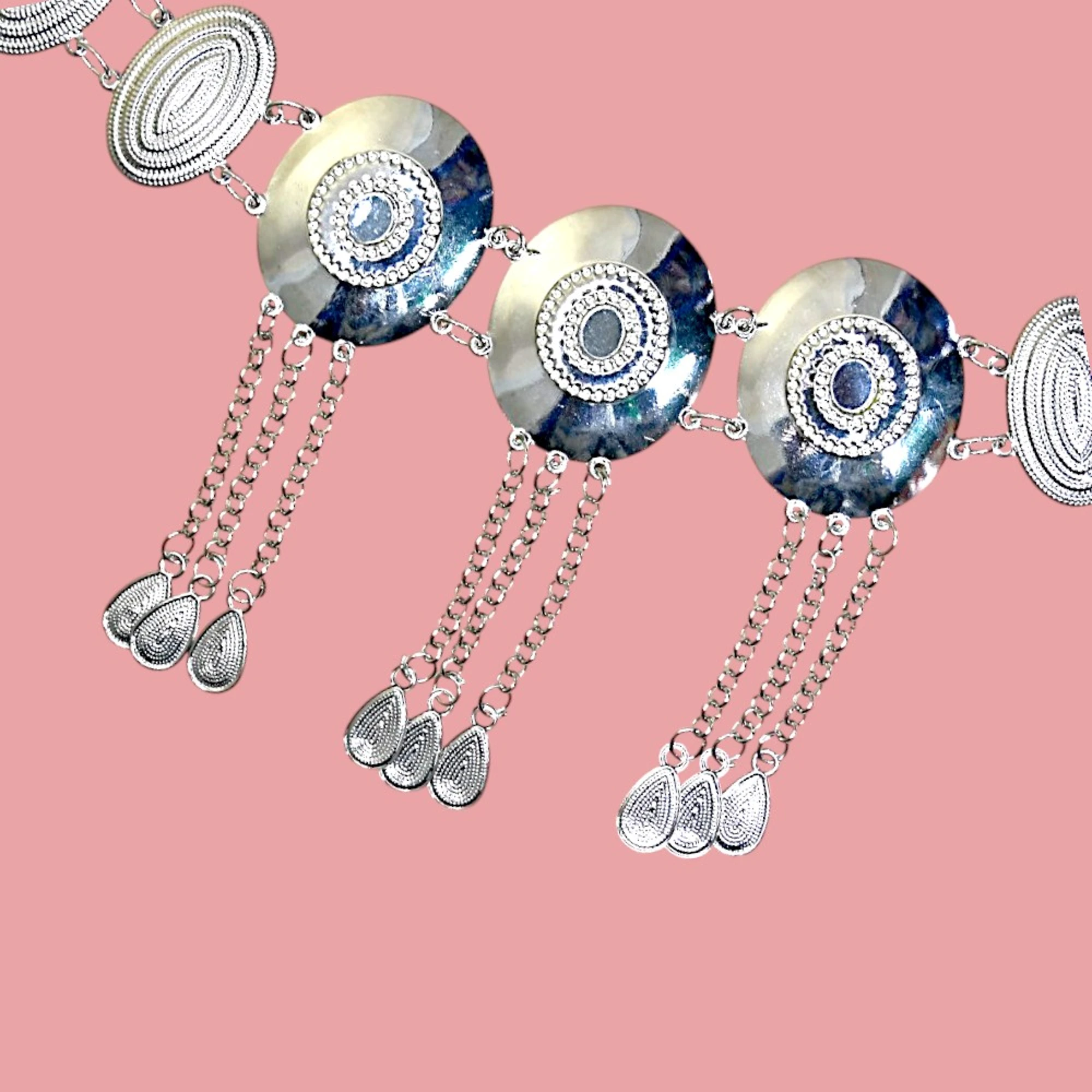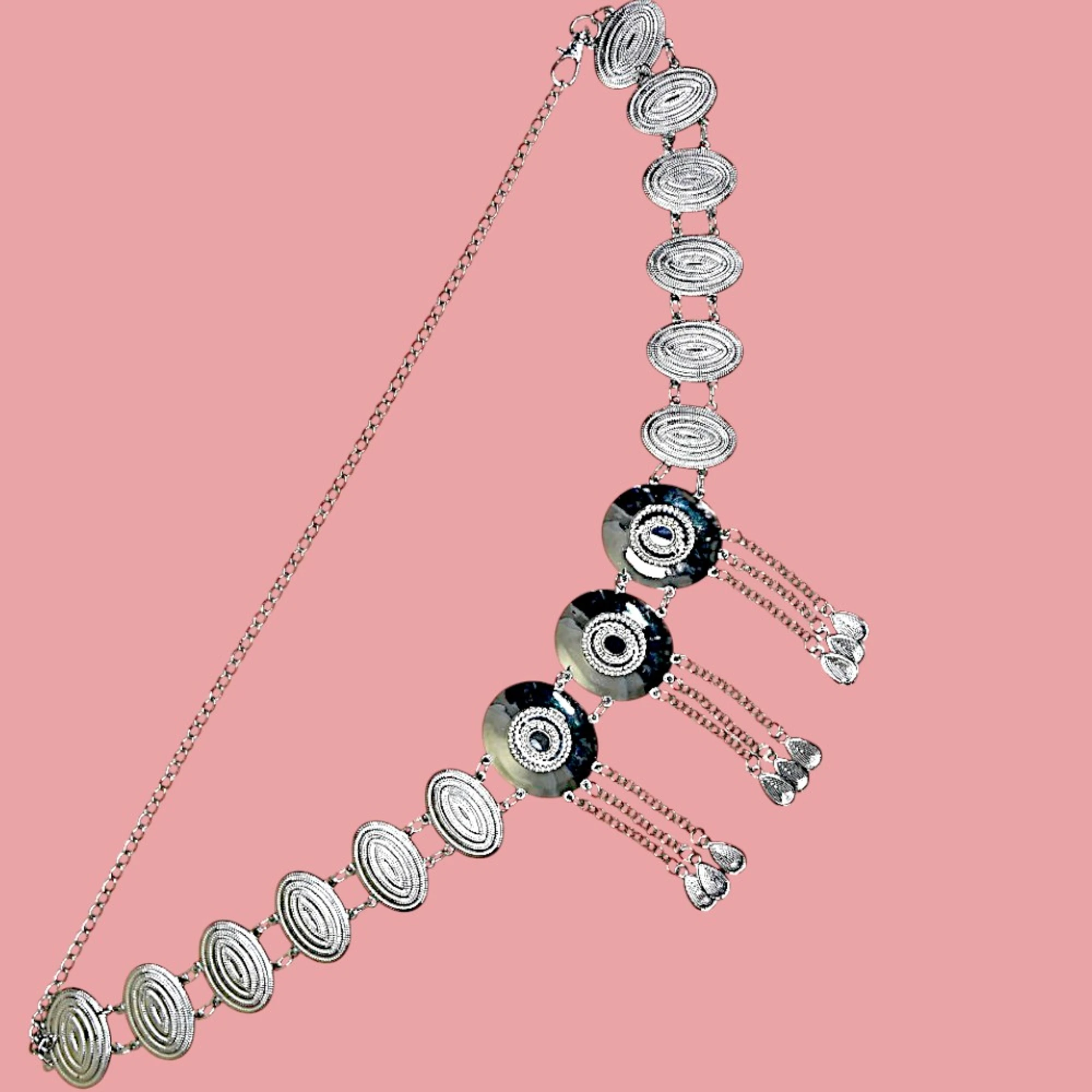 Bring festive charm to your Navratri celebrations with this elegant antique silver jewelry set that perfectly complements traditional outfits. The set includes a beautifully detailed necklace, matching earrings, a stylish bracelet, a hand harness, and a statement waist belt, all crafted in oxidized silver with intricate patterns that reflect timeless artistry. Designed for comfort and durability, these lightweight pieces allow you to enjoy garba and dandiya nights while looking graceful. Whether paired with a lehenga, saree, or chaniya choli, this jewelry set enhances your festive attire with unmatched ethnic elegance.
