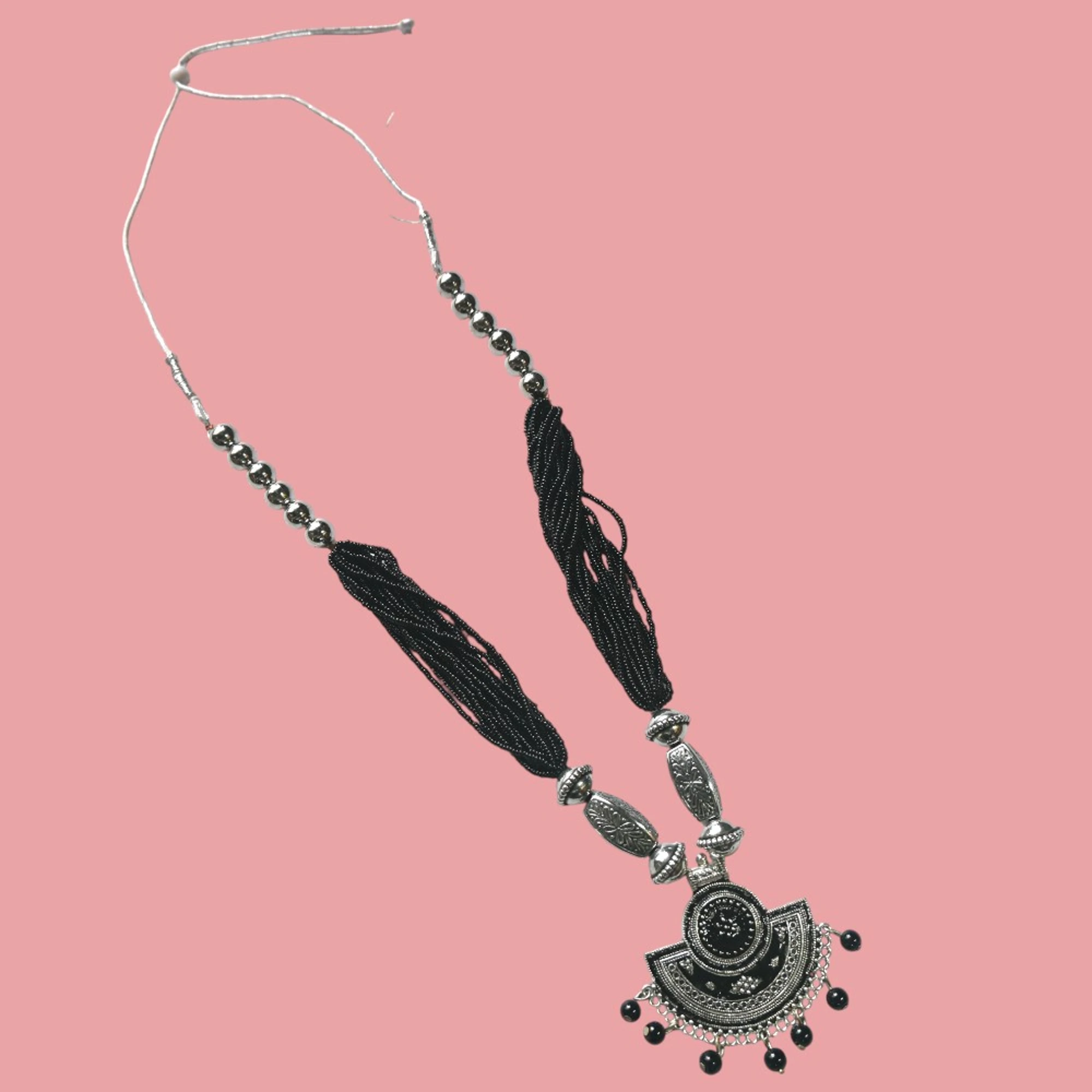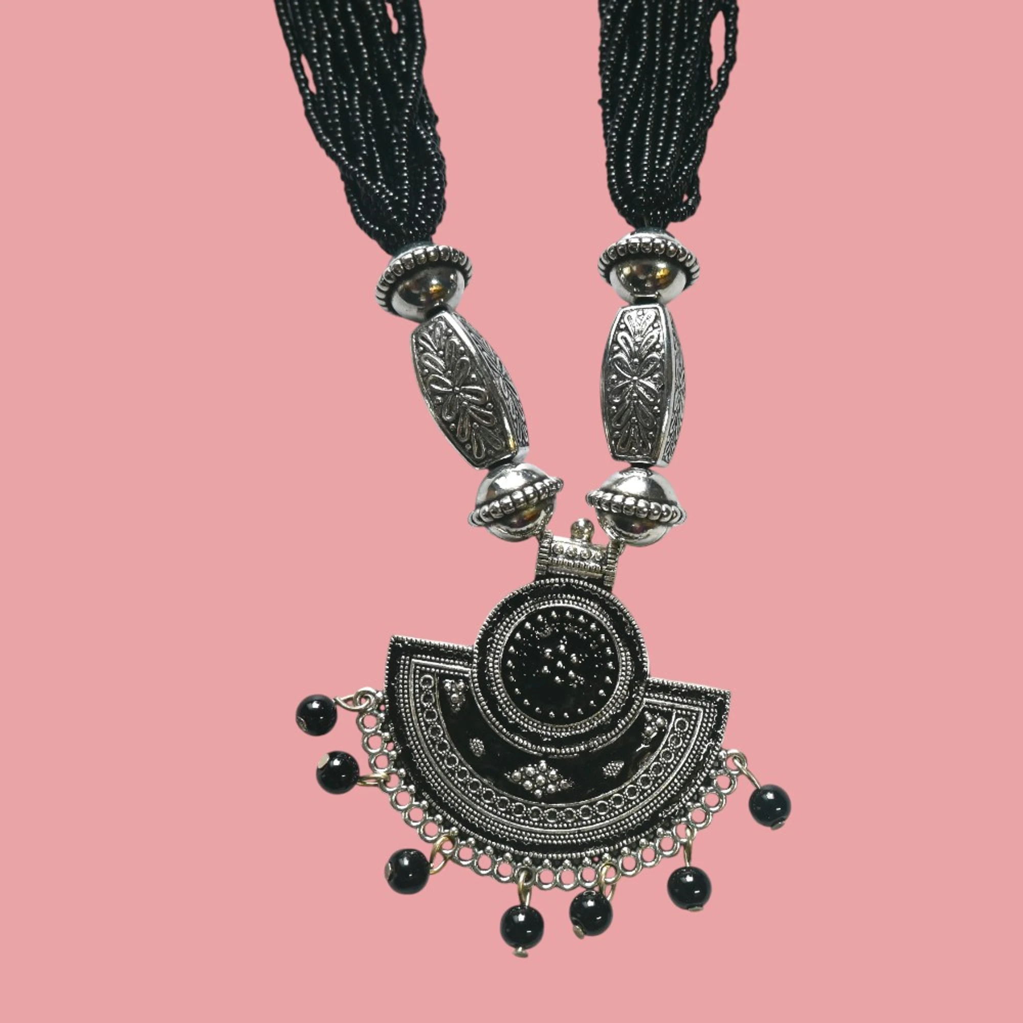 Step into sophistication with our Ethnic Neckpiece & Earring Set in stunning silver and black. Perfect for any occasion, this set is designed to add a touch of elegance and charm to your attire.