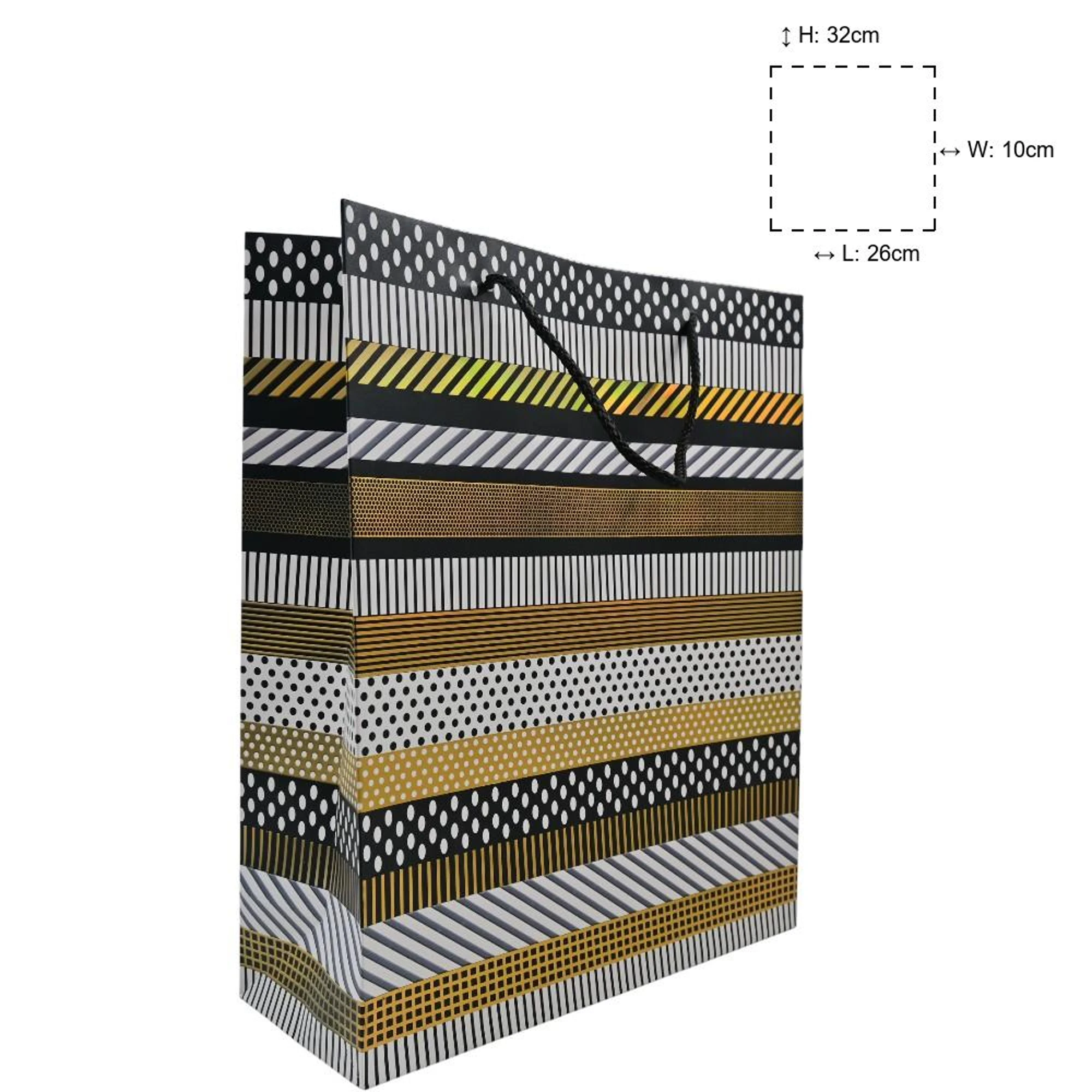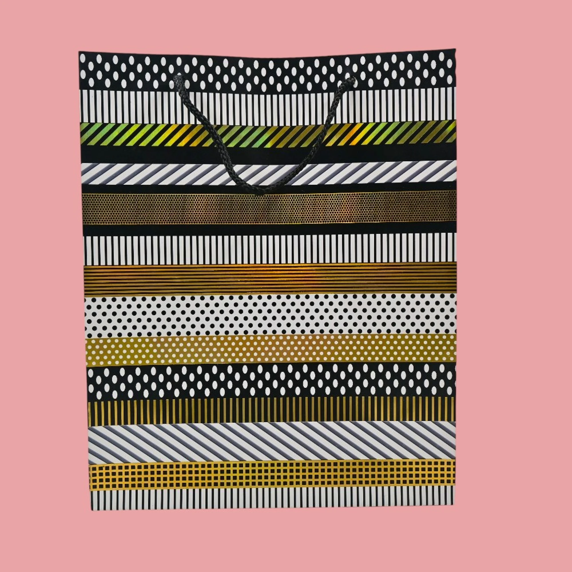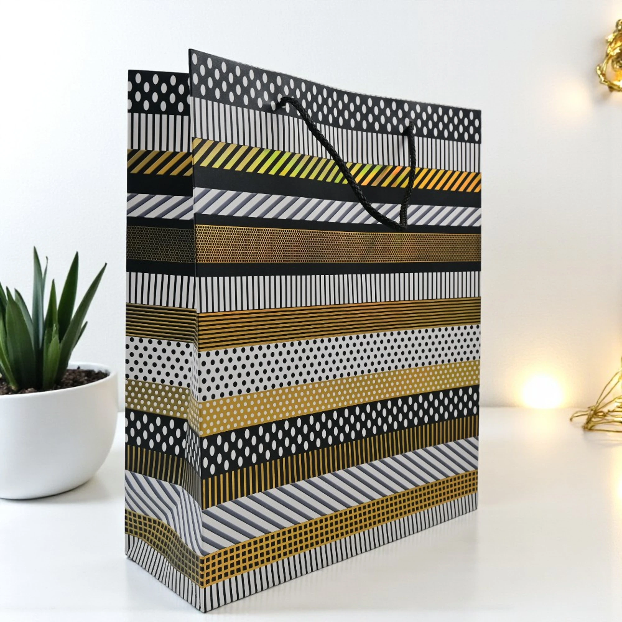 Perfect for parties, gifts, or retail, these Elegant Gold & Black Paper Bags add a touch of sophistication to any event. Each bag features stylish horizontal lines in a chic combination of gold and black, making them a versatile choice for various occasions.