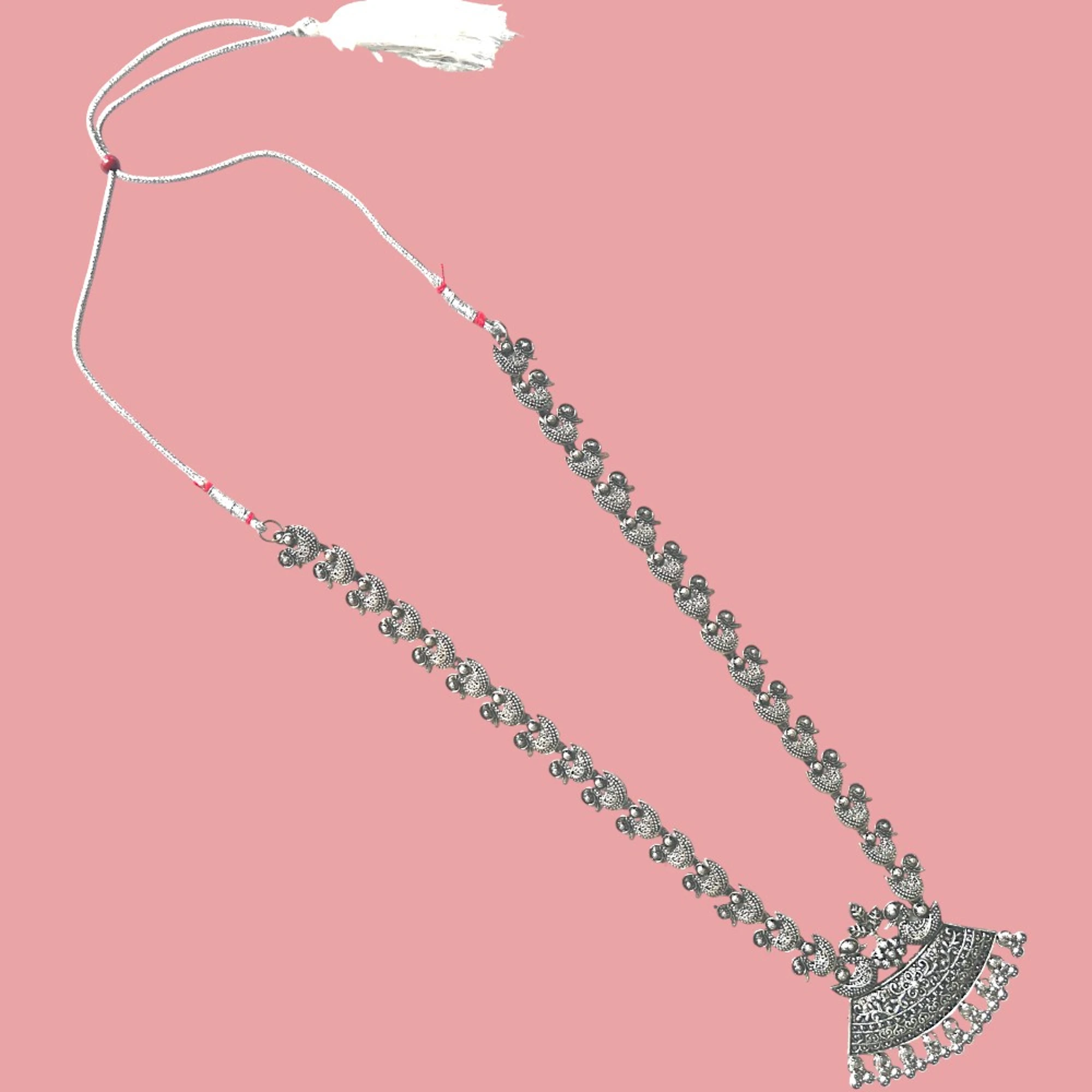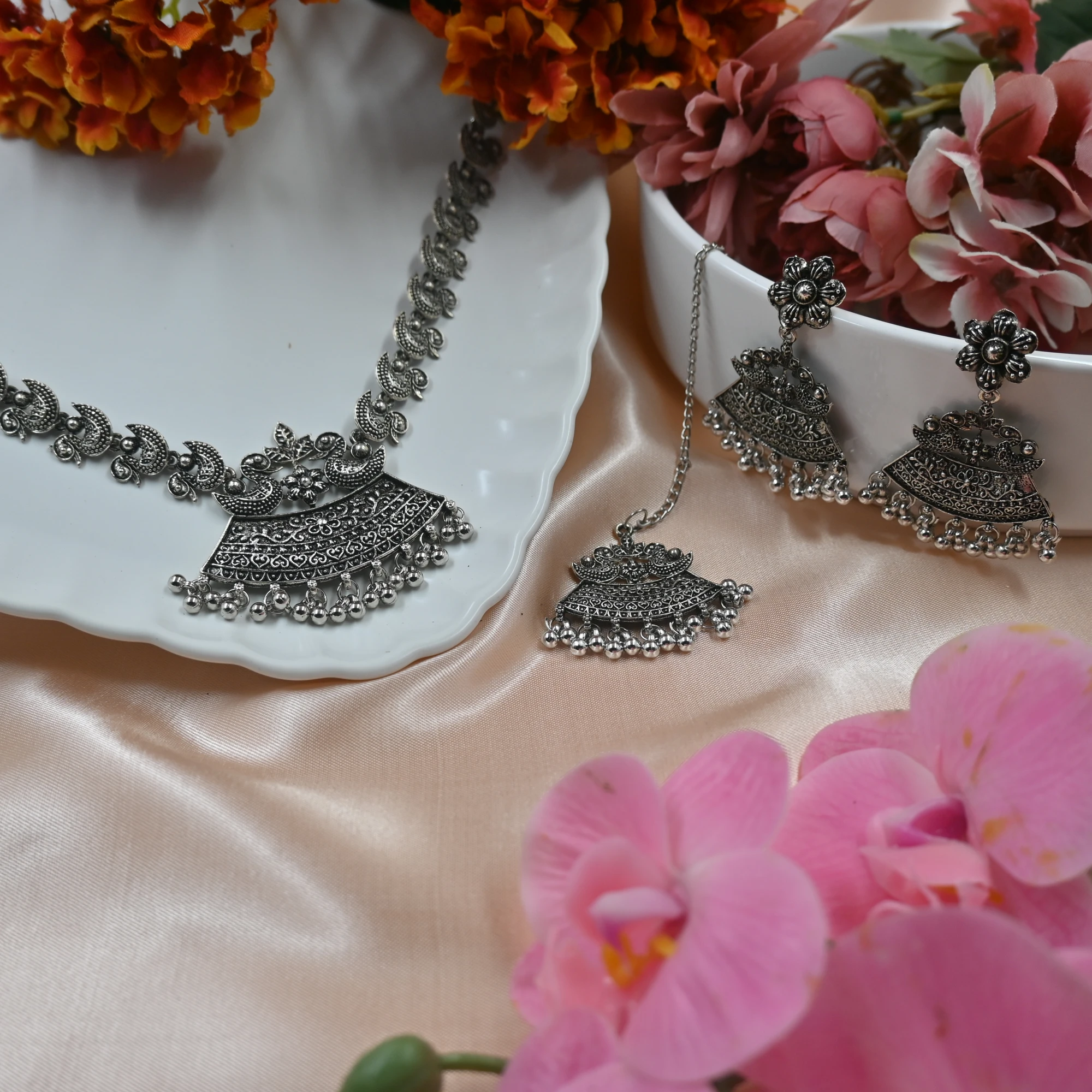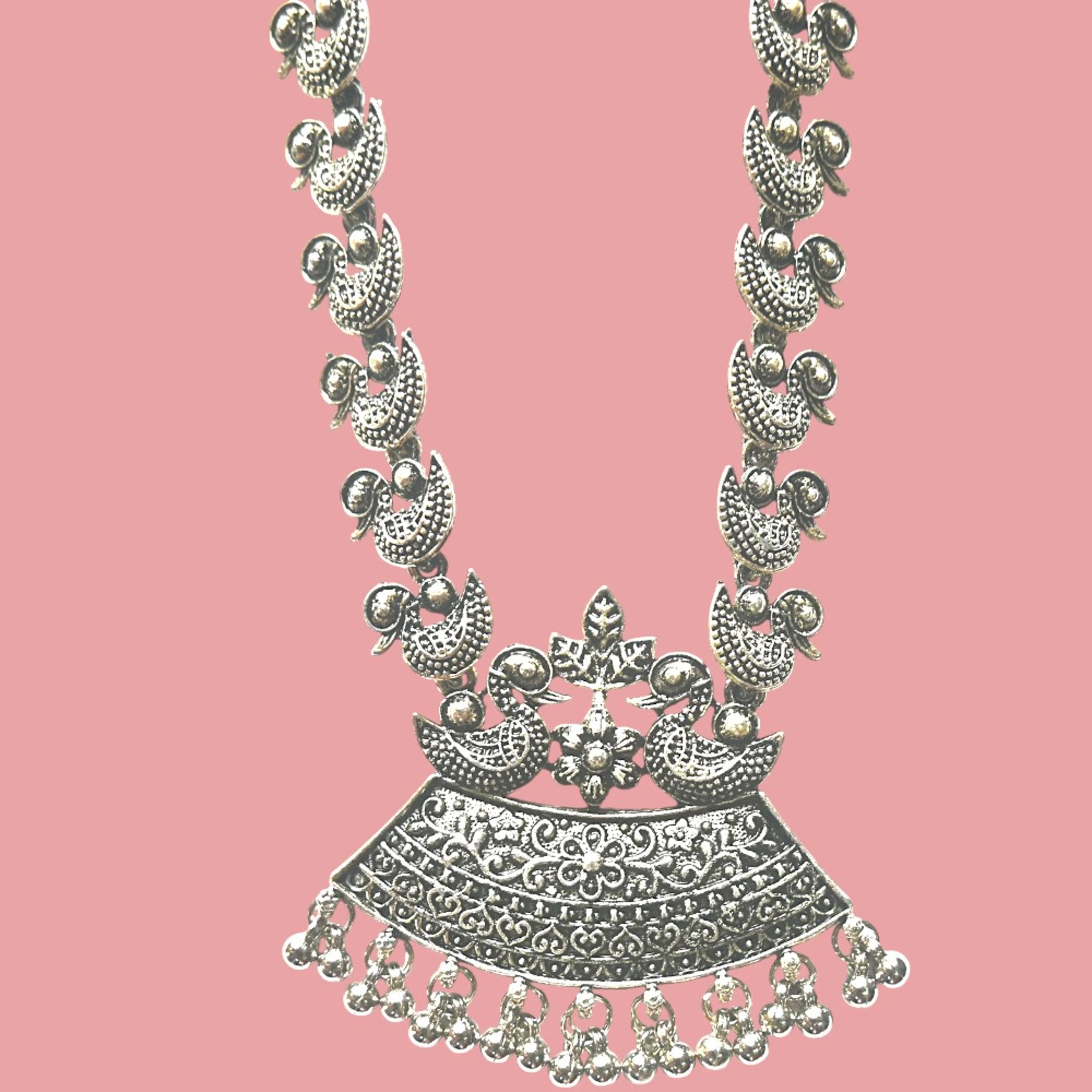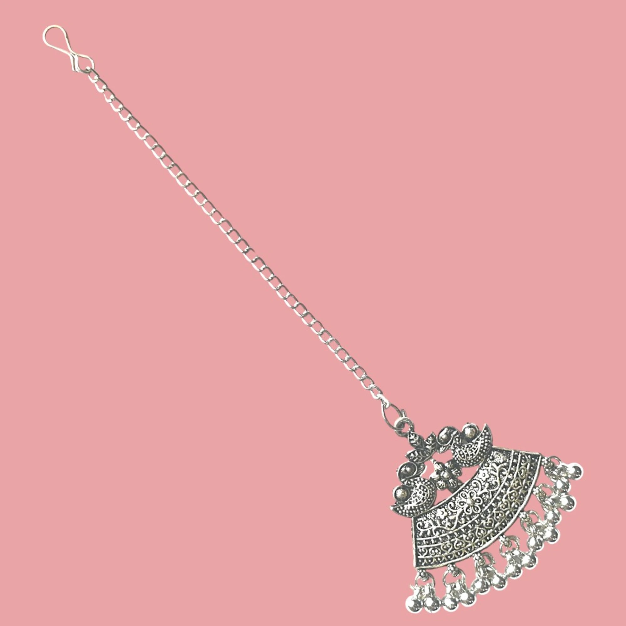 This Oxidized Silver Swan Neck Earrings Mang Tikka Set is perfect for adding a touch of elegance to any outfit. The intricate detailing and unique swan design make this set a beautiful addition to your jewelry collection. Crafted with care, the oxidized finish delivers a timeless look that pairs well with both traditional and modern attire.