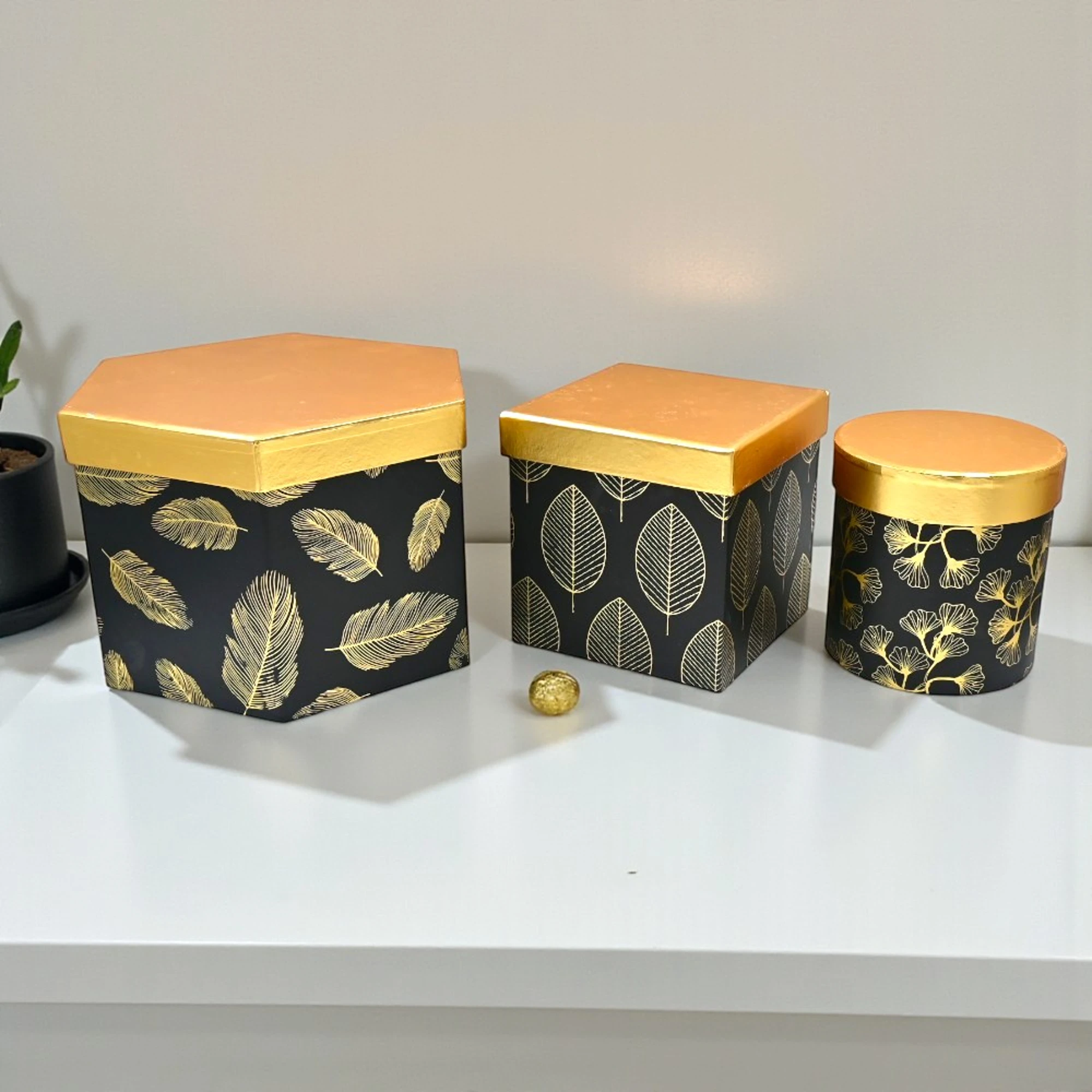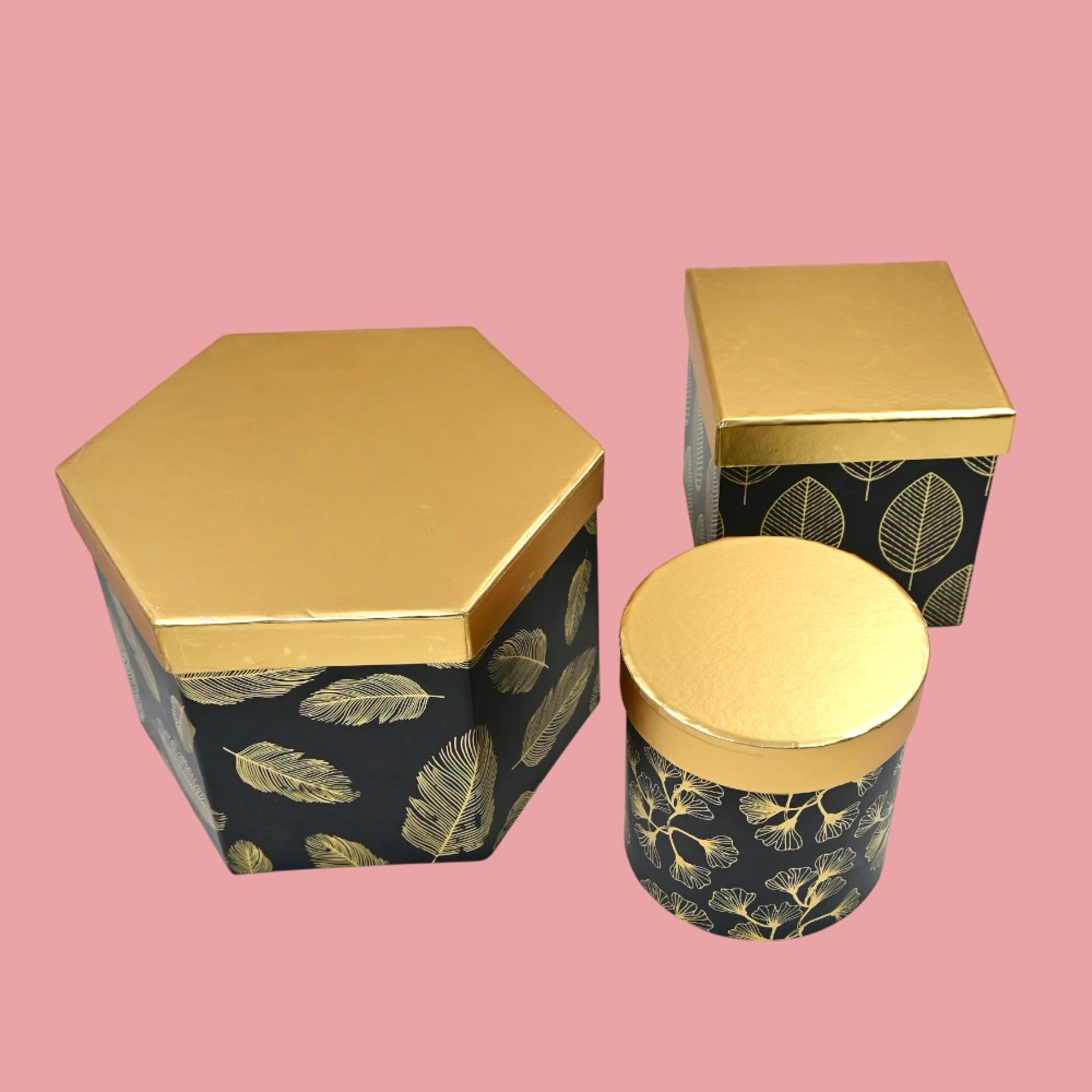 Make your gift-giving extra special with this beautiful Feather Print Gift Box Set, designed to add a touch of charm and sophistication to any present. This delightful set includes three uniquely shaped gift boxes: a hexagon, a square, and a round, all adorned in an elegant black finish with a subtle feather print.