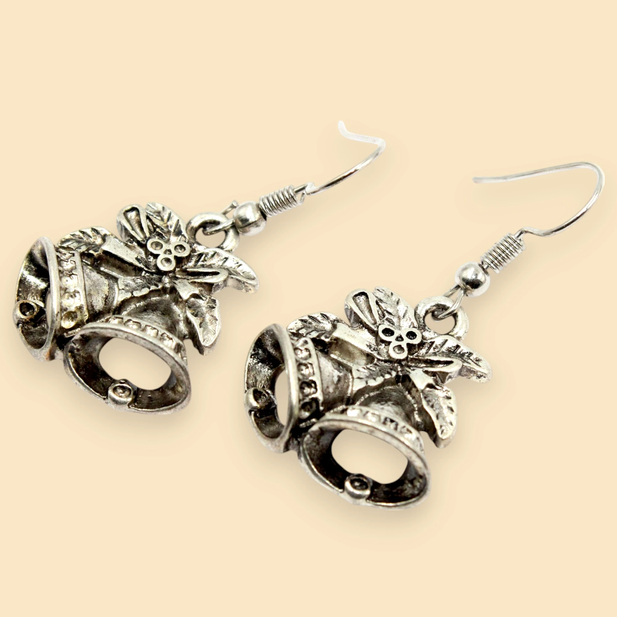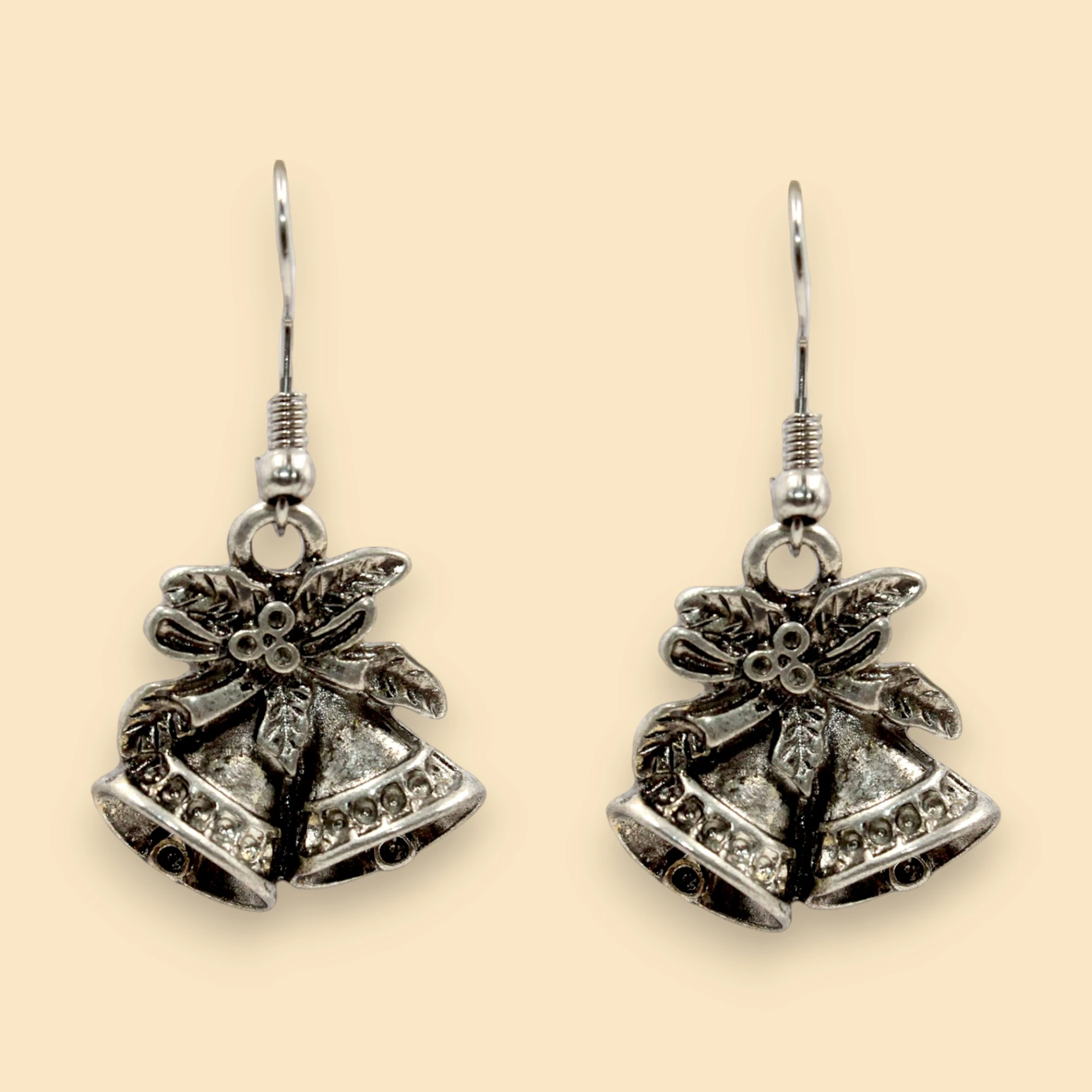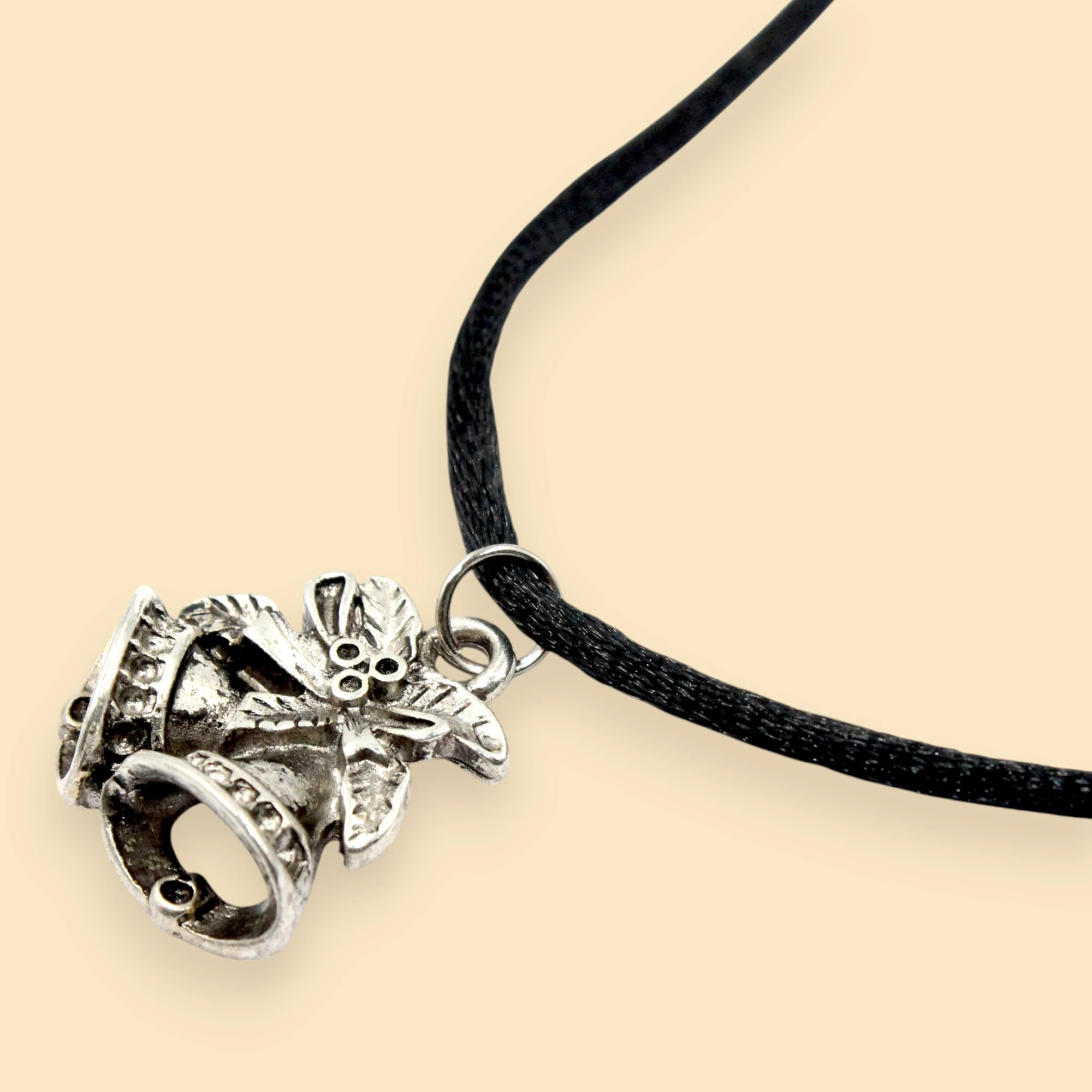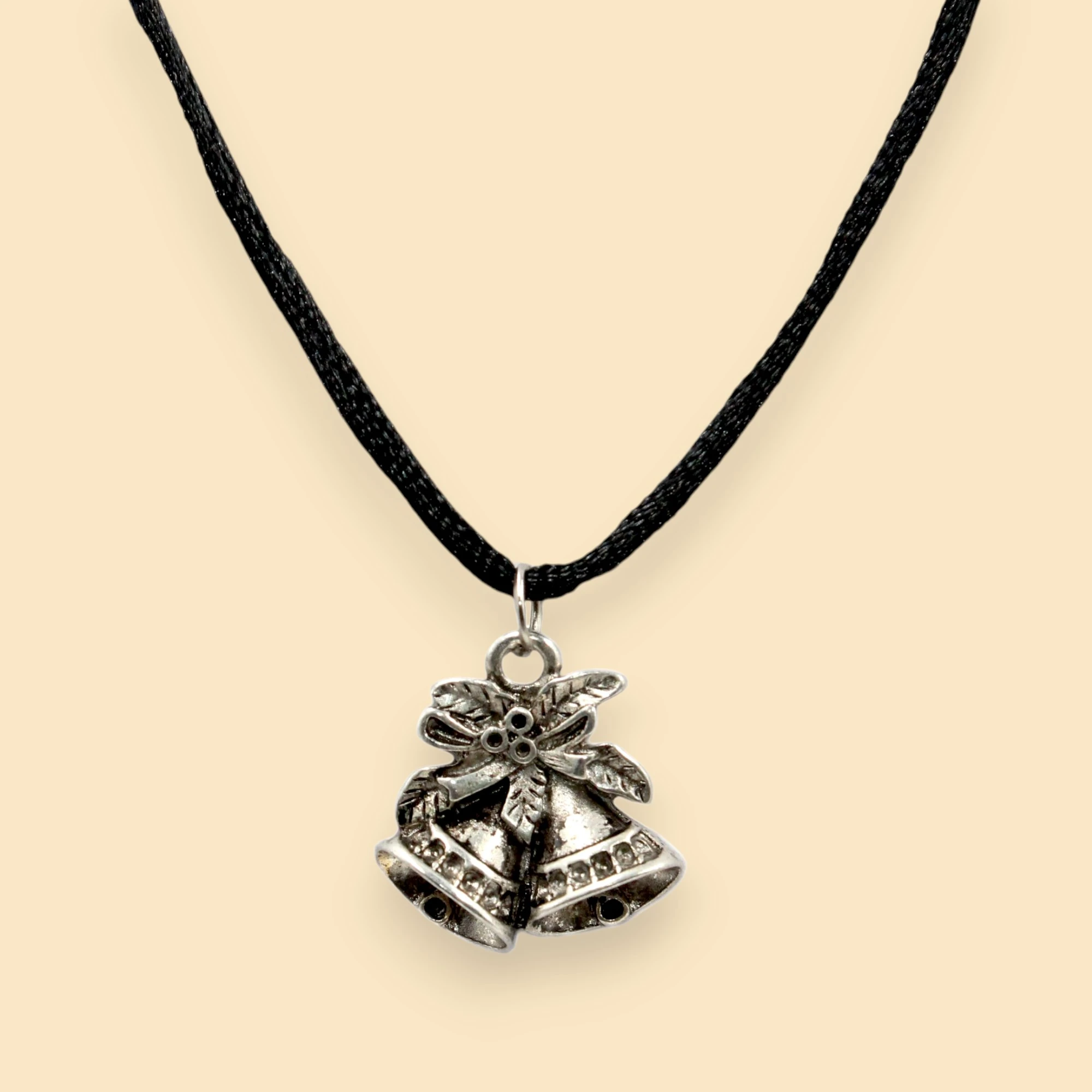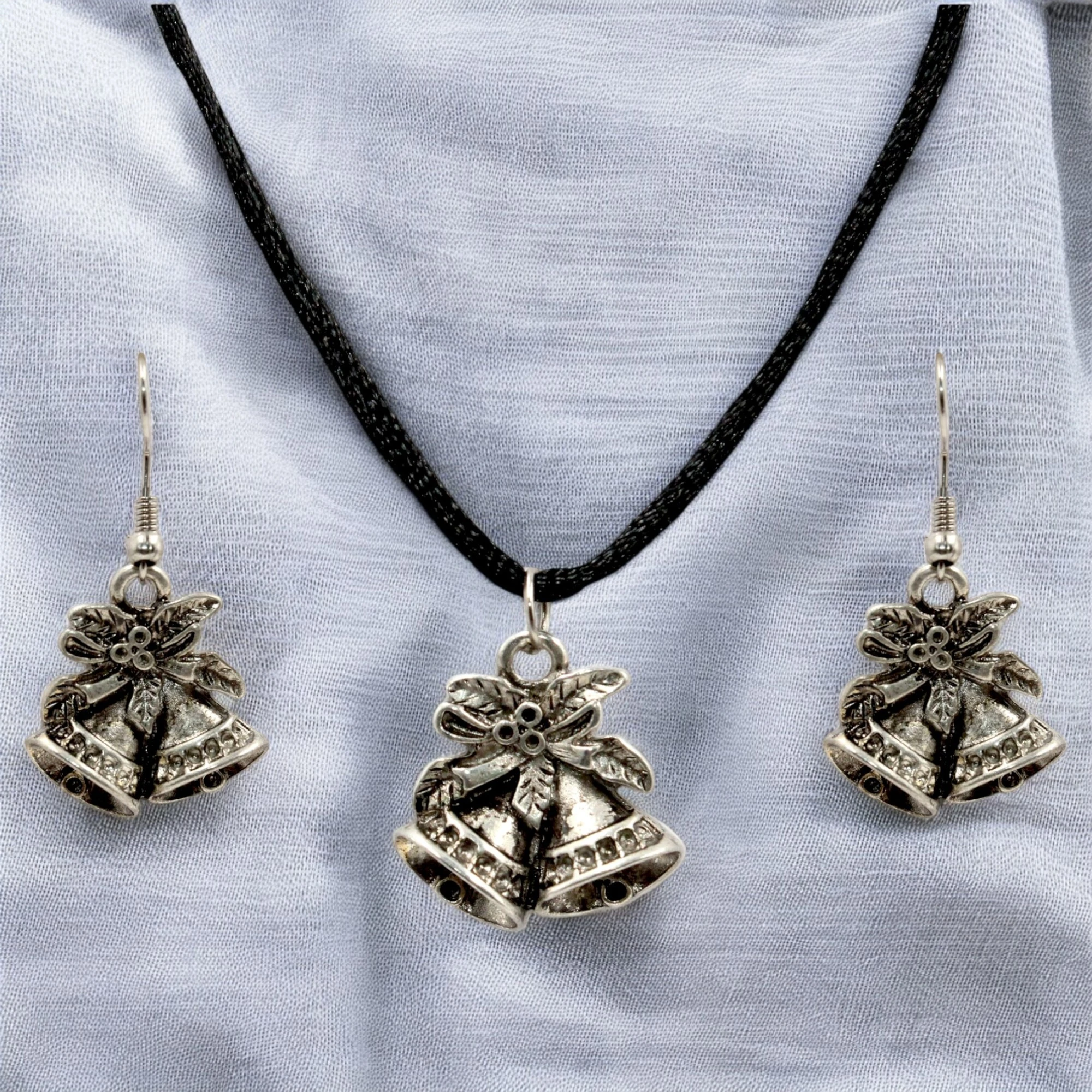 This image showcases a festive jewelry set consisting of a necklace and a pair of earrings. The necklace features a black cord with a pendant shaped like two bells adorned with a bow and floral details. The matching earrings also feature the same bell and bow design, hanging from simple hooks. The intricate detailing and festive theme make this set perfect for holiday celebrations or as a charming accessory for any occasion.