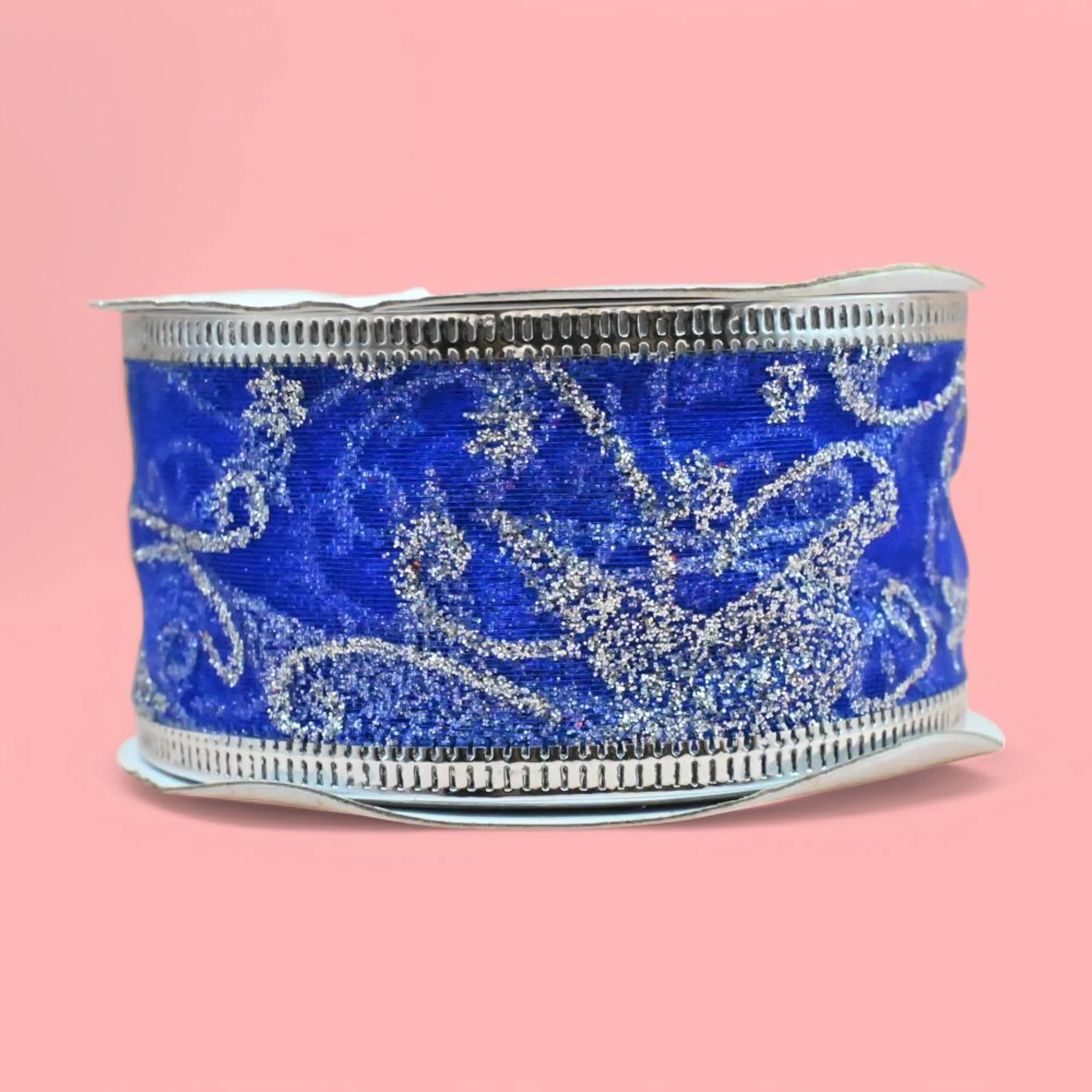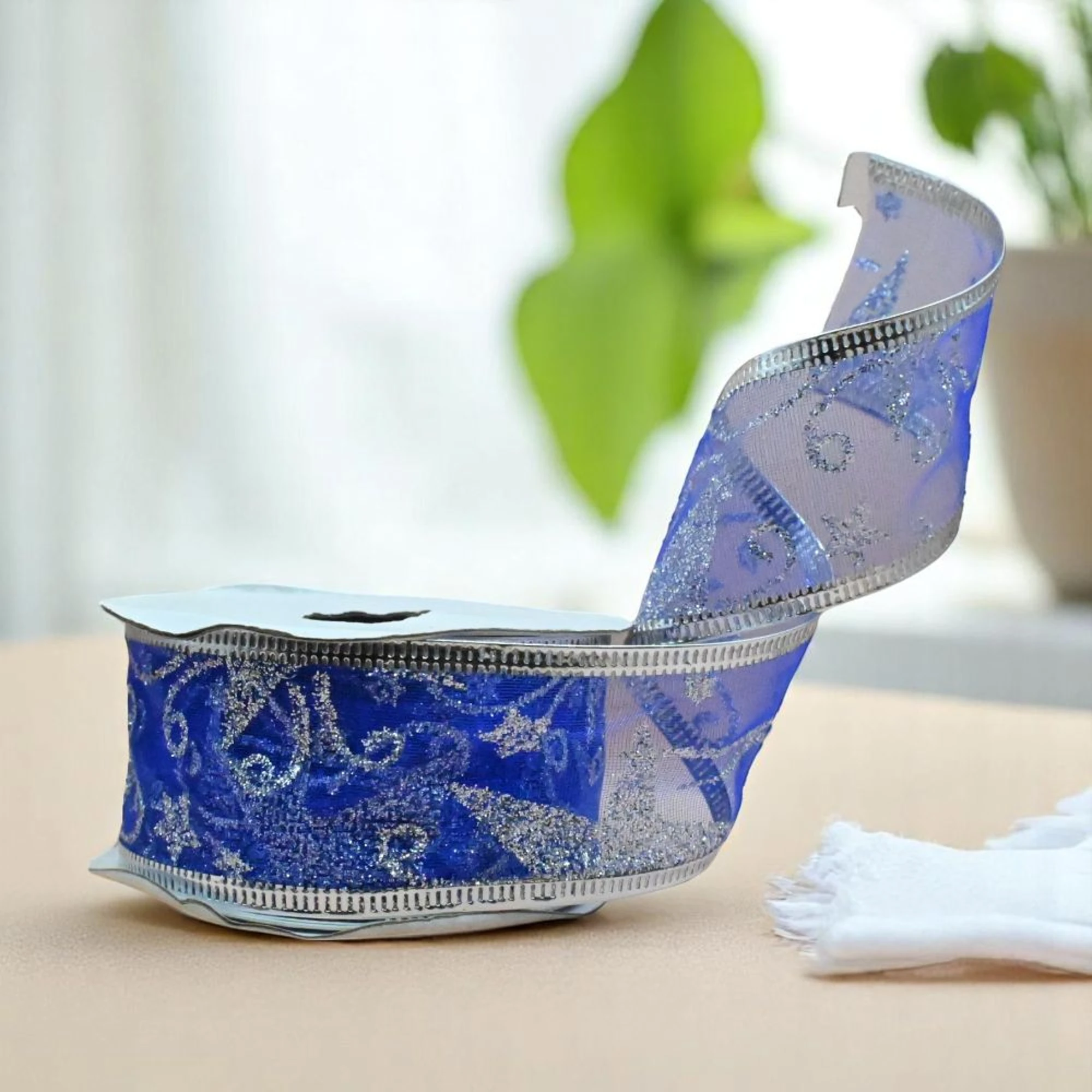 The ribbon features a stunning blue organza fabric adorned with enchanting silver stars, capturing the magic of the holiday season. The wired edges allow for easy shaping and secure bows, ensuring that your decorations maintain their beauty throughout the holidays.