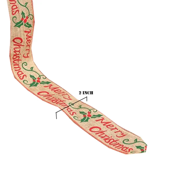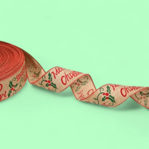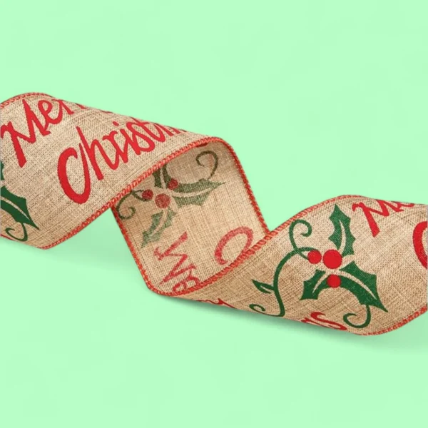 Festive Burlap Ribbon with “Merry Christmas” and Holly Design