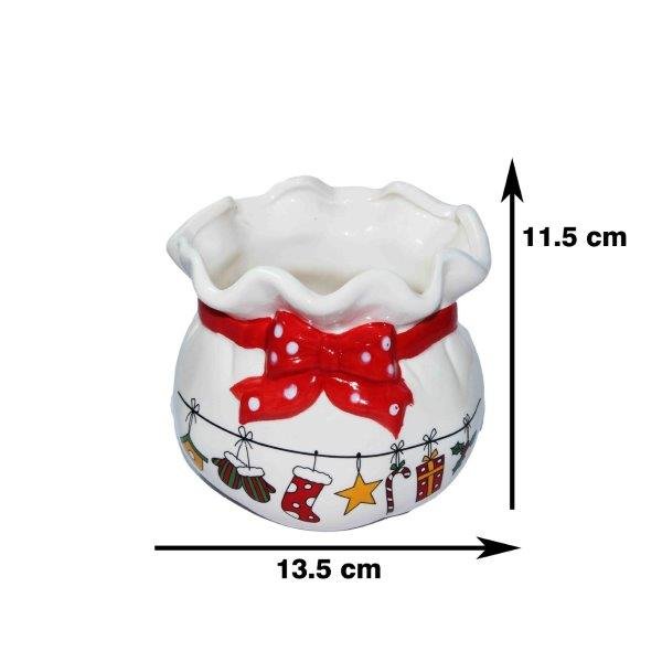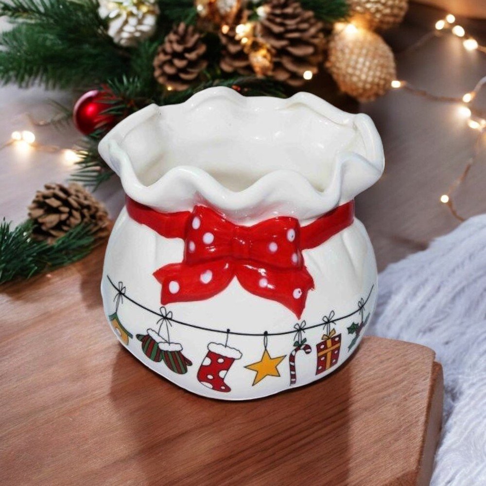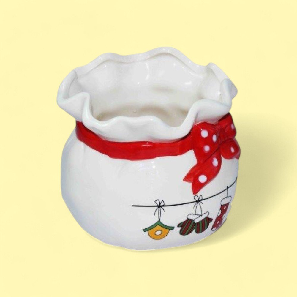 The image shows a festive ceramic pot designed to resemble a Christmas sack. The pot is white with a ruffled top edge and features a large red bow with white polka dots around its upper portion. Below the bow, there is a string of Christmas-themed decorations painted on the pot, including stockings, mittens, a star, candy canes, and gift boxes. The pot is placed on a wooden surface, with a background of pine cones, evergreen branches, and Christmas lights, adding to the holiday ambiance. This decorative item embodies the festive spirit and can be used as a charming addition to your holiday decor.
