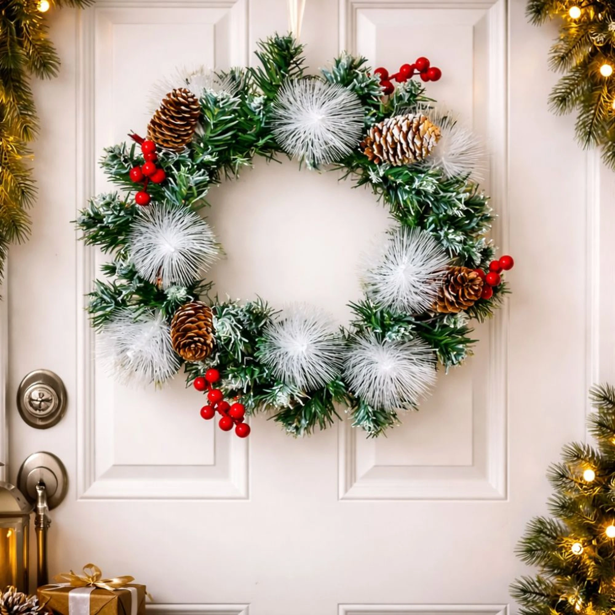 Add a touch of holiday magic to your home with the XMAS Wreath with Cherry Pine White Bristles! At 30 cm in diameter, this charming wreath is perfect for doors, walls, or mantels, spreading festive cheer effortlessly.