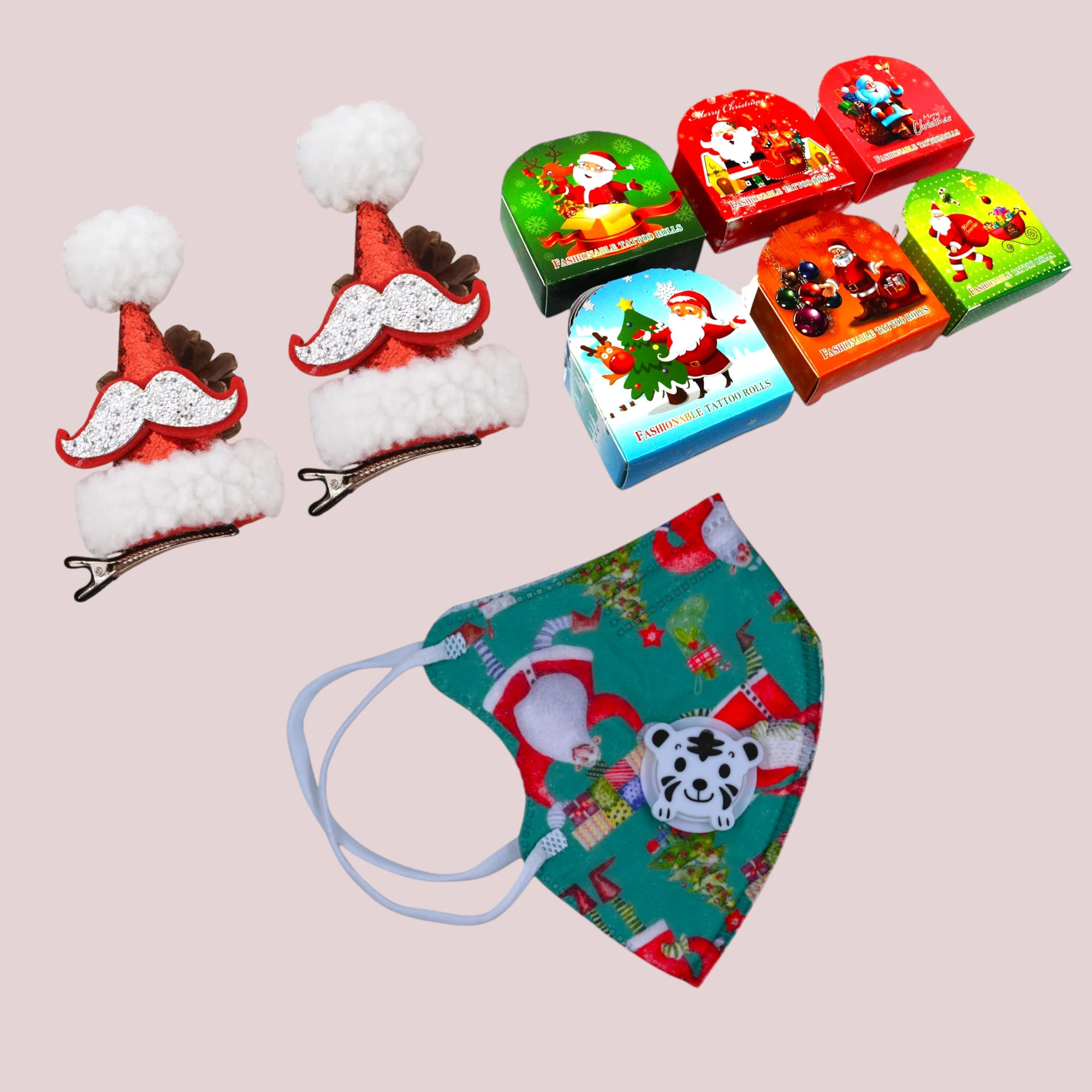 Make your Christmas celebrations extra merry and bright with our delightful Christmas Accessory Bundle! This festive set includes two charming Xmas masks, perfect for staying safe while looking stylishly seasonal. Additionally, the set features two Santa hat sil moustache clips, adding the perfect touch of jolly fun to any outfit. To top it off, enjoy our Xmas tattoo rolls to bring holiday cheer to any gathering. Each item in this bundle is designed with holiday spirit in mind, making it an ideal choice for parties, family gatherings, or simply brightening up daily activities during the holiday season.