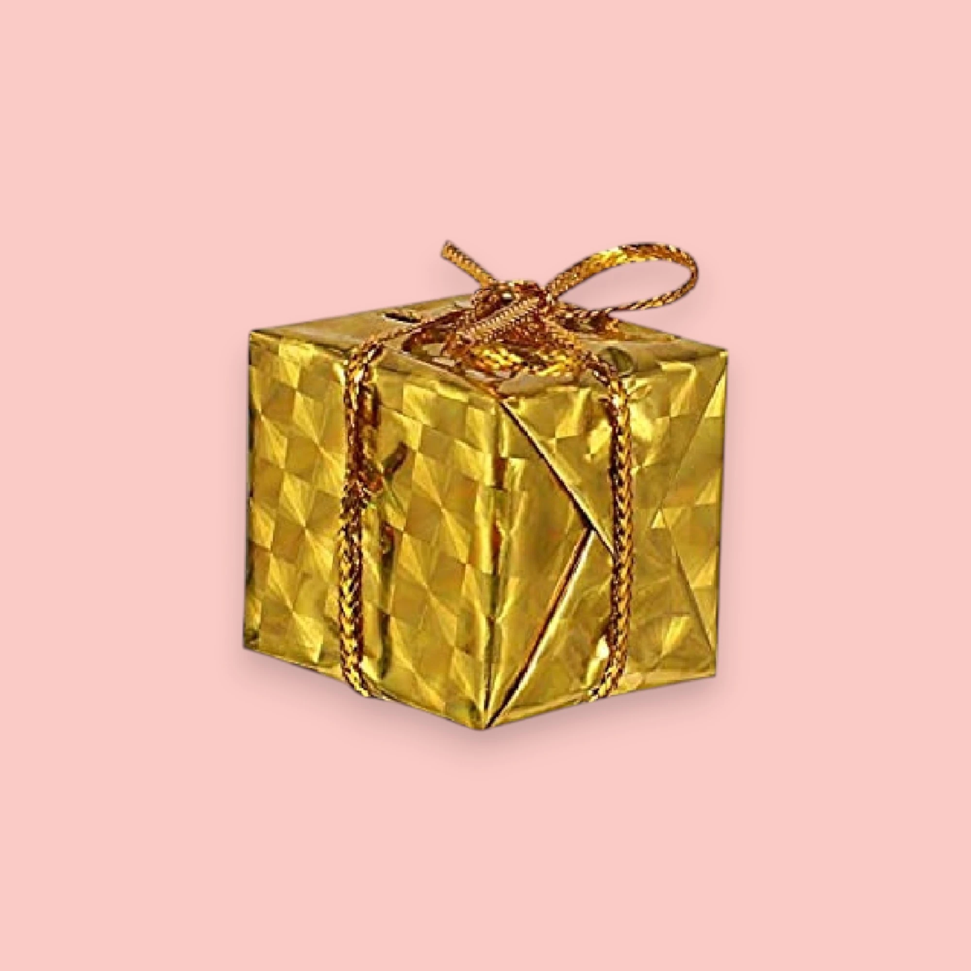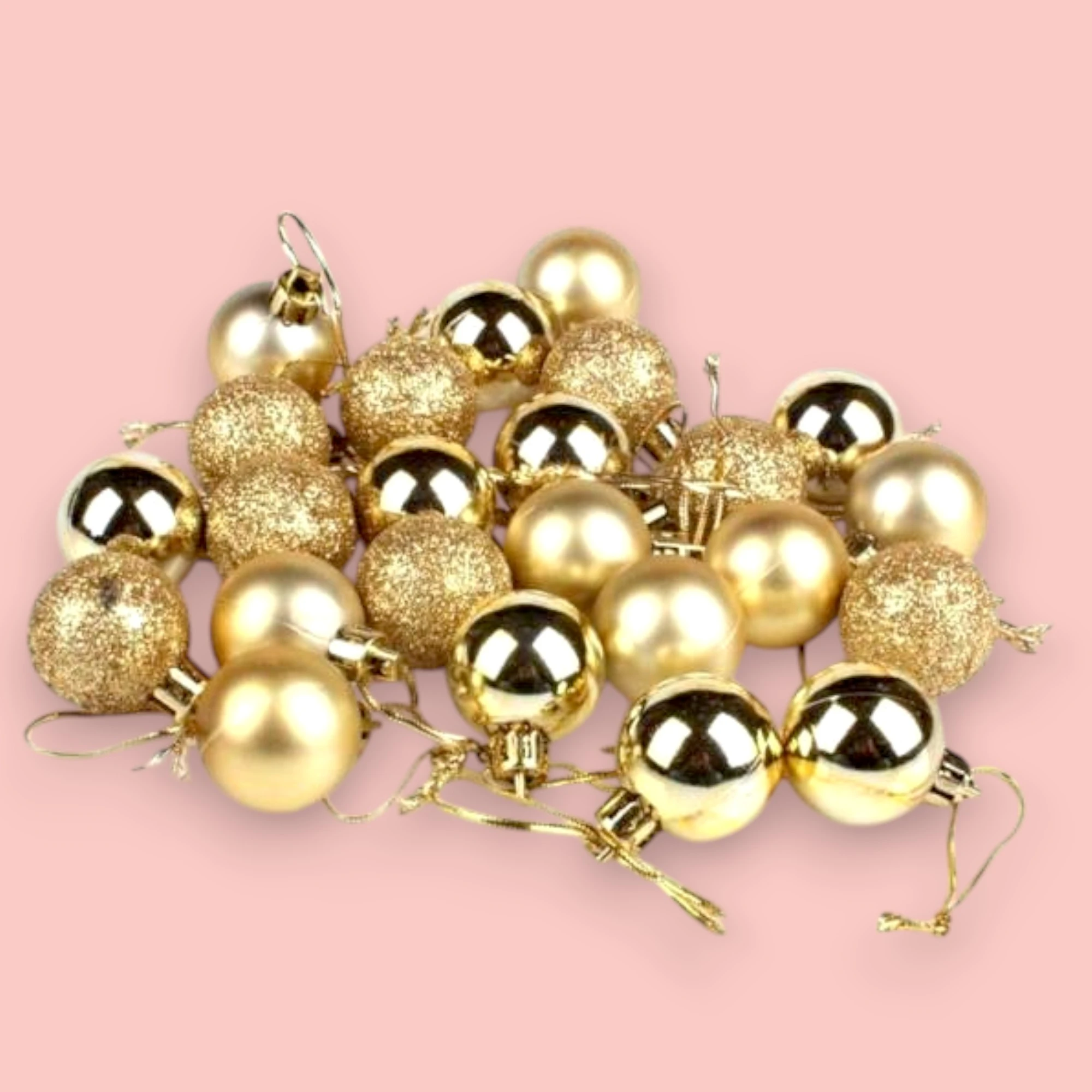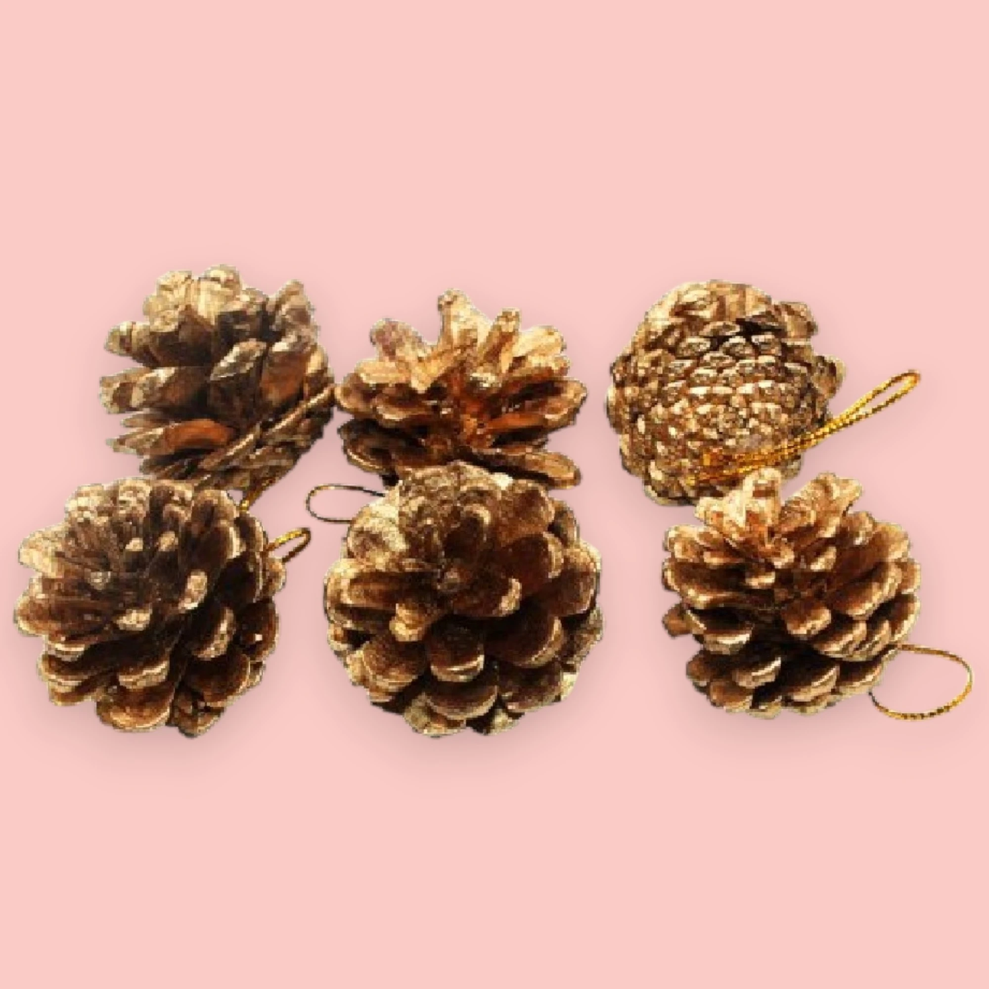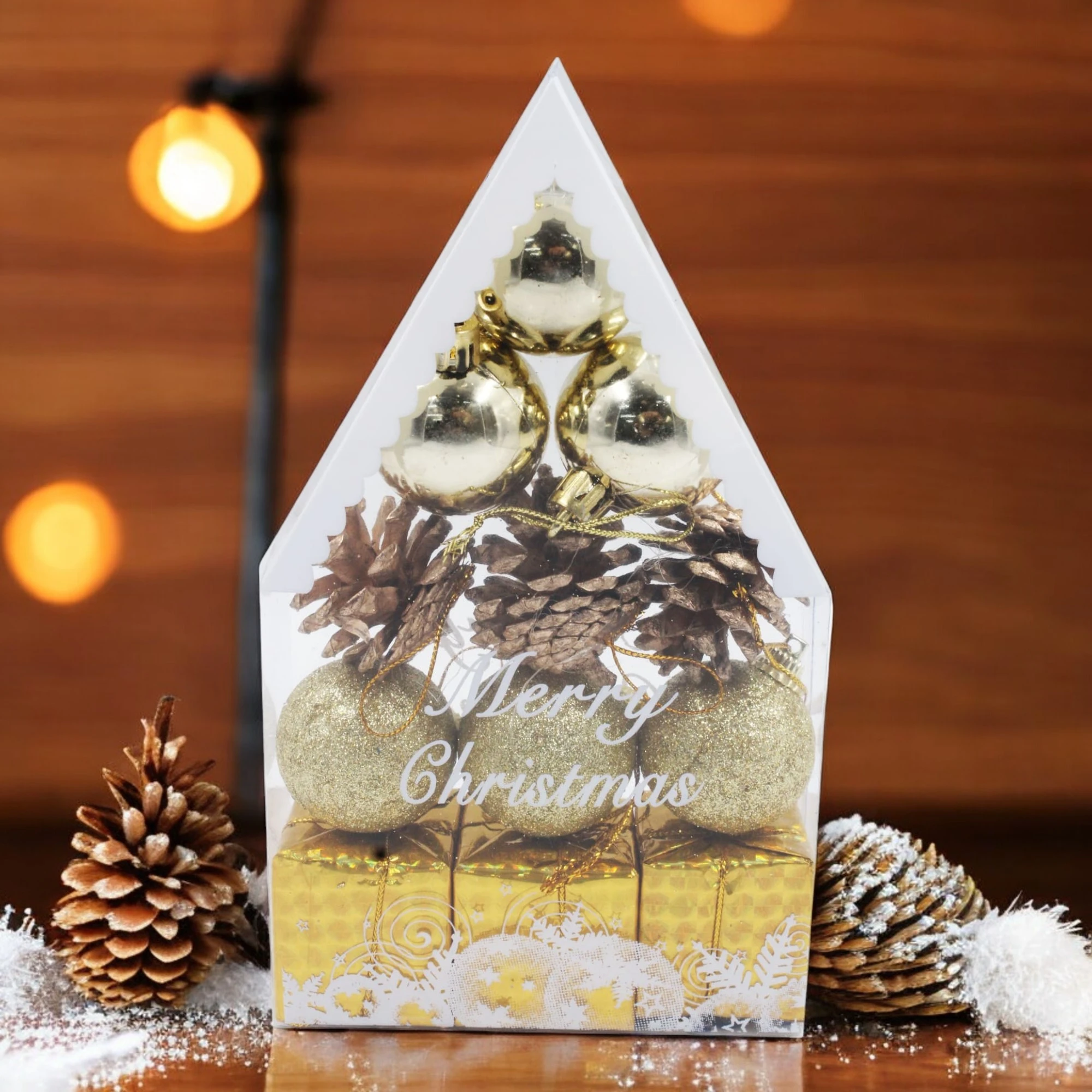 The image shows a festive Christmas decoration set packaged in a transparent, house-shaped box. The set includes golden Christmas ornaments, pine cones, and small golden gift boxes. The ornaments are shiny and spherical, adding a touch of elegance to the arrangement. The pine cones provide a natural, rustic element, while the golden gift boxes enhance the festive feel. The front of the box is adorned with the text “Merry Christmas” in a white, cursive font, adding a cheerful holiday greeting. This decoration set encapsulates the essence of Christmas with its combination of natural and festive elements, making it a perfect addition to holiday decor.