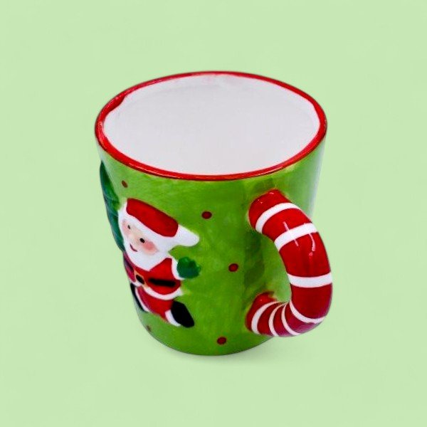The image shows a festive Christmas-themed mug placed on a wooden surface dusted with artificial snow. The mug is predominantly green with a red interior and features a cheerful Santa Claus holding a Christmas tree. The handle of the mug is designed to resemble a candy cane with red and white stripes. In the background, there are pine cones, evergreen branches, and string lights, enhancing the holiday atmosphere. This image is interesting and relevant as it captures the essence of Christmas decorations and festive spirit, making it suitable for holiday-themed promotions or celebrations.