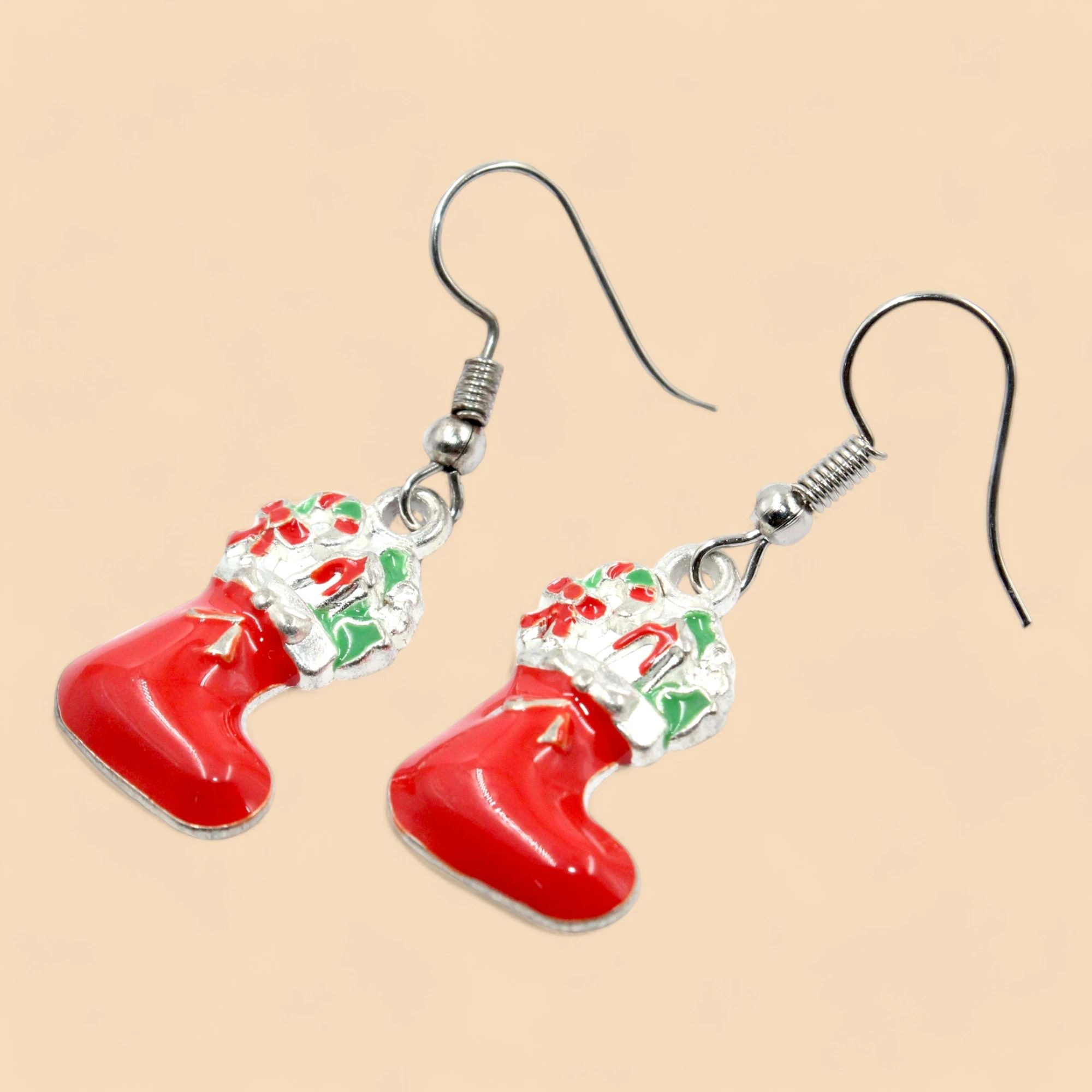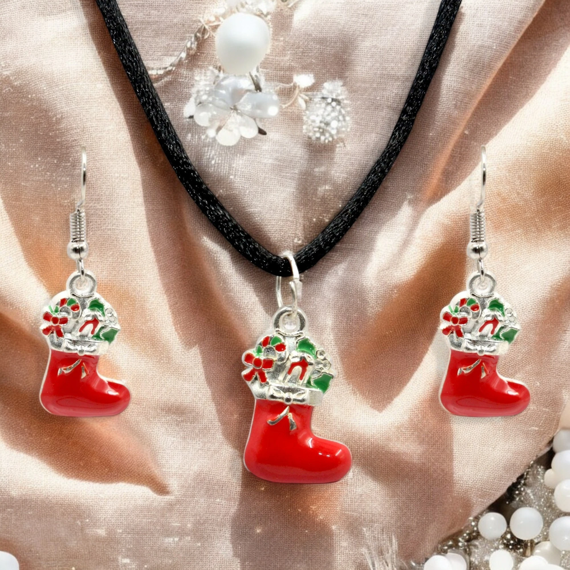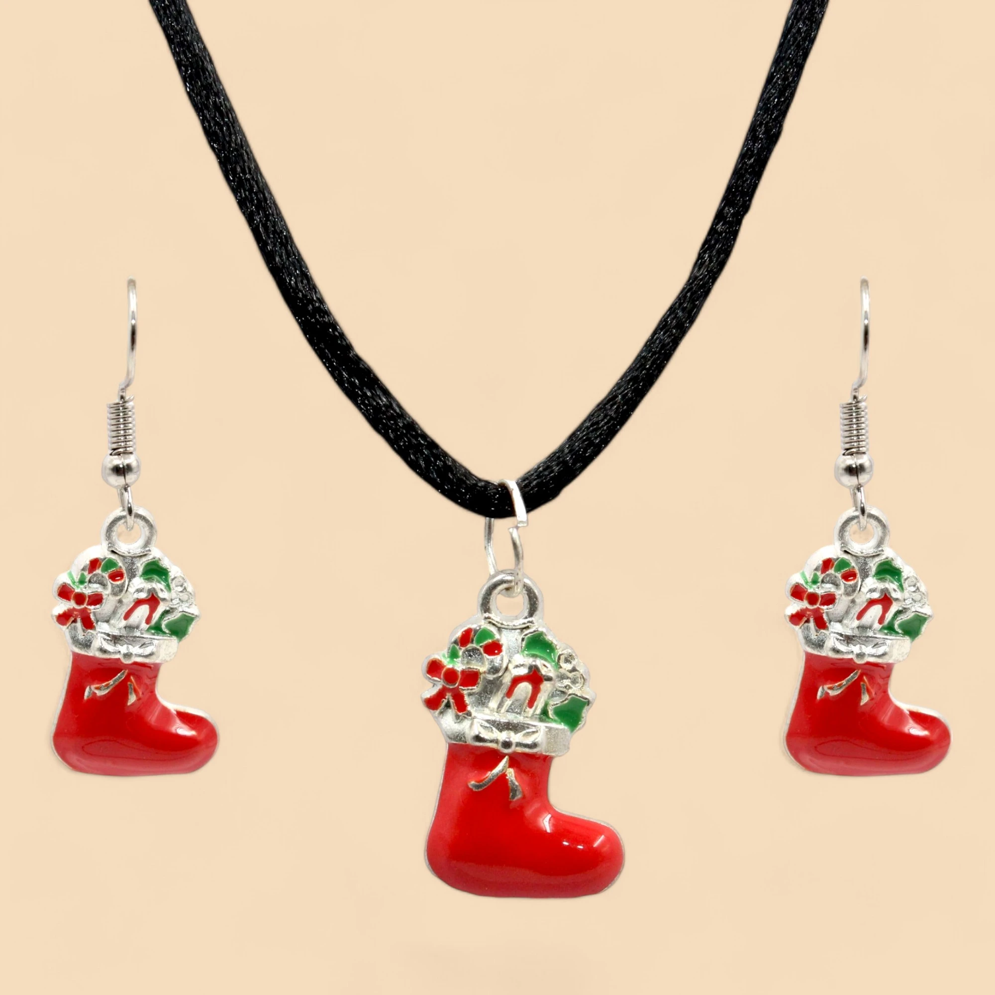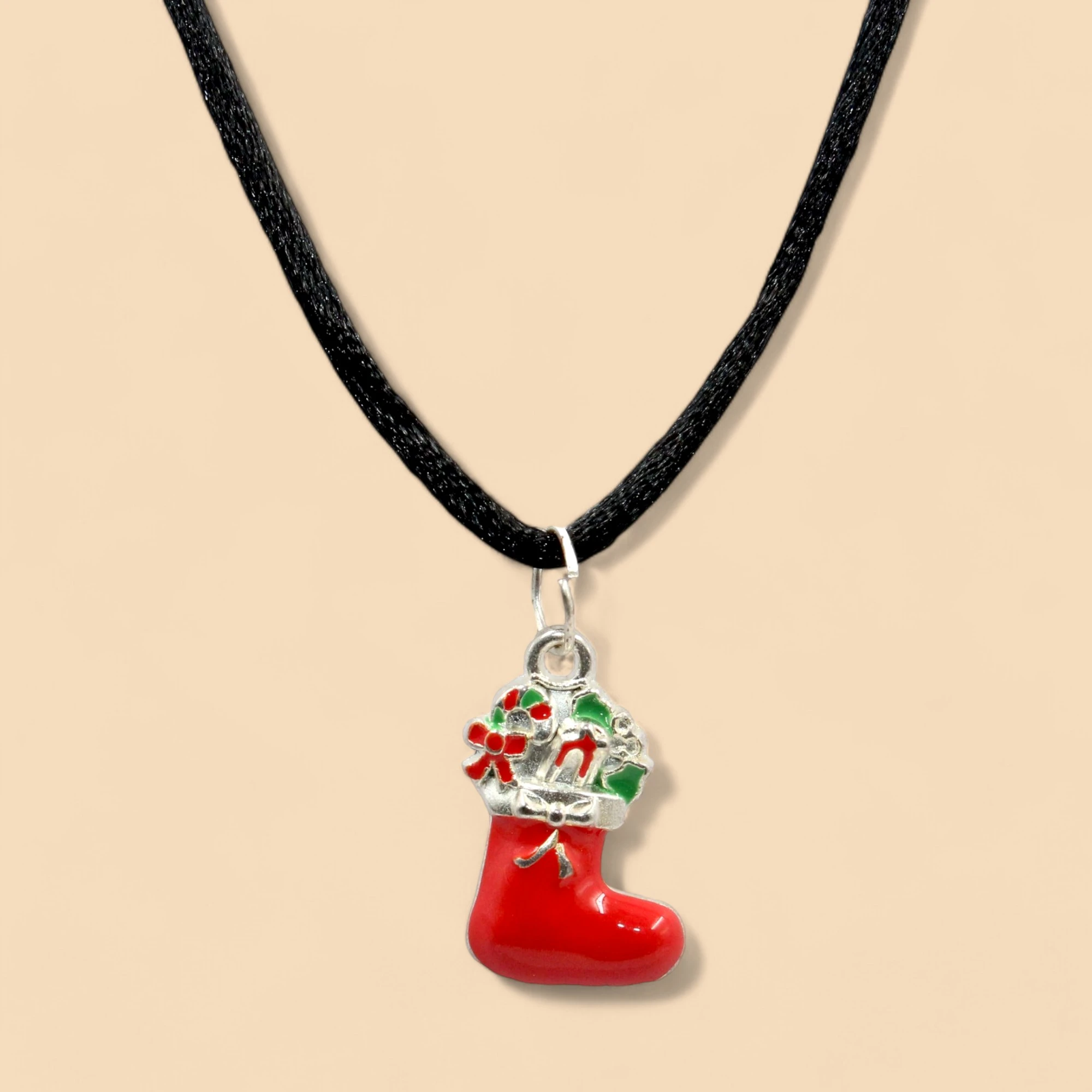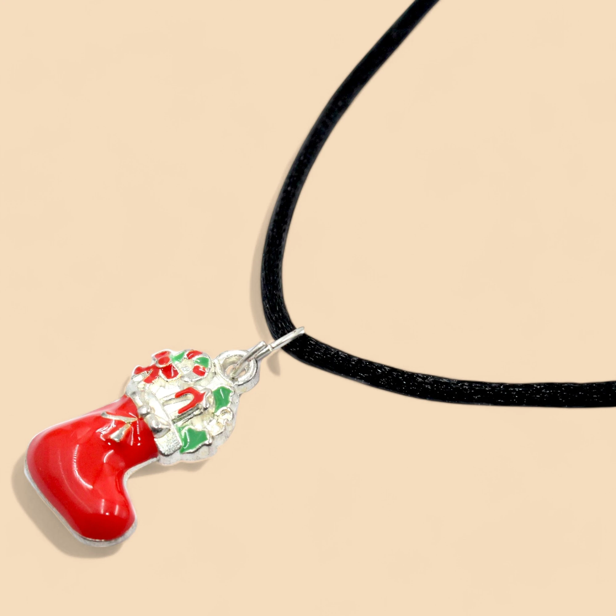 The image shows a festive pendant necklace featuring a red Christmas stocking charm. The charm is adorned with holiday-themed decorations, including a green holly leaf, a red bow, and a small candy cane. The pendant is attached to a black cord, giving it a simple yet elegant look. This necklace is perfect for adding a touch of holiday spirit to any outfit and makes a charming accessory for the Christmas season.