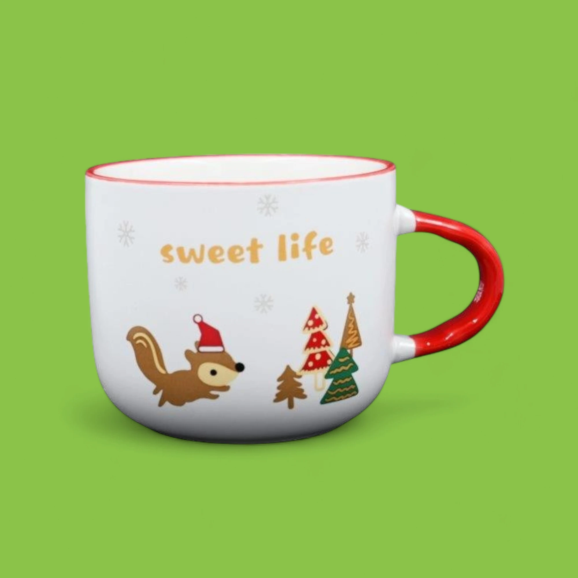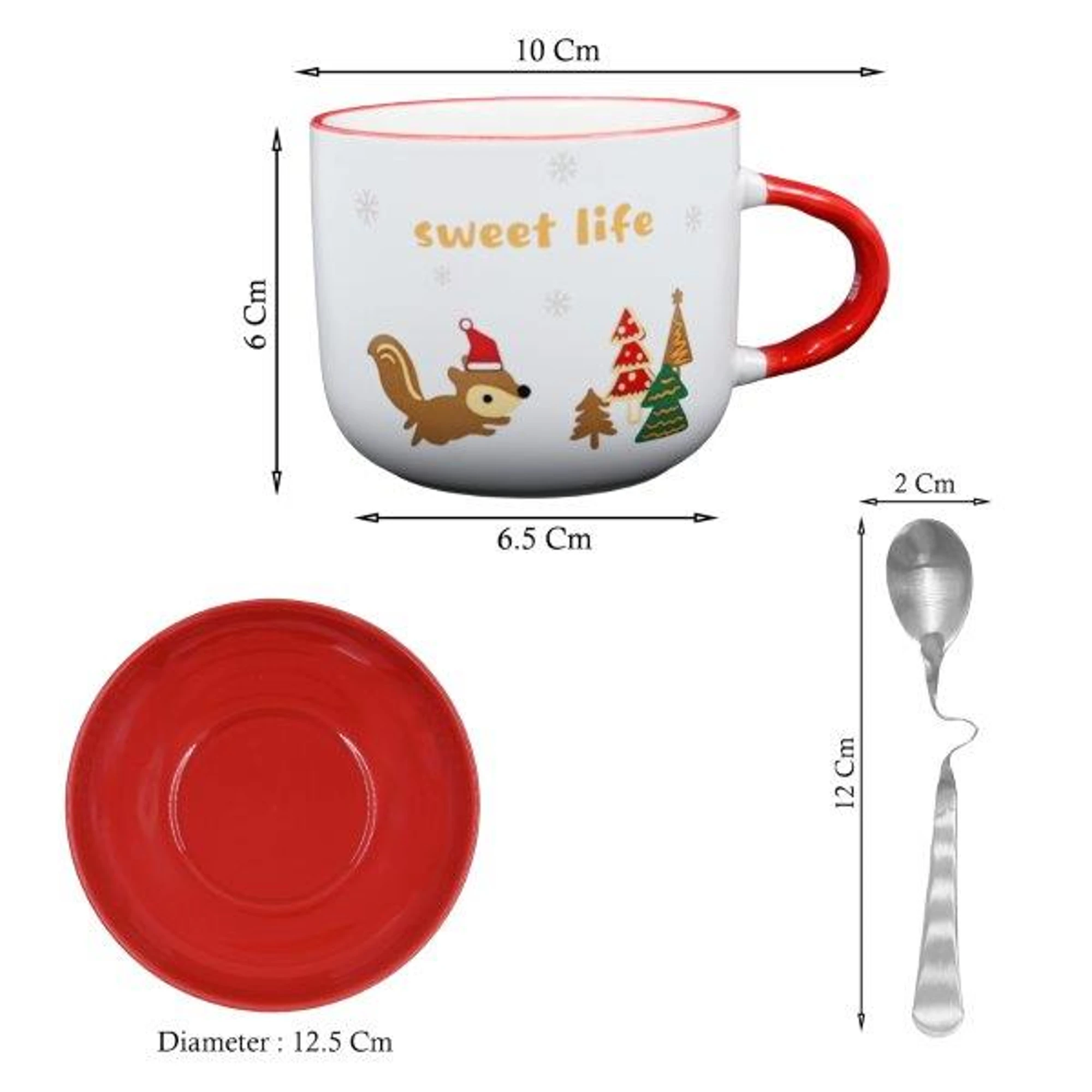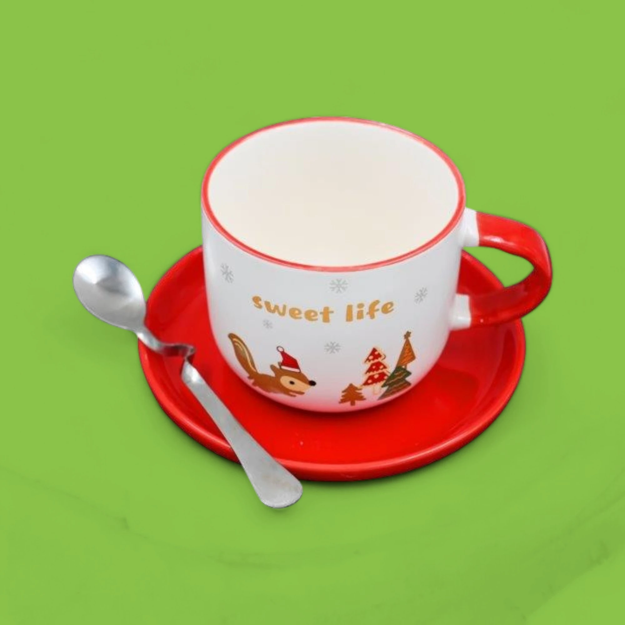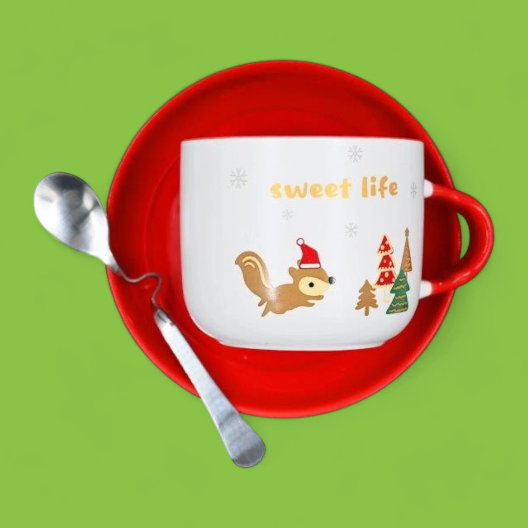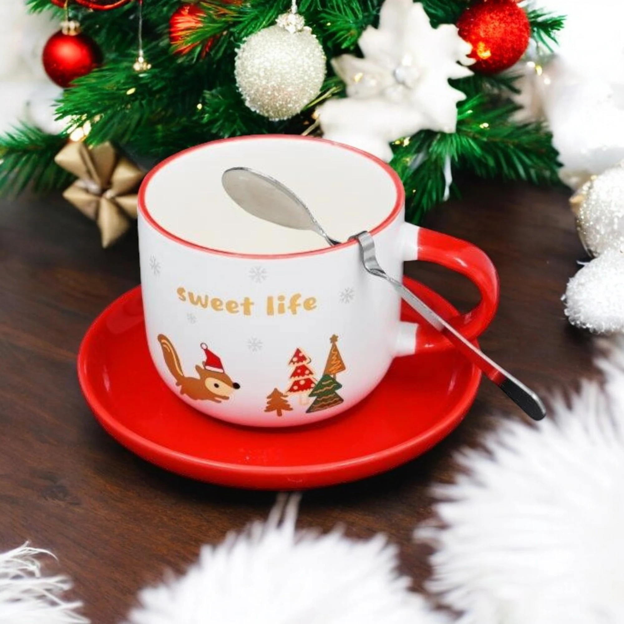 The image shows a festive-themed cup and saucer set accompanied by a spoon. The cup is predominantly white with a red rim and handle, and it features a cute illustration of a squirrel wearing a Santa hat, along with decorated Christmas trees. The text “sweet life” is printed on the cup in gold letters. The saucer is bright red, matching the cup’s handle and rim. The spoon is metallic and placed on the saucer. This set is interesting due to its cheerful holiday design, making it a delightful addition to festive table settings.
