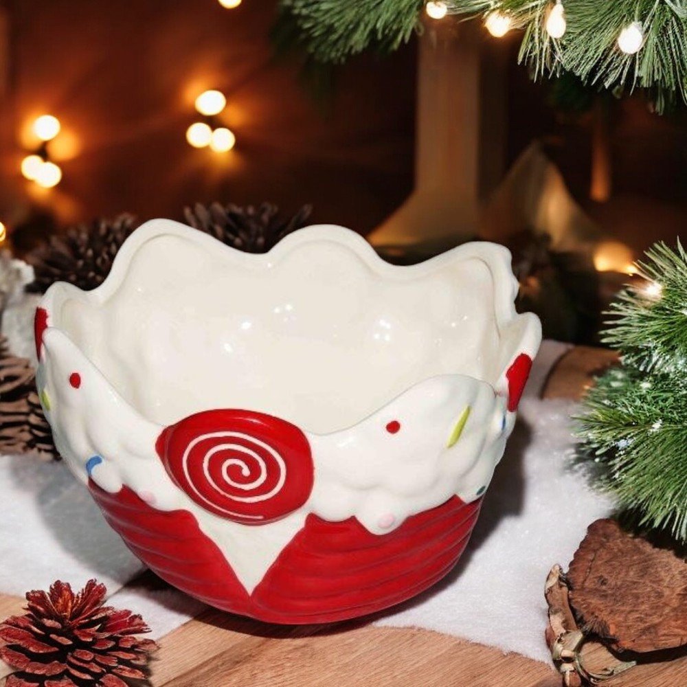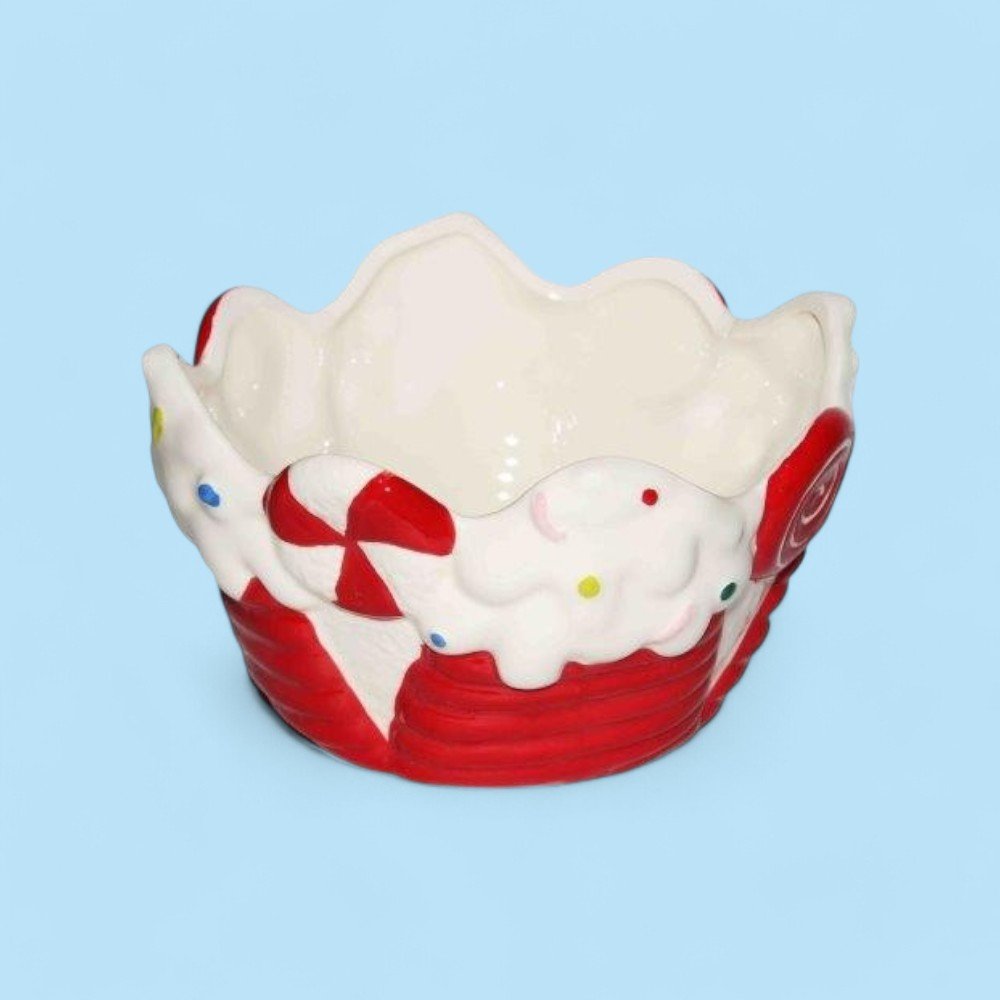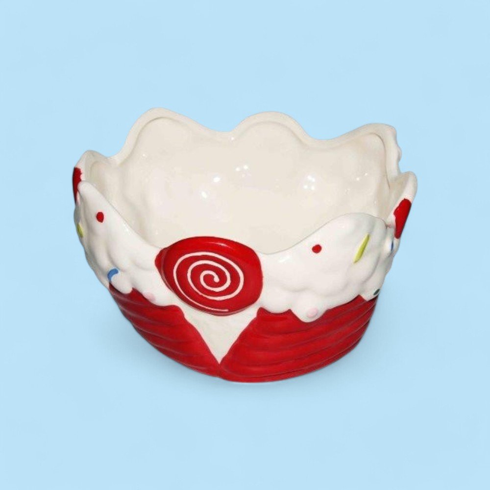 The image shows a decorative ceramic bowl with a festive design, resembling a cupcake. The bowl has a wavy rim and is primarily white on the inside. The exterior is designed with a red base that mimics a cupcake liner with a textured pattern. The upper part of the bowl features a white, icing-like design, complete with colorful sprinkles and a red swirl candy motif in the center. This bowl is perfect for holiday celebrations, adding a whimsical and festive touch to your table settings or seasonal decor.