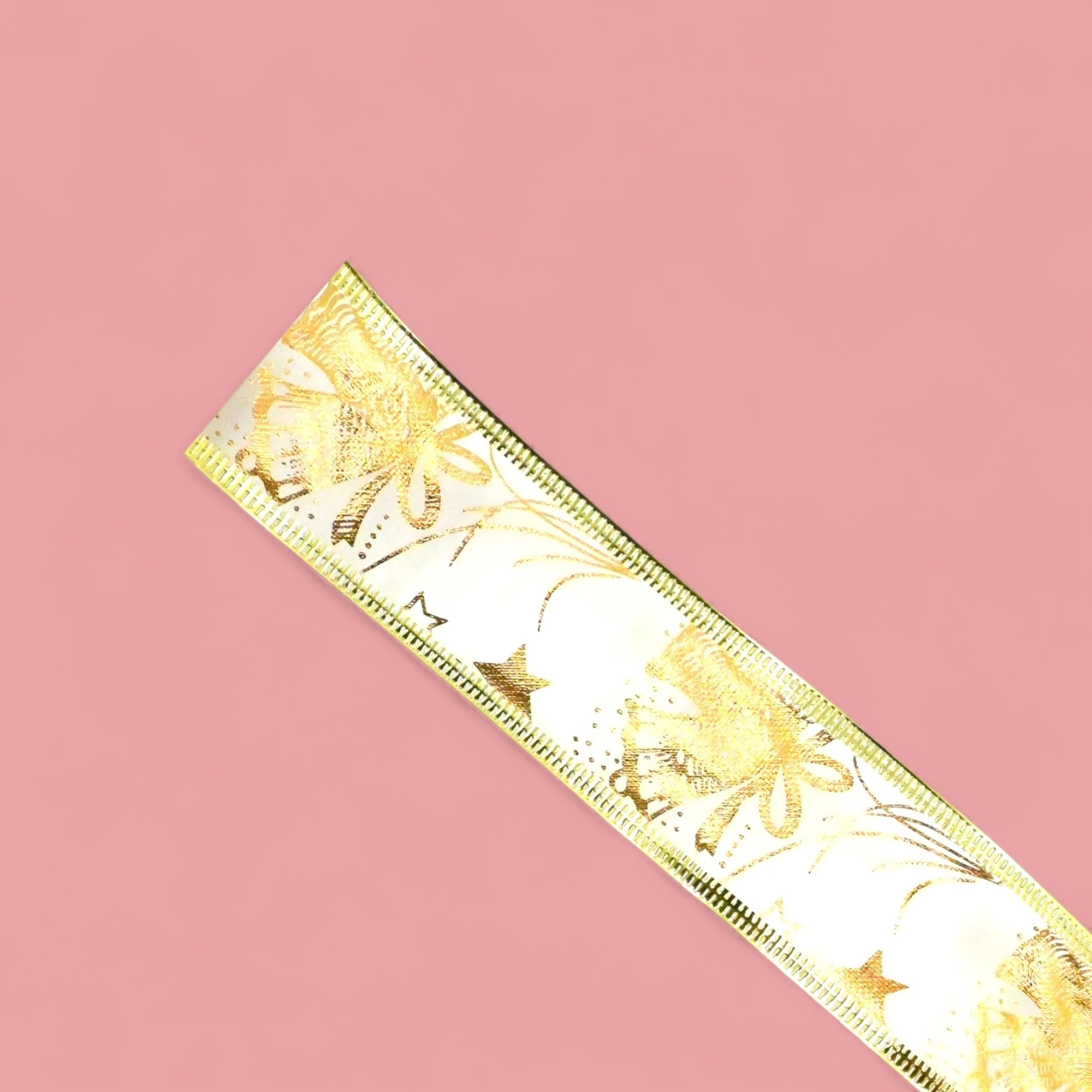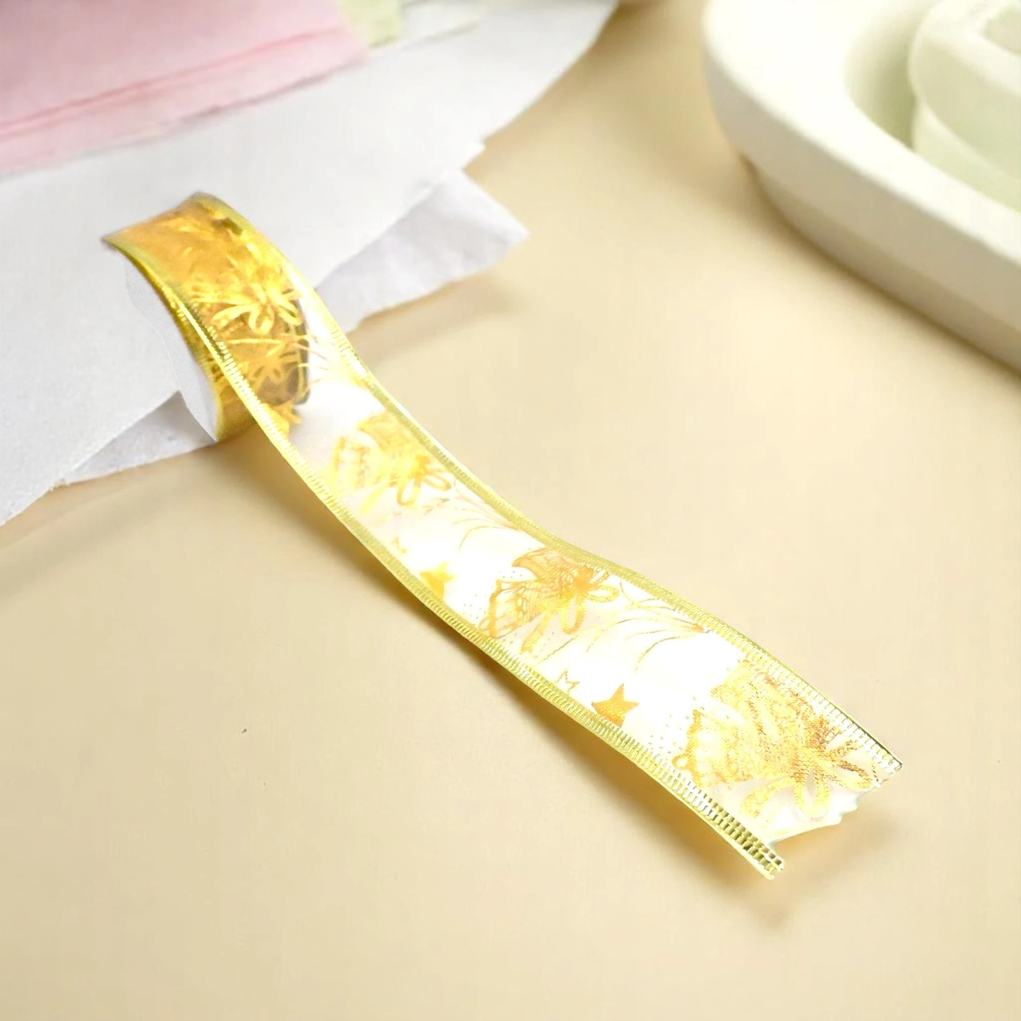 Lustrous Design: Gleaming with a golden hue, the elegant bell motifs on this organza ribbon create a striking visual impact wherever ites used.