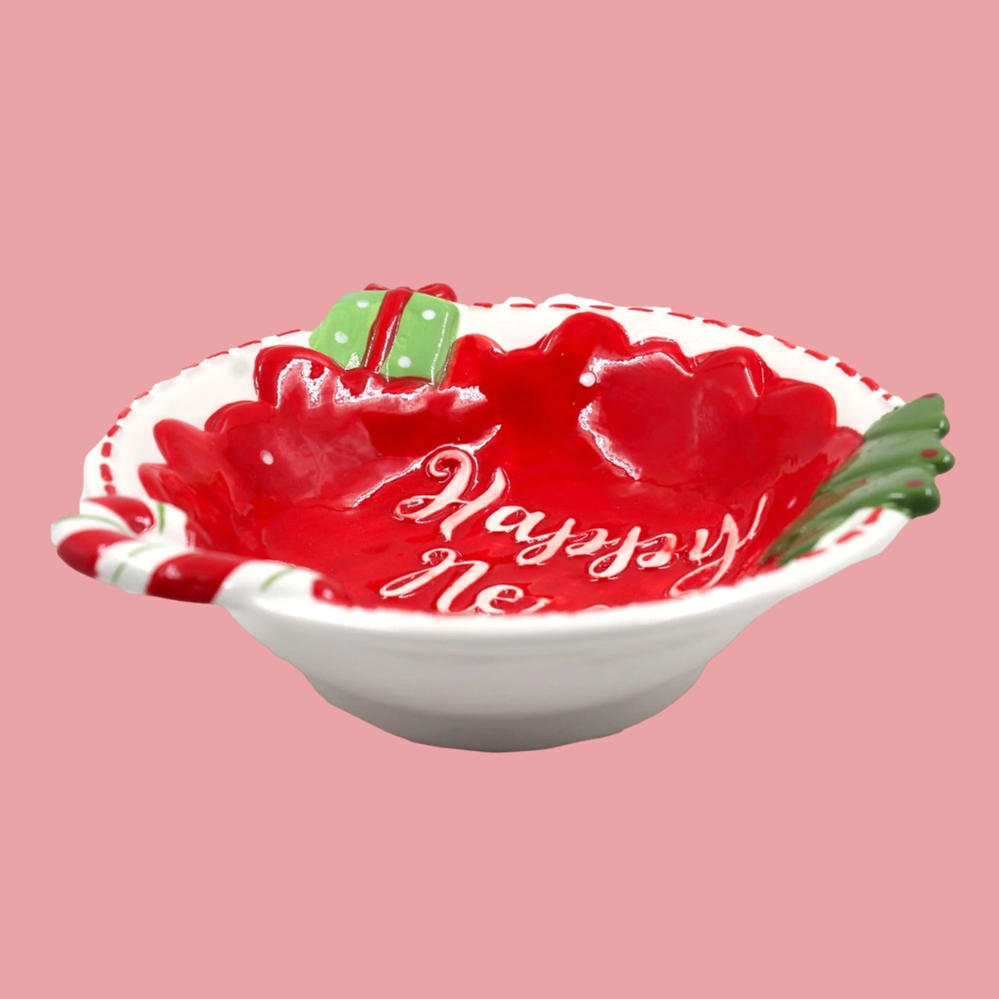 Get ready to impress your guests with this delightful festive serving dish set, perfect for holiday gatherings. The HO HO Santa Serving Plate makes every appetizer a merry delight, featuring a whimsical Santa design that’s sure to bring smiles. Complementing this is the Happy New Year Snack Bowl in a vibrant red, ideal for serving your favorite snacks and treats with a pop of color.