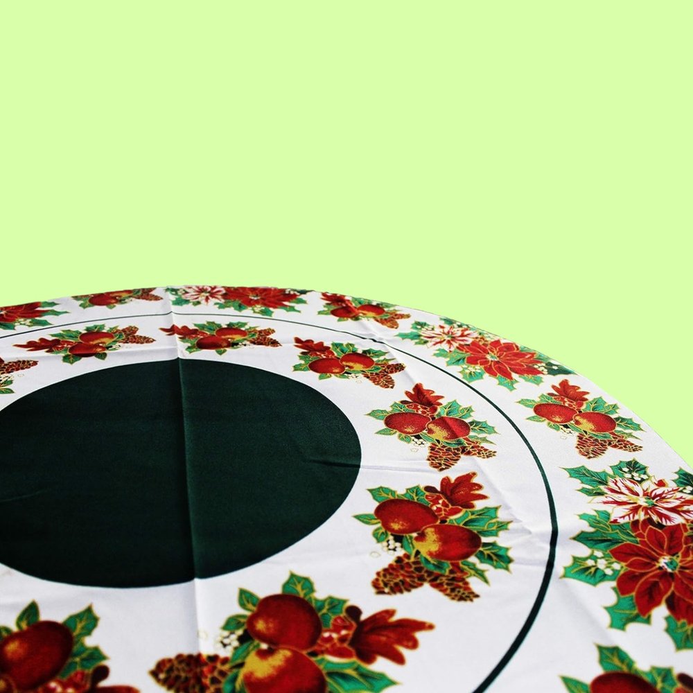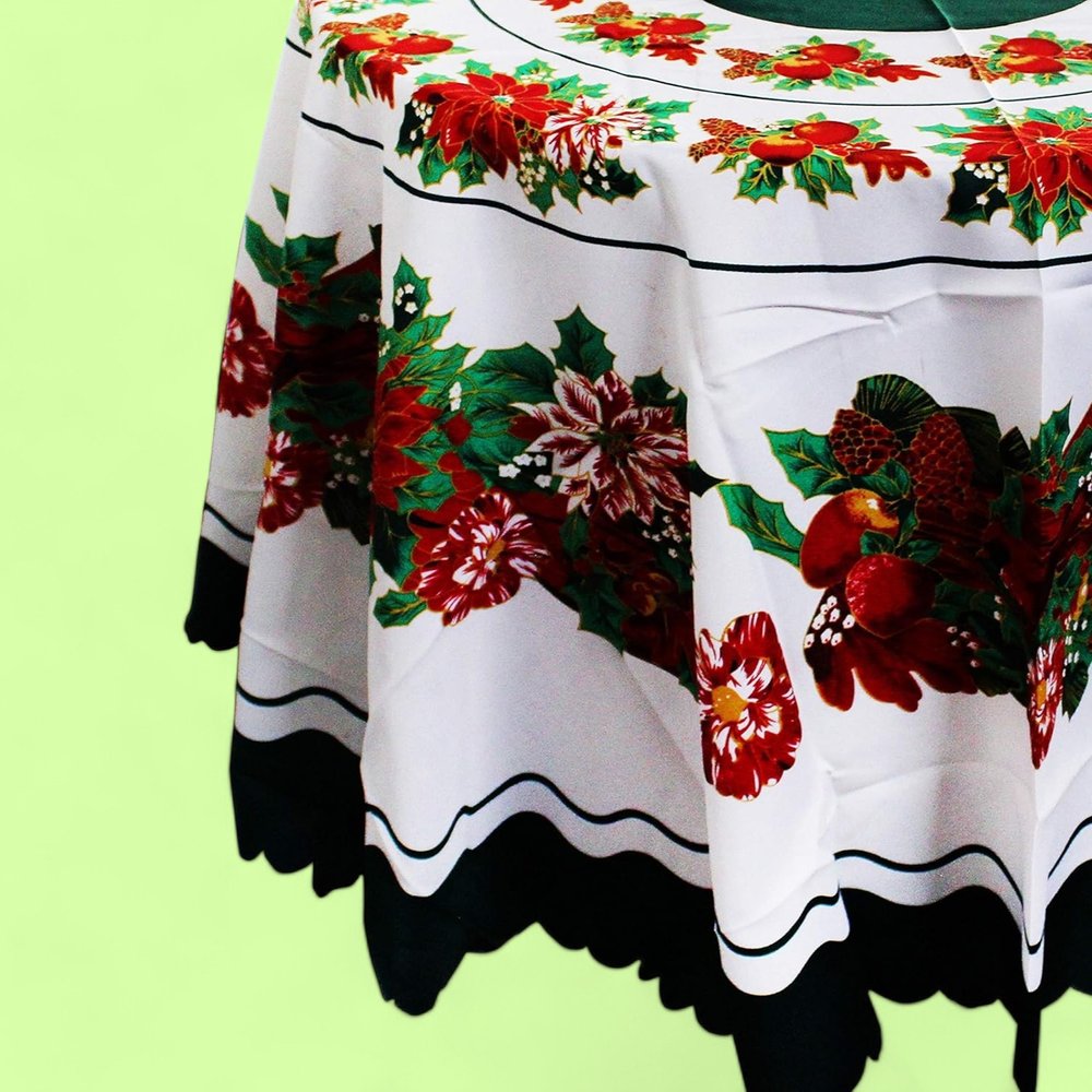 This image showcases a round table adorned with a festive holiday tablecloth. The tablecloth features a vibrant design with red poinsettias, green holly leaves, and pine cones, creating a cheerful and seasonal atmosphere. The table is set in a cozy living room with two beige armchairs on either side, and twinkling fairy lights in the background, enhancing the warm and inviting ambiance. This setting is perfect for holiday gatherings and celebrations, adding a touch of festive charm to any home.