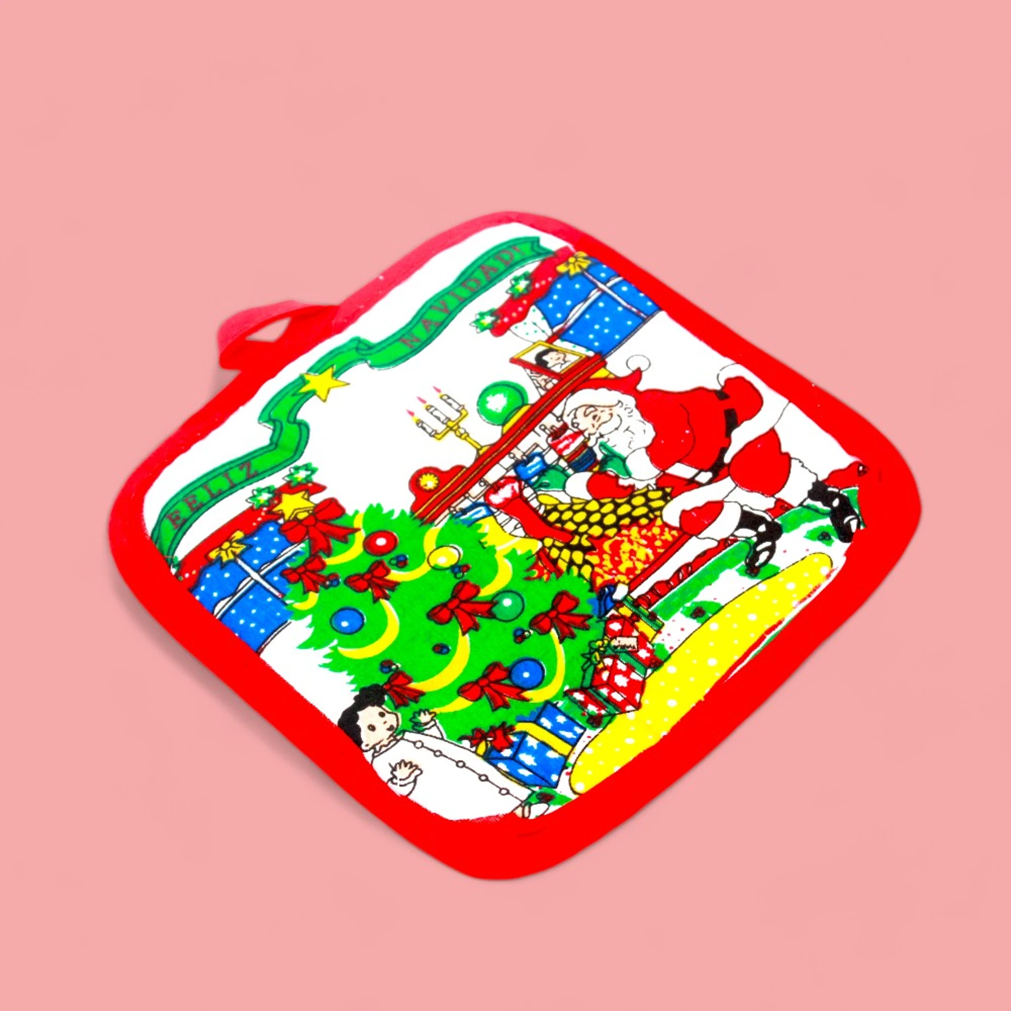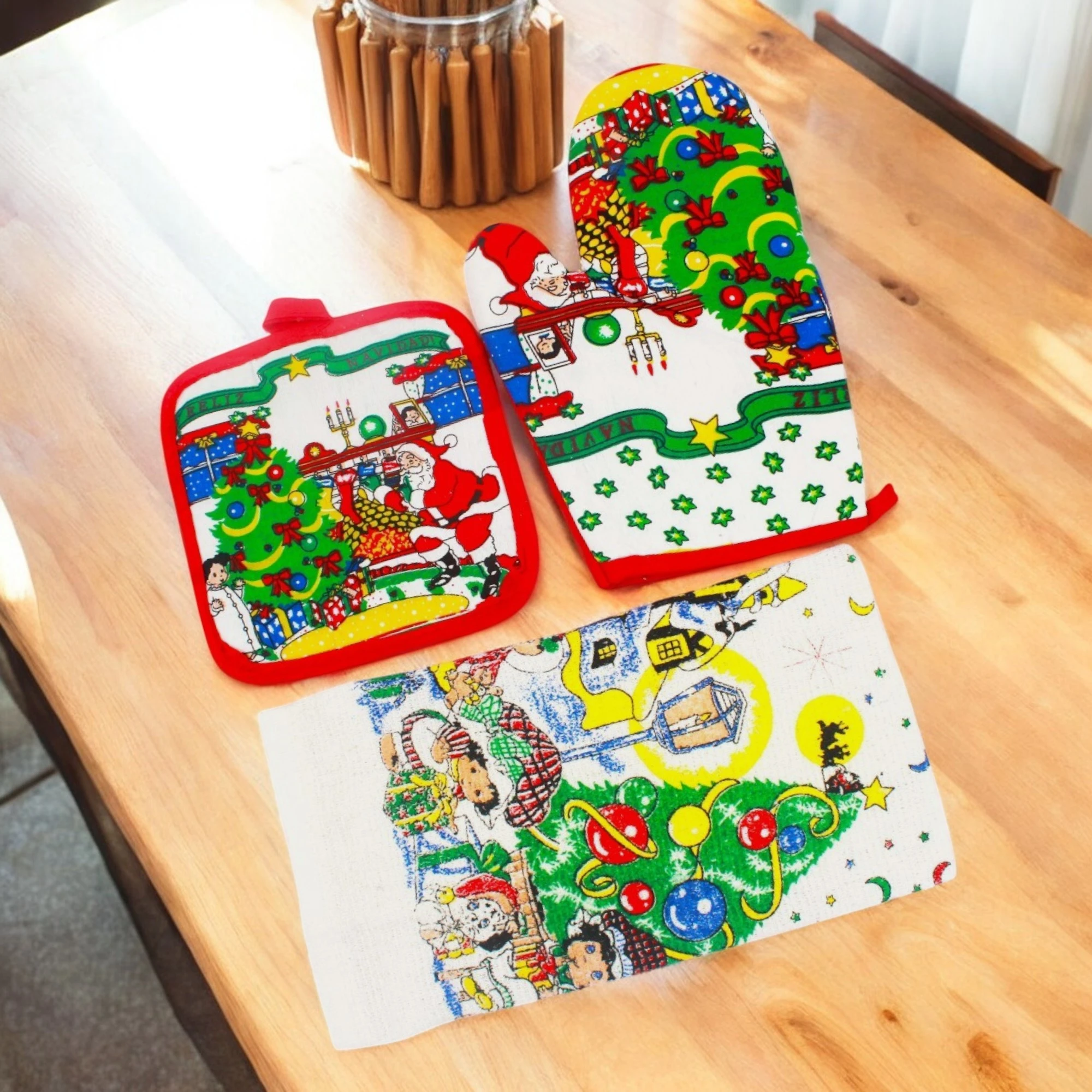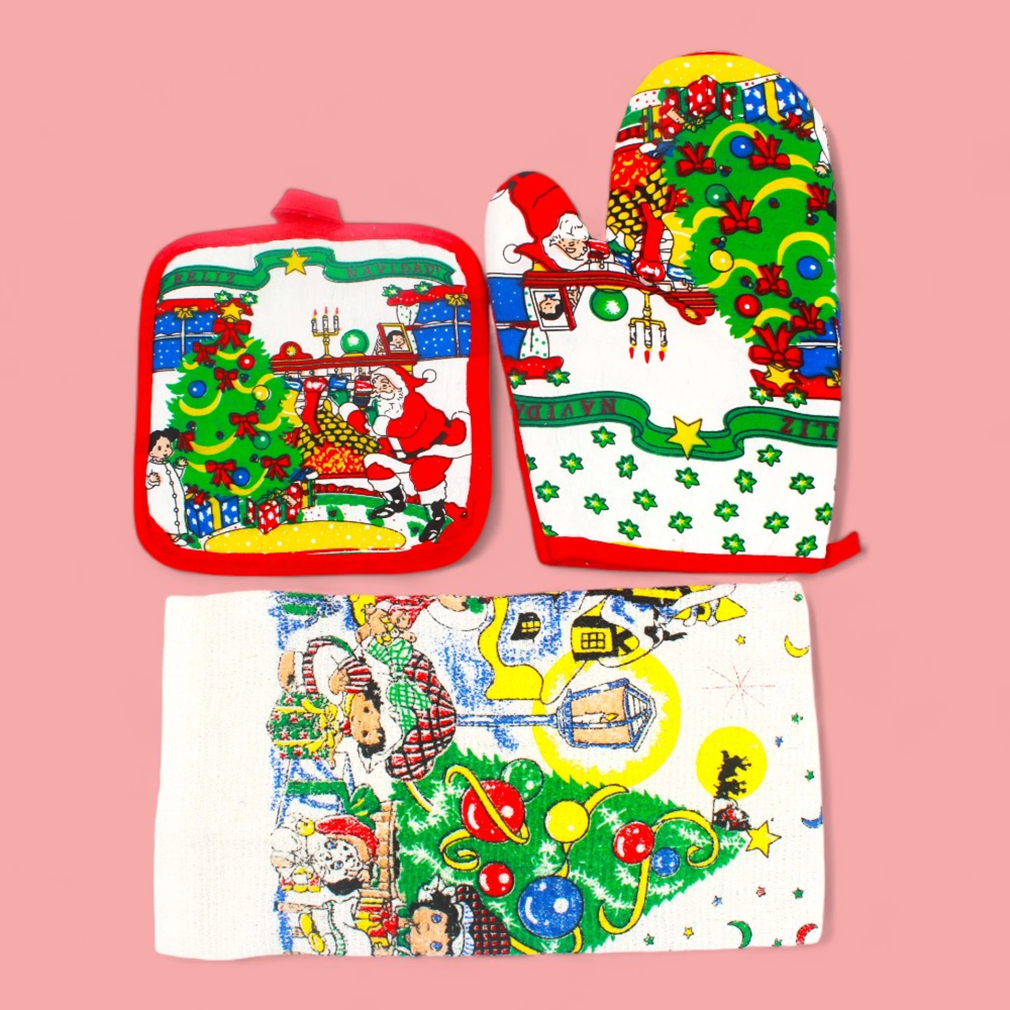 The image displays three kitchen accessories with a Christmas theme against a pink background. The items include a square pot holder, an oven mitt, and a kitchen towel. Each item features colorful illustrations of Santa Claus, Christmas trees, and festive decorations. The pot holder and oven mitt have a similar design, showing Santa Claus with a Christmas tree and presents. The kitchen towel has a more detailed scene, including a decorated Christmas tree, Santa Claus, and a snowy village with houses and a sleigh. These accessories are interesting and relevant as they add a festive touch to holiday cooking and baking activities.