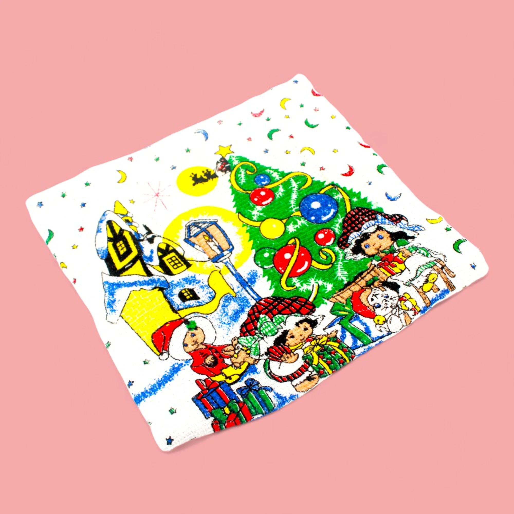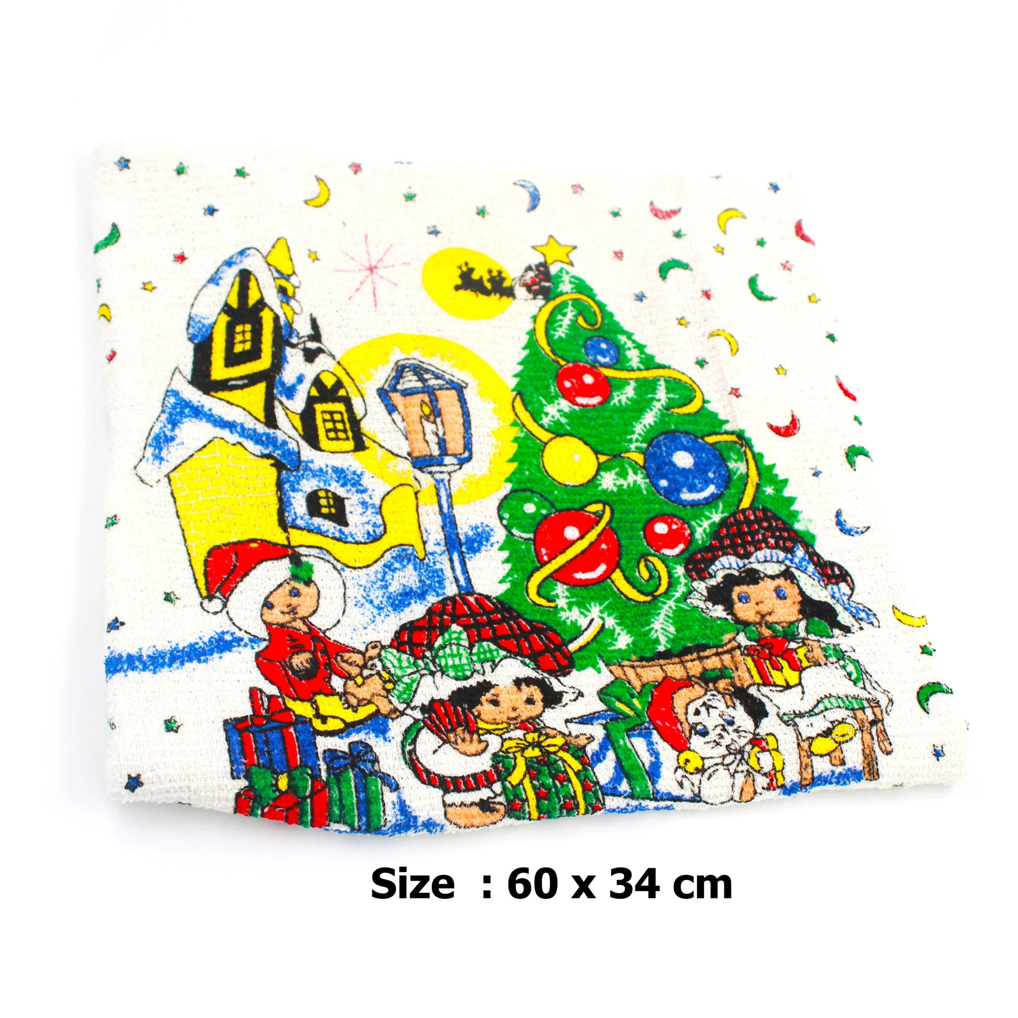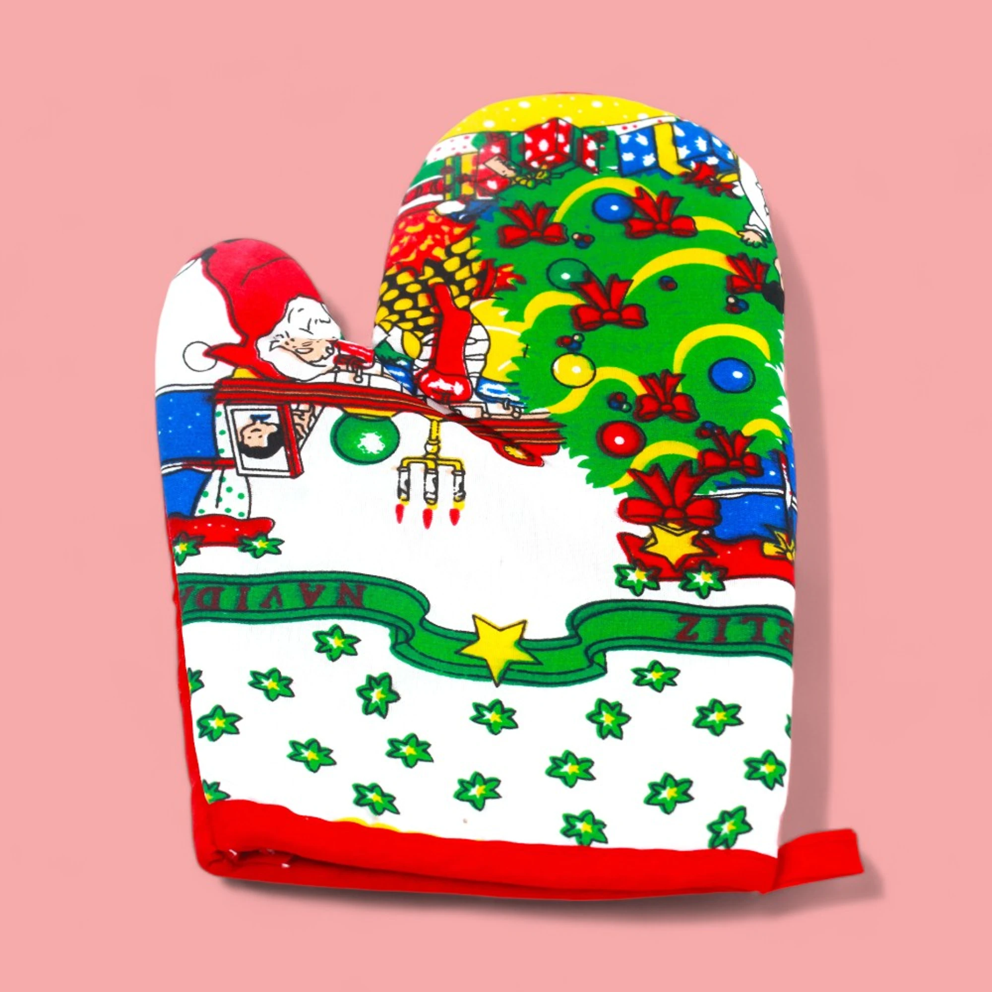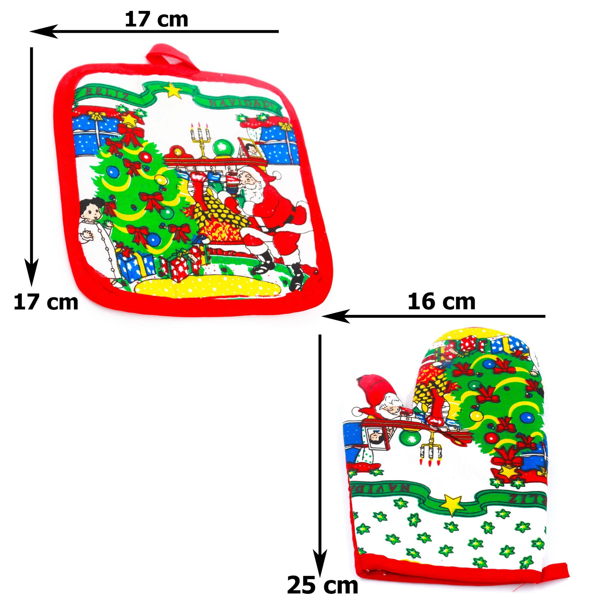 The image displays three kitchen accessories with a Christmas theme against a pink background. The items include a square pot holder, an oven mitt, and a kitchen towel. Each item features colorful illustrations of Santa Claus, Christmas trees, and festive decorations. The pot holder and oven mitt have a similar design, showing Santa Claus with a Christmas tree and presents. The kitchen towel has a more detailed scene, including a decorated Christmas tree, Santa Claus, and a snowy village with houses and a sleigh. These accessories are interesting and relevant as they add a festive touch to holiday cooking and baking activities.