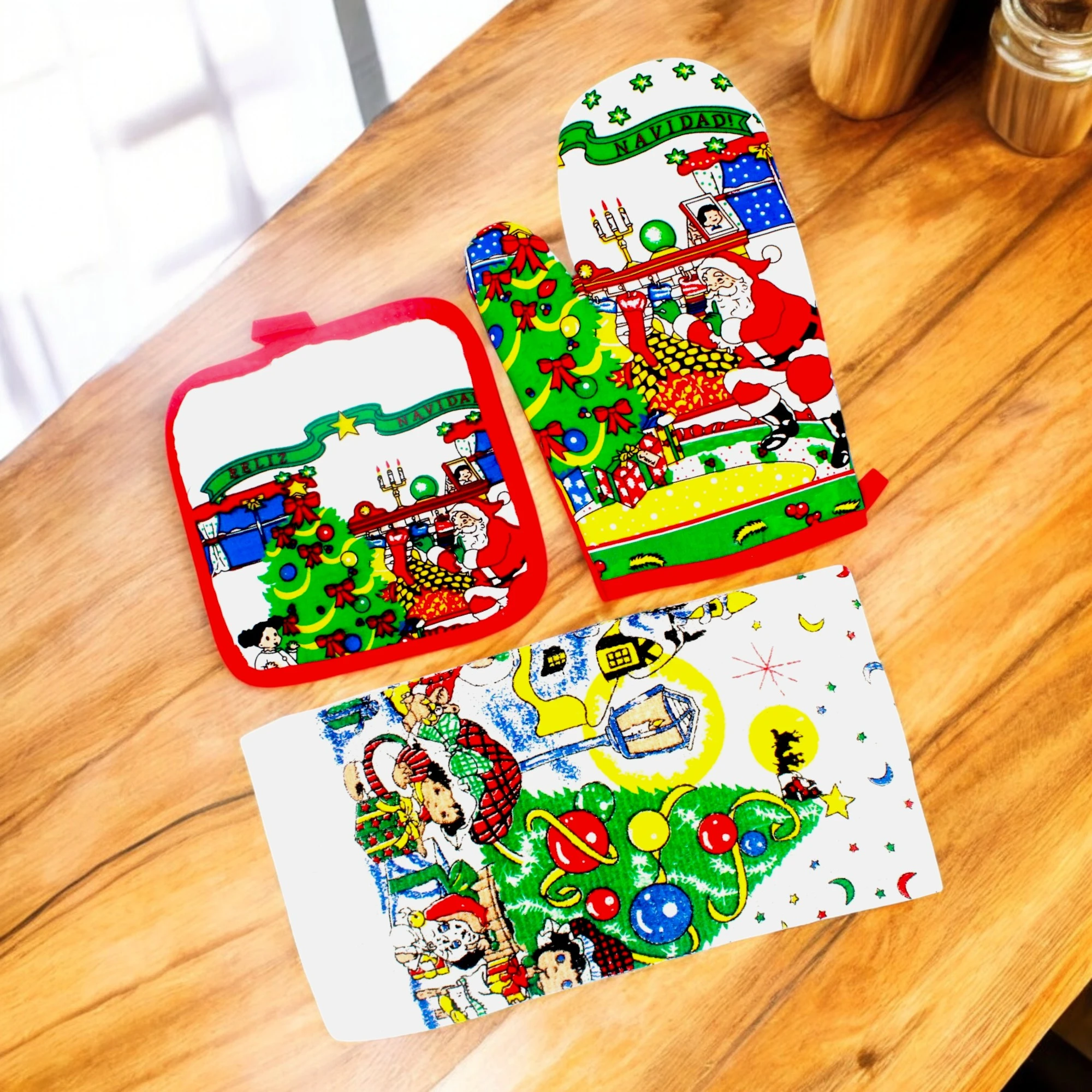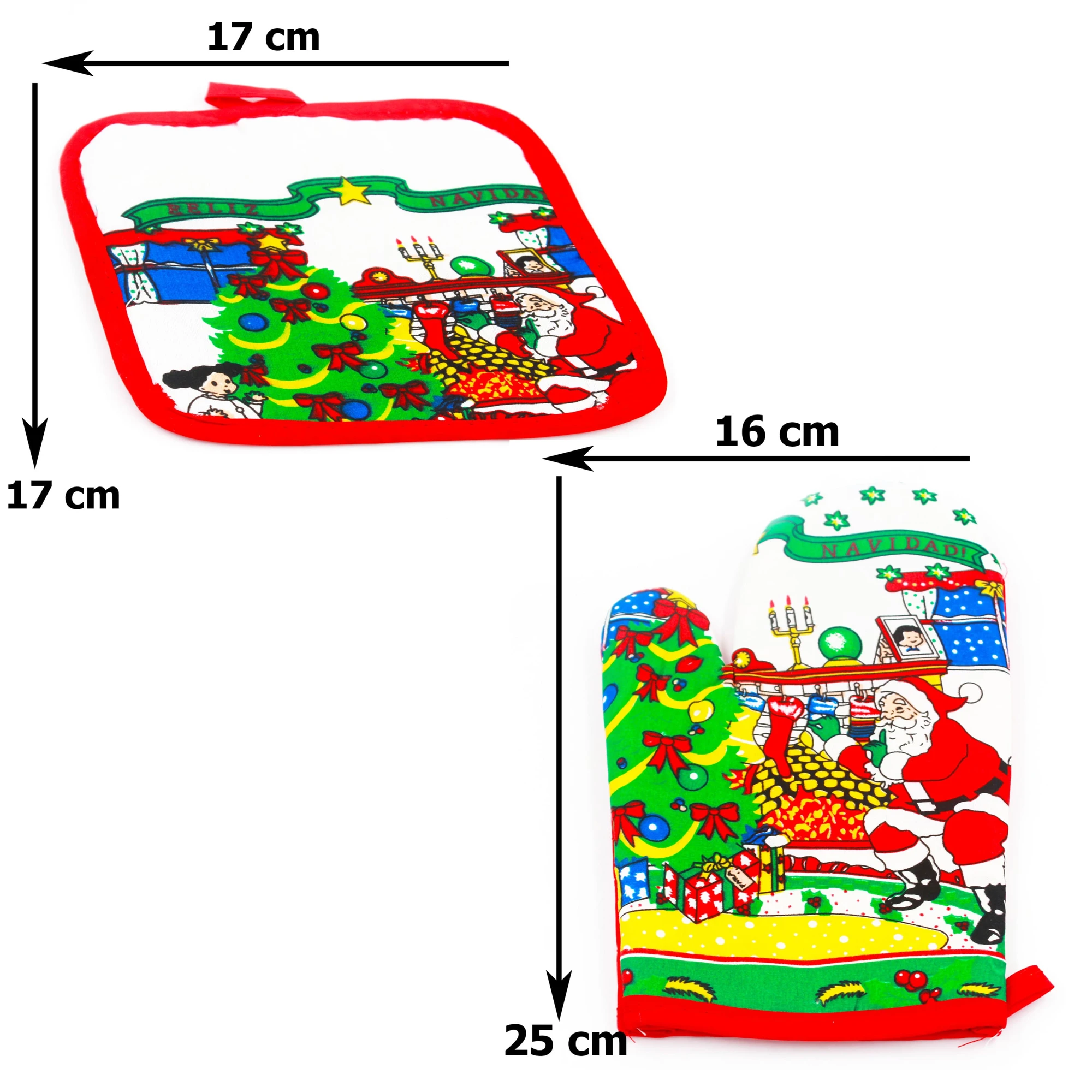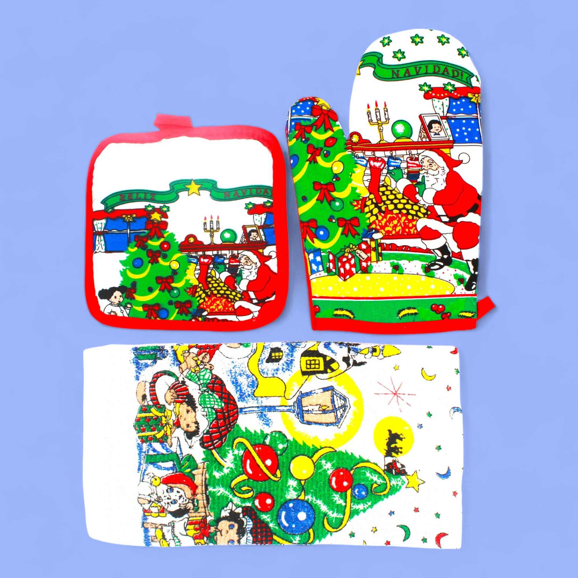 The image displays three kitchen accessories with a Christmas theme against a pink background. The items include a square pot holder, an oven mitt, and a kitchen towel. Each item features colorful illustrations of Santa Claus, Christmas trees, and festive decorations. The pot holder and oven mitt have a similar design, showing Santa Claus with a Christmas tree and presents. The kitchen towel has a more detailed scene, including a decorated Christmas tree, Santa Claus, and a snowy village with houses and a sleigh. These accessories are interesting and relevant as they add a festive touch to holiday cooking and baking activities.