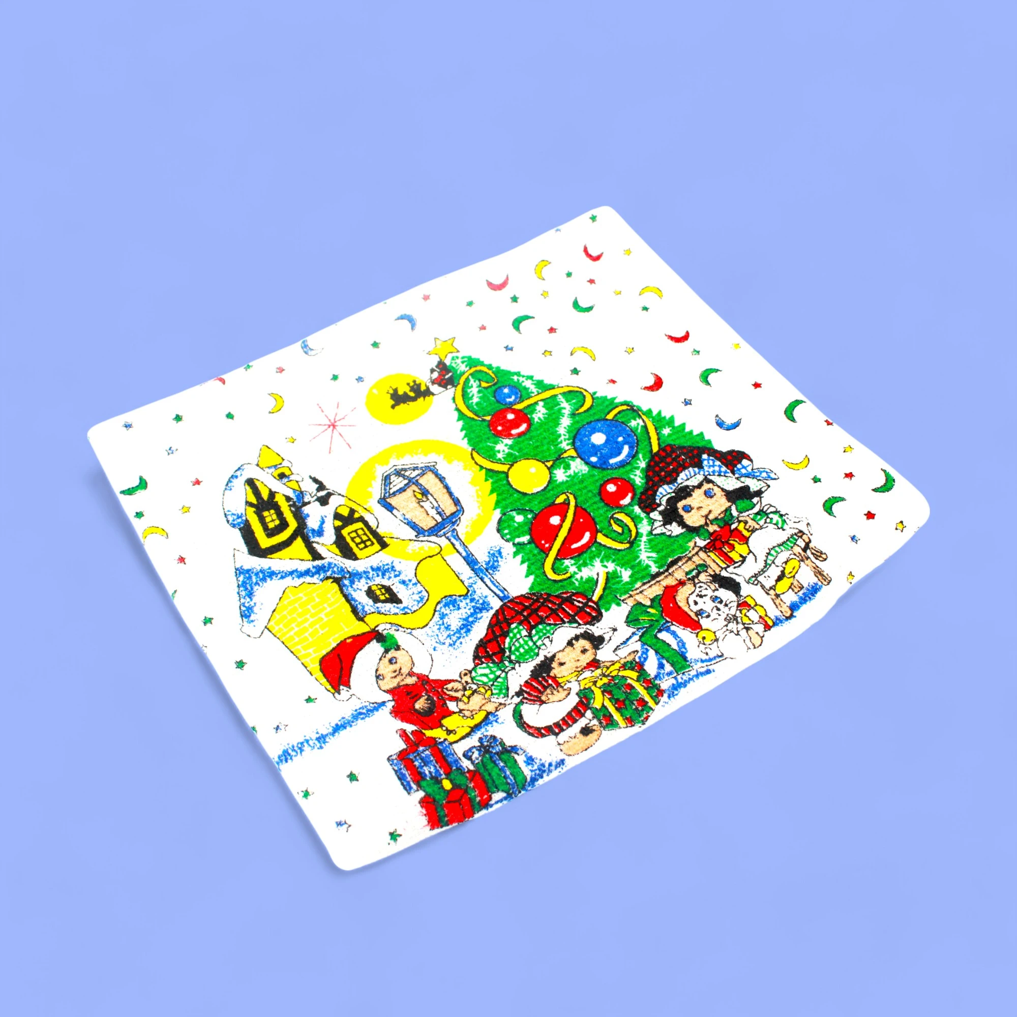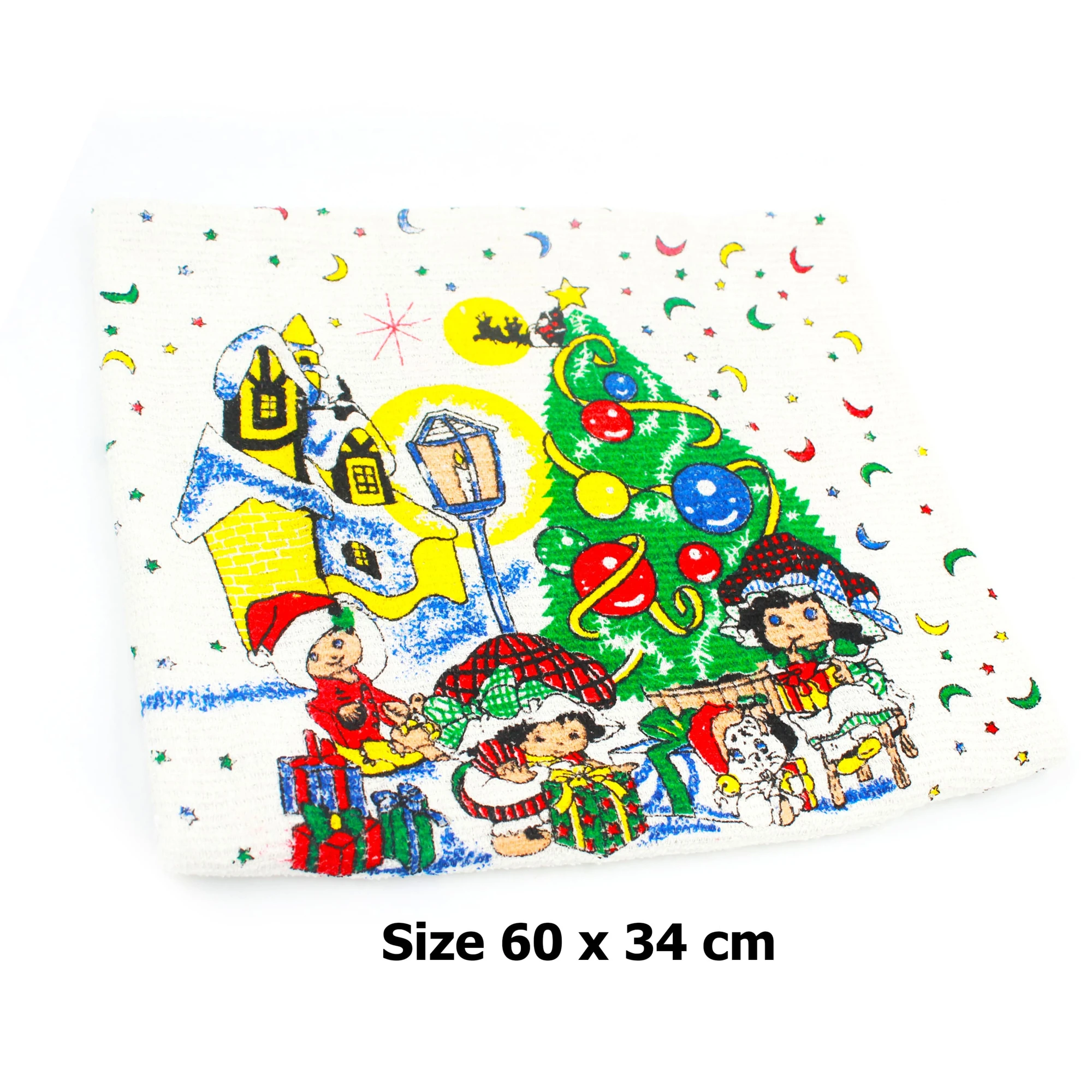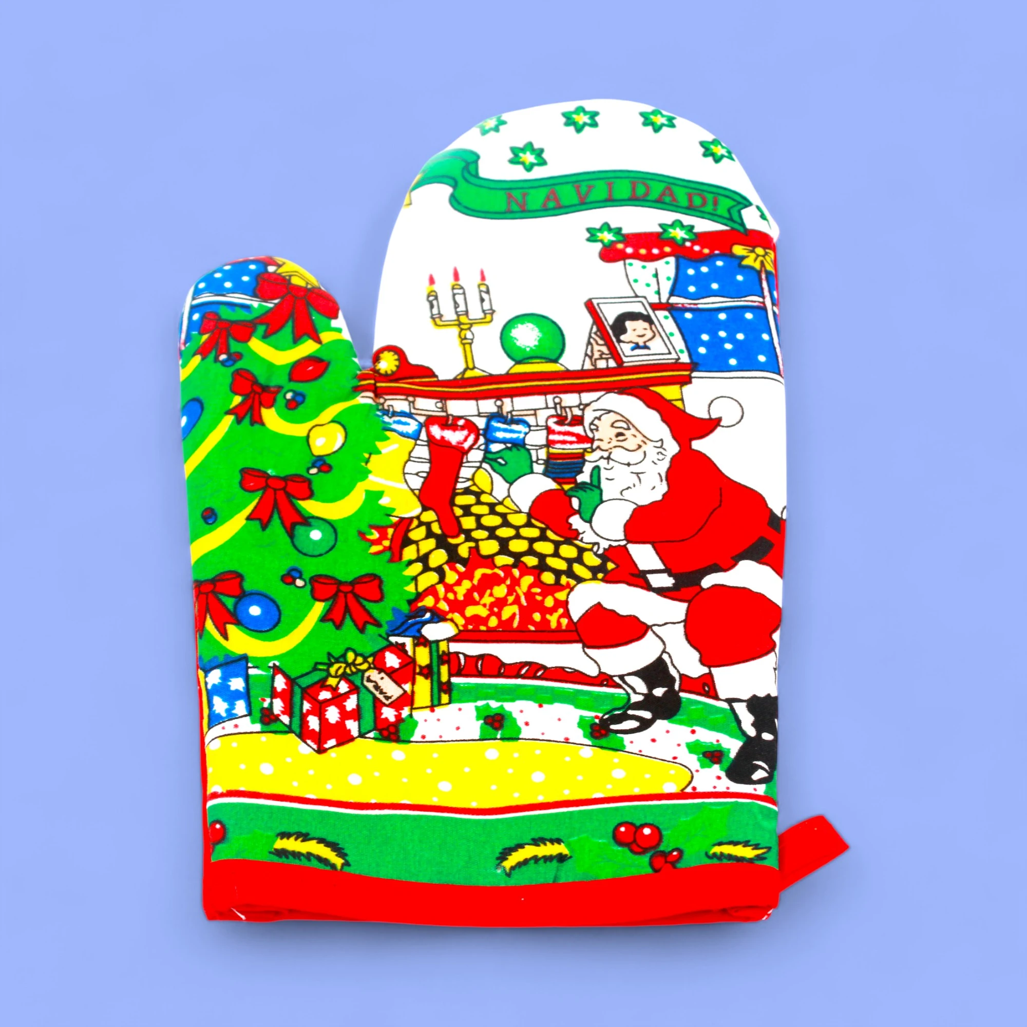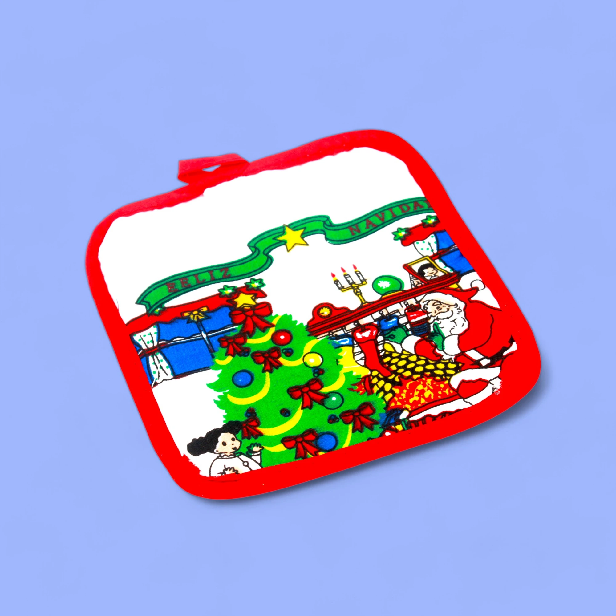 The image displays three kitchen accessories with a Christmas theme against a pink background. The items include a square pot holder, an oven mitt, and a kitchen towel. Each item features colorful illustrations of Santa Claus, Christmas trees, and festive decorations. The pot holder and oven mitt have a similar design, showing Santa Claus with a Christmas tree and presents. The kitchen towel has a more detailed scene, including a decorated Christmas tree, Santa Claus, and a snowy village with houses and a sleigh. These accessories are interesting and relevant as they add a festive touch to holiday cooking and baking activities.