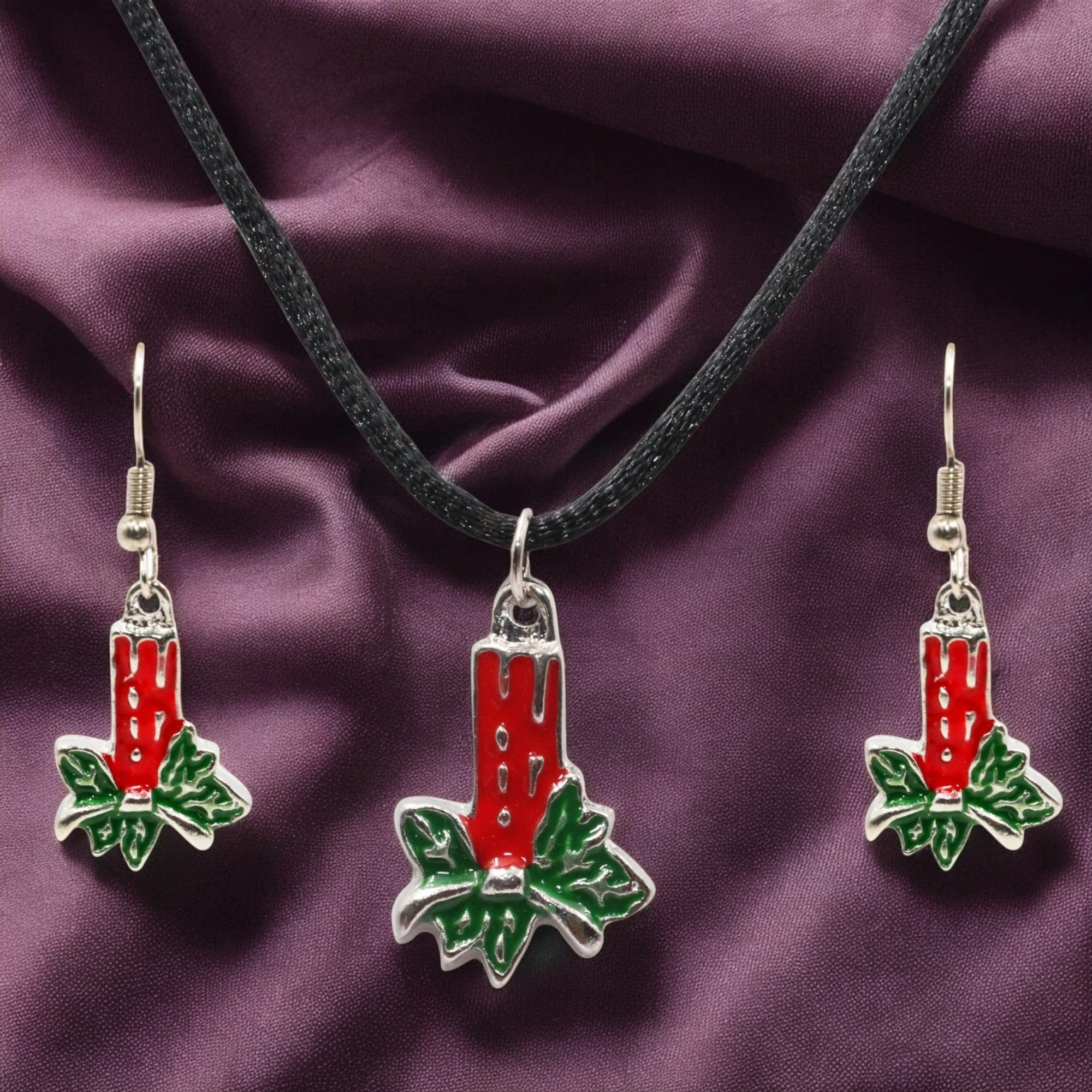 This image showcases a matching jewelry set consisting of a necklace and a pair of earrings. The set features a festive design with red and green enamel charms. Each charm is shaped like a red candle with green holly leaves at the base, symbolizing a holiday theme. The necklace has a black cord, while the earrings have silver hooks. This set is perfect for adding a touch of holiday spirit to any outfit.