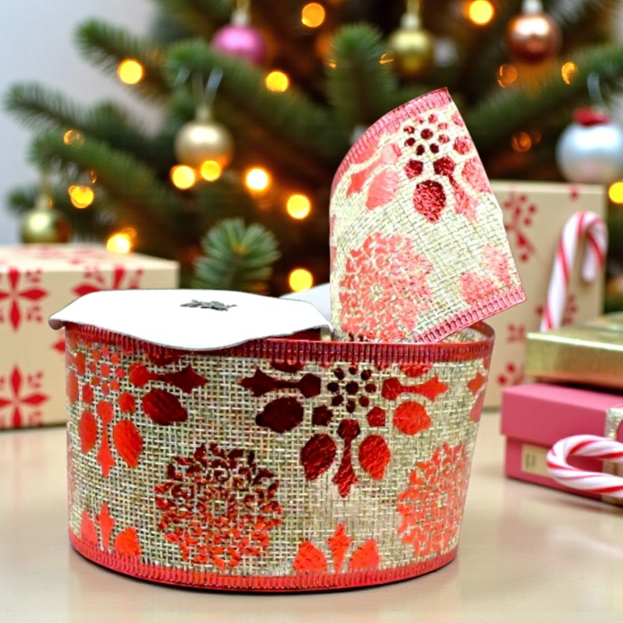 This ribbon combines rustic charm and festive glamour, making it an ideal choice for adding that special something to your Christmas projects. Whether wrapping presents or decorating your tree, this ribbon brings a sophisticated yet classic look to your holiday season. Easy to handle, it’s crafted to ensure that your Decor stands out in the most delightful way.