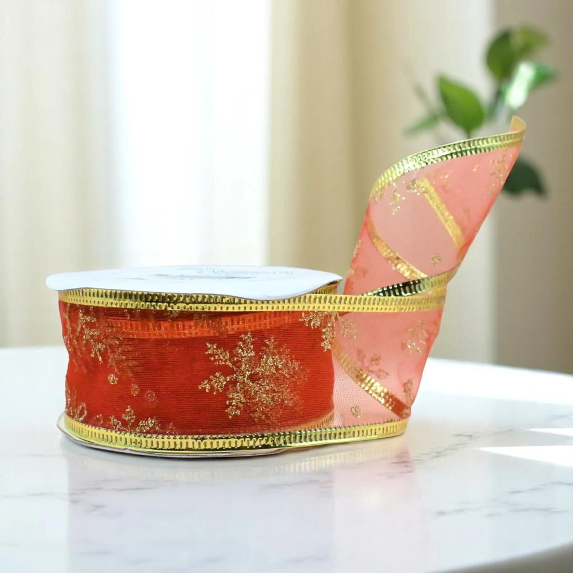Adorn your Christmas tree with classic beauty, drape it around wreaths, or tie it around special presents for a heartwarming touch. The rich red color is accented with delicate snowflake patterns that shimmer under holiday lights, creating a magical winter wonderland ambiance.