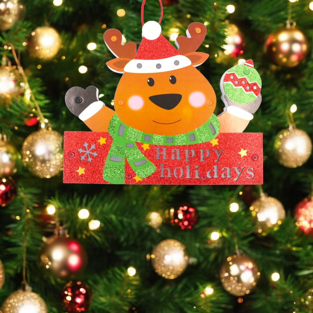 This image features a charming Christmas ornament in the shape of a reindeer, adorned with festive decorations. The reindeer is wearing a red Santa hat and a green glittery scarf, and is holding a green and red ornament in one hand. The reindeer is smiling and has rosy cheeks, adding to its cheerful appearance. The ornament is hanging on a beautifully decorated Christmas tree with golden and red baubles. The sign held by the reindeer reads “Happy Holidays” in glittery red letters, making it a perfect addition to holiday decorations. The vibrant colors and festive elements make this ornament a delightful and eye-catching piece for the holiday season.