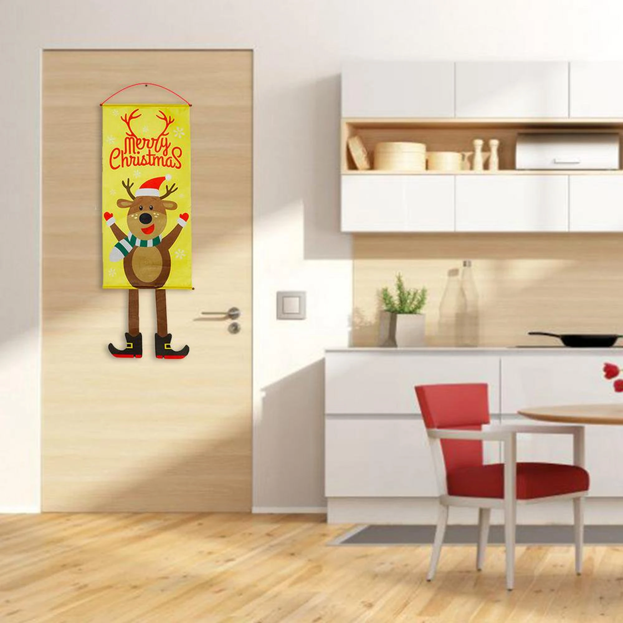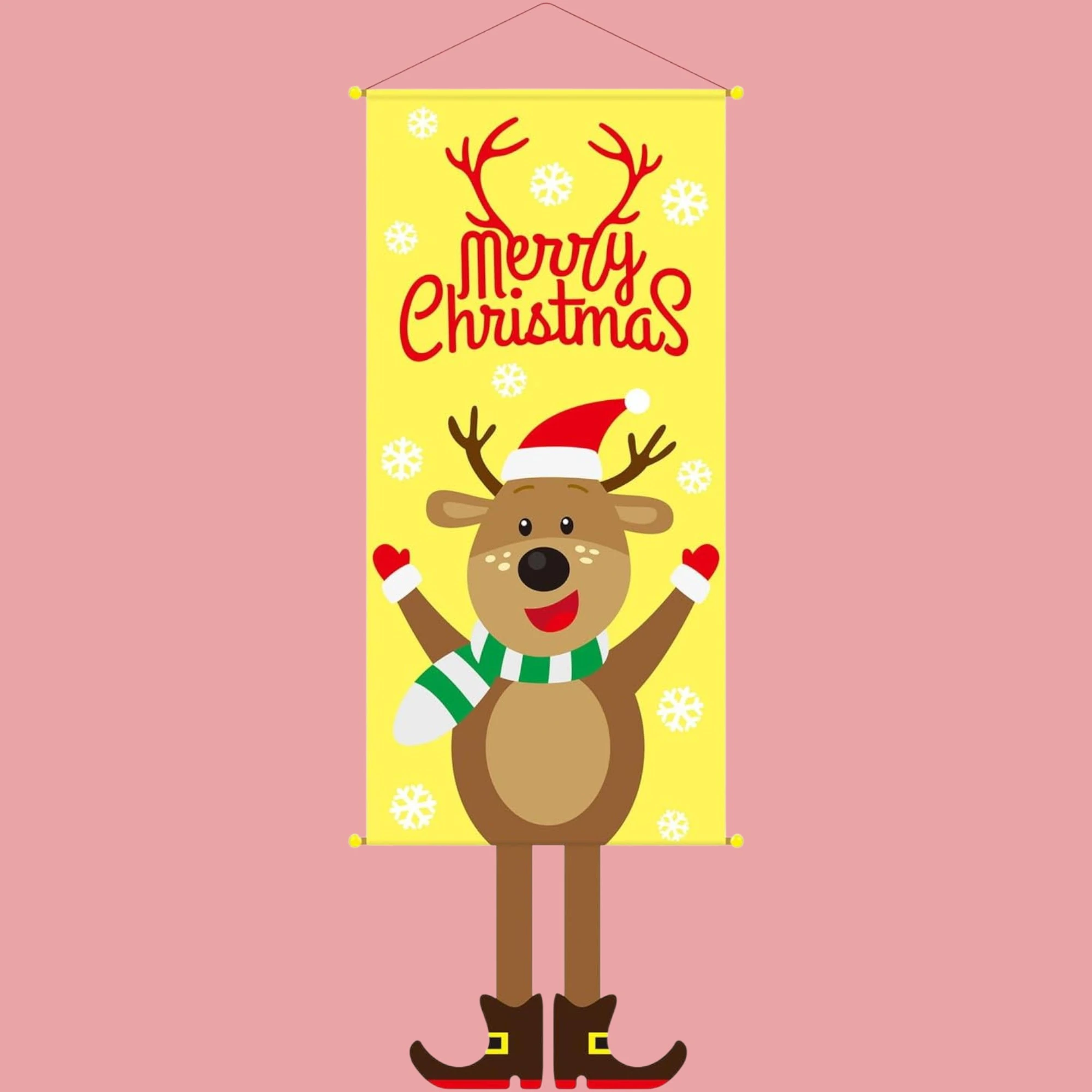 Brighten up your holiday season with a cheerful touch by adding this Merry Christmas Reindeer Yellow Porch Banner to your home decor. This lively banner is perfect for greeting guests at your door with its vibrant yellow color and playful reindeer design that captures the joyous spirit of Christmas.