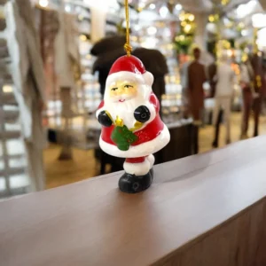 The image shows a festive Christmas ornament featuring a cheerful Santa Claus. The ornament is designed in the shape of a Christmas tree, adorned with green glitter. Santa Claus is depicted wearing his traditional red suit and hat, holding a small wrapped gift in his hand. Below Santa, there are three additional wrapped gifts in various colors and patterns. The ornament is hanging by a red string, and in the background, there are warm, glowing fairy lights, adding to the festive ambiance. This ornament is interesting and relevant as it captures the joyful spirit of Christmas and can be used to decorate a Christmas tree or home during the holiday season.