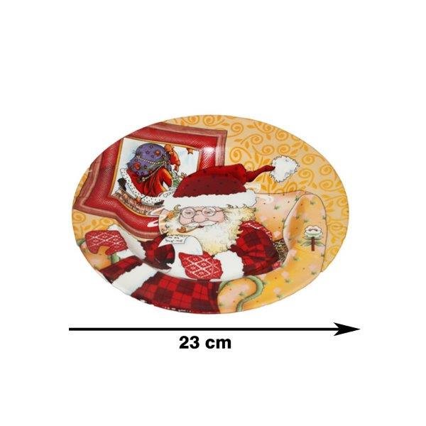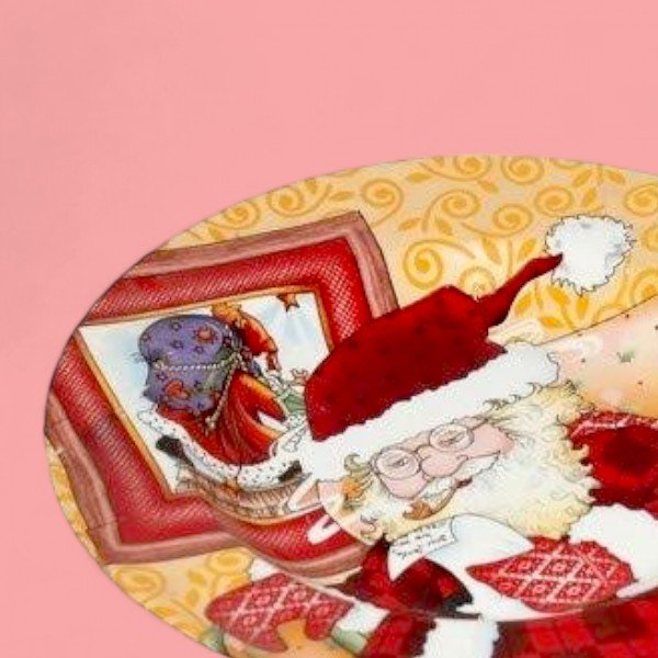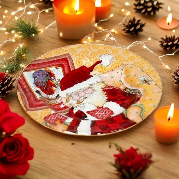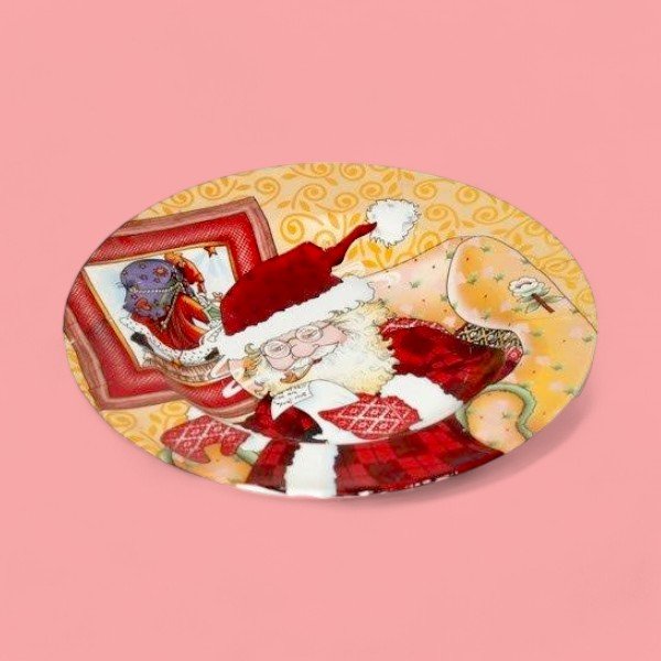 This image features a decorative plate with a festive design. The plate showcases a cheerful Santa Claus dressed in a red and white outfit, complete with a Santa hat. Santa is depicted holding a picture frame with a whimsical illustration inside. The background of the plate is adorned with a yellow and gold swirling pattern, adding to the festive and joyful theme. This plate is perfect for holiday decorations or as a collectible item for those who love Christmas-themed decor.