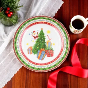 This decorative plate features a festive design with a prominent Santa Claus motif. The plate is circular with a light blue background. Santa Claus is depicted wearing his classic red hat adorned with holly leaves and berries. The plate also includes white snowflakes and a green Christmas tree, adding to the holiday theme. This plate is perfect for adding a touch of Christmas cheer to any home decor during the holiday season.